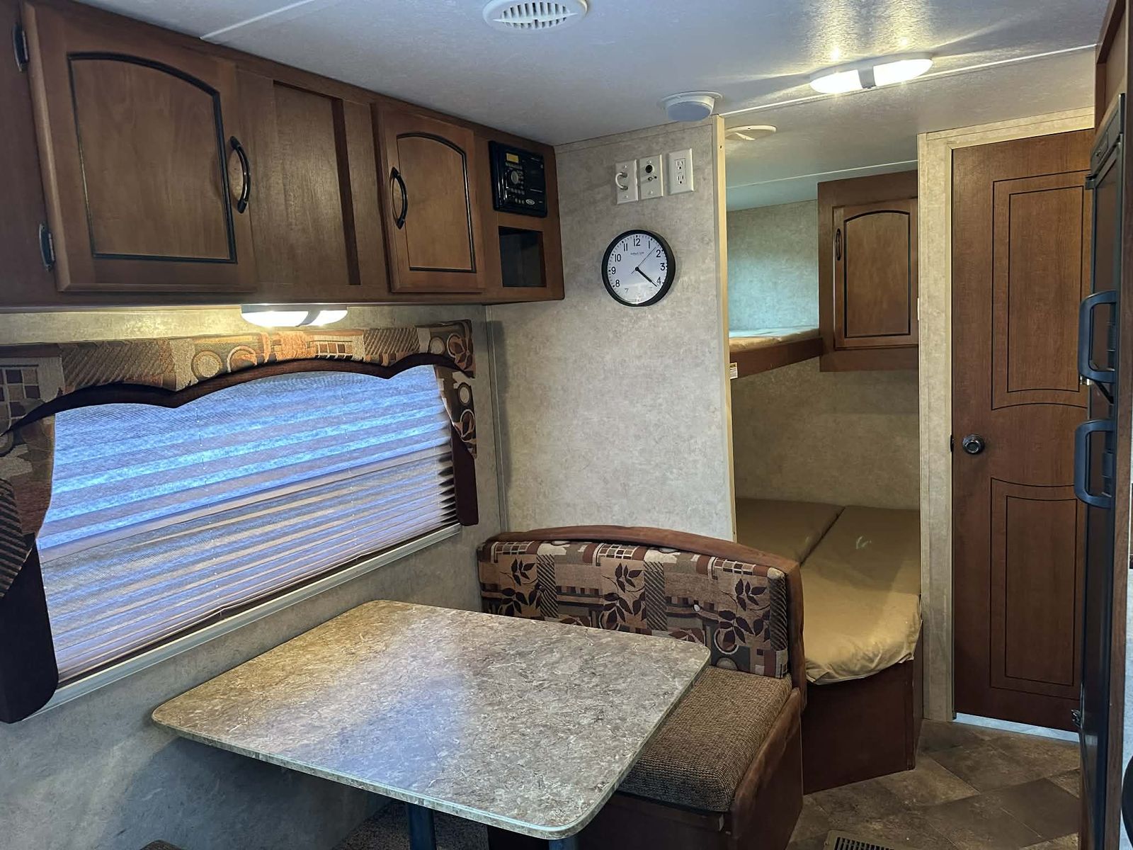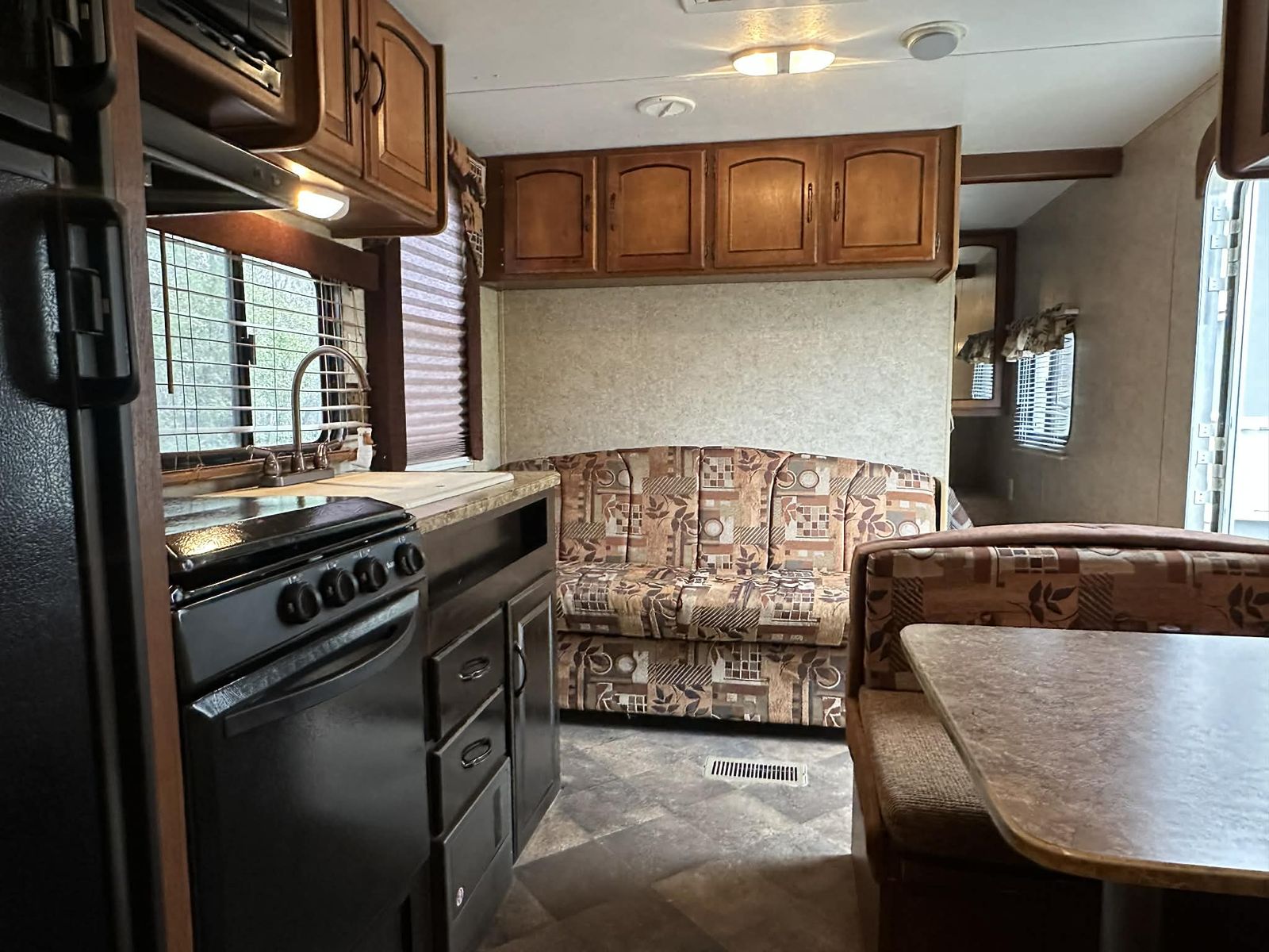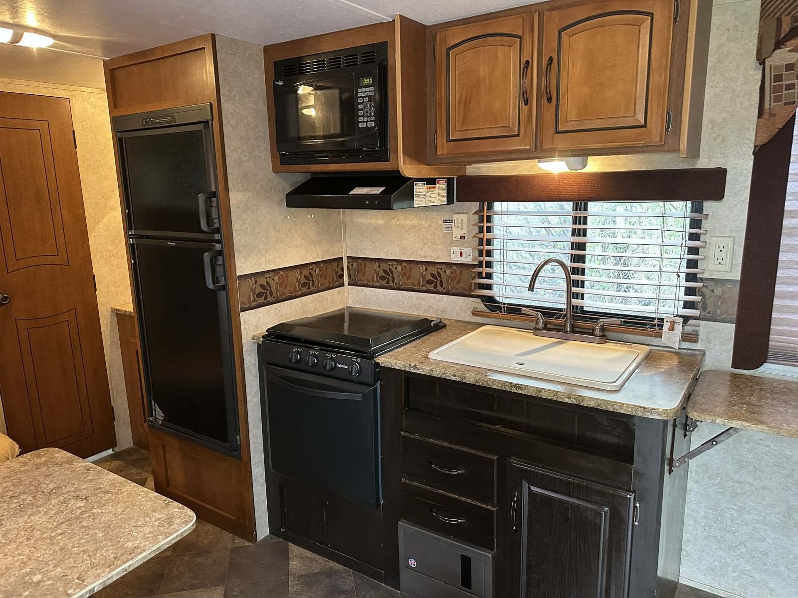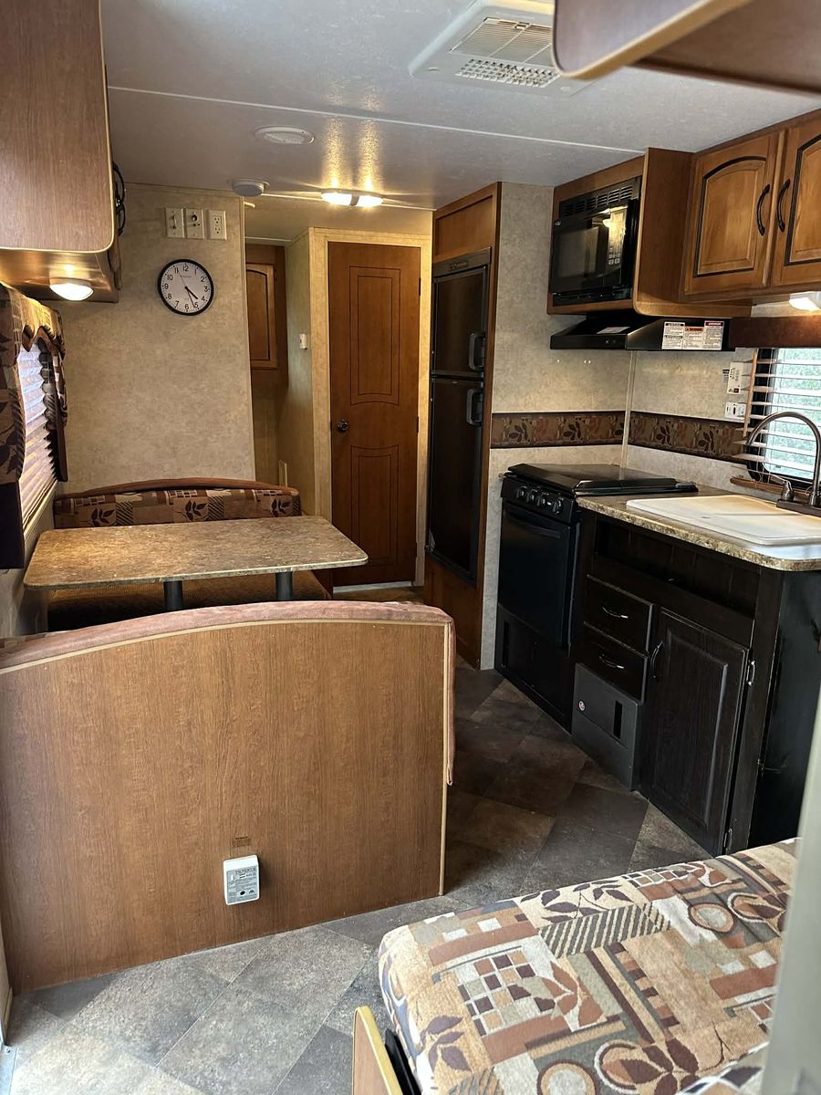 Kitchen Consists of Three Burner Stove With Oven, Microwave, Fullsized Refrigerator/Freezer, Sink, Kitchen Dinette That Converts Into Additional Bed; Cabinet storage Above and Below.