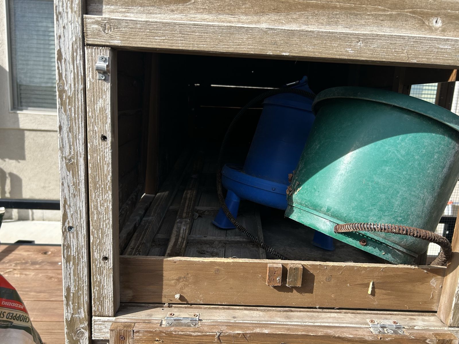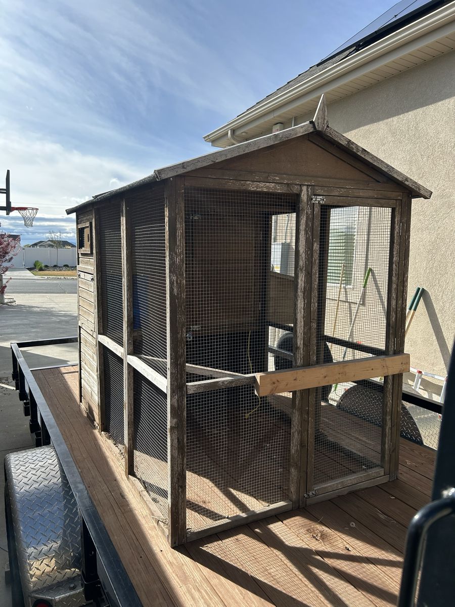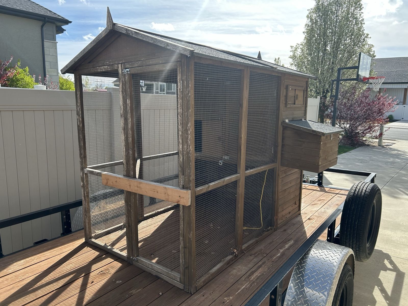 Venmo4 x 6 chicken coop with two laying boxes. Two years old still in pretty good shape will come with heat lamp, chicken feeder, and heated water bucket. Also have a little bit of nesting straw. Fits three chickens comfortably, I had four at one time. It’s already on my flatbed trailer so if you’re close to me, I can deliver.