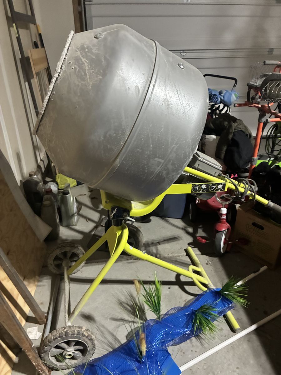 ZelleNew-ish concrete mixer. Used once for a 3 day job. It mixes 5 cubic fee at one time and has a lever release to dump the concrete without lifting the whole contraption off the ground. It was super easy to use and I'm glad I had it for the job.