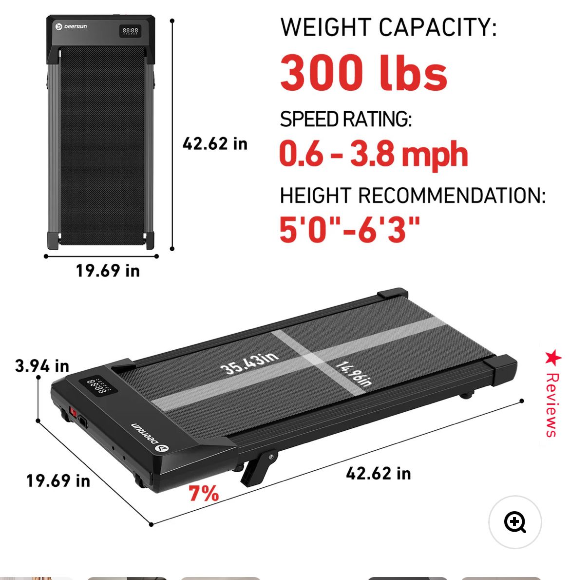 7% Incline, bluetooth wireless control Compact Design Small Office & Home Friendly 300 lbs Capacity 1-year warranty 60-day risk free trial Replaceable Screws and Lubricant Remote Control | 0.6-3.8 mph Weight: 35 lbs | 42.62"D x 19.69"W x 3.94"H