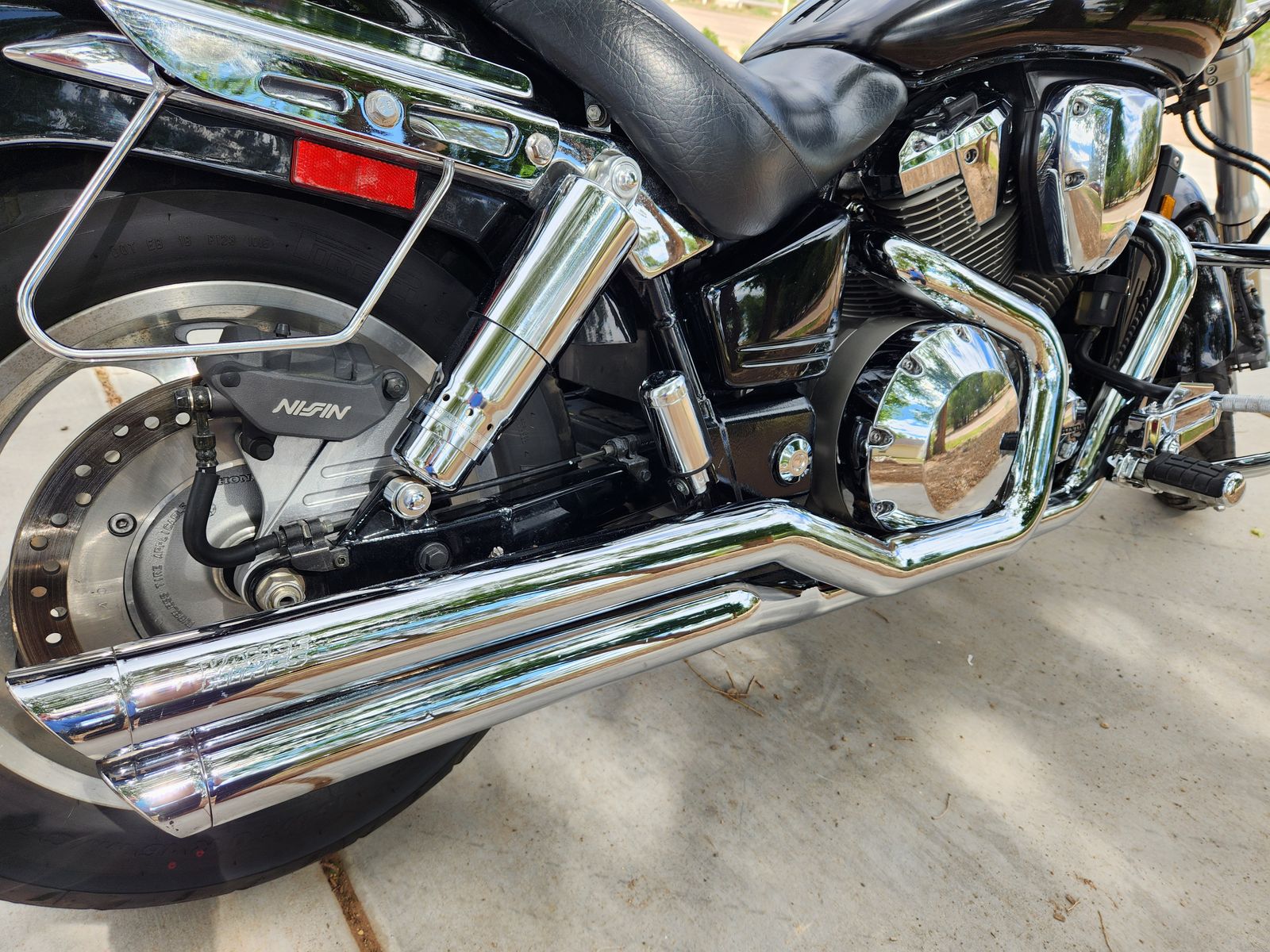 Vance & Hines exhaust system. Slipstreamer 17 inch windshield, Baron Custom chrome engine guard, chrome passenger backrest. Pirelli Night Dragon tires. Shaft drive. Hydraulic clutch. Three-piston, front/rear integrated hydraulic brakes. Dual front discs.