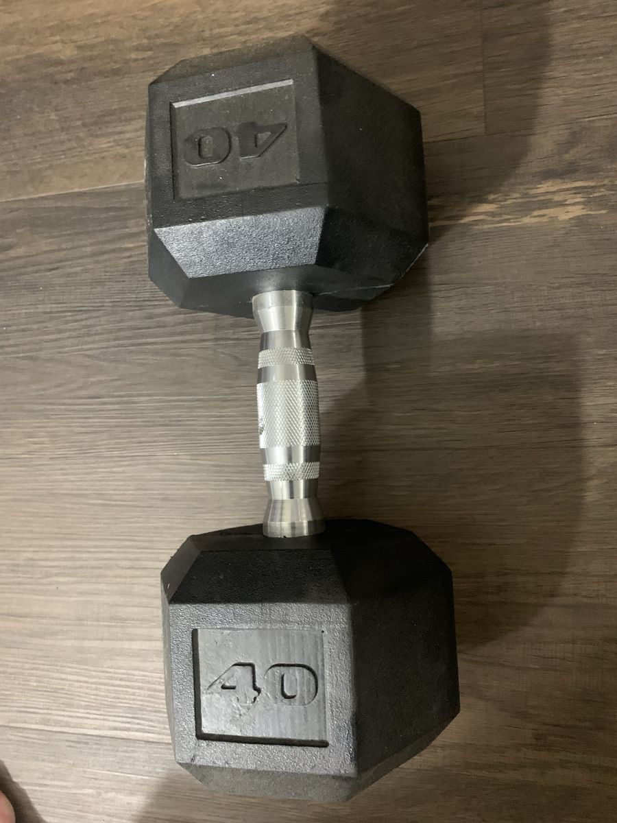 40 pound rubber hex dumbbell. Purchased last year for $45. $20 cash only. Message if interested.