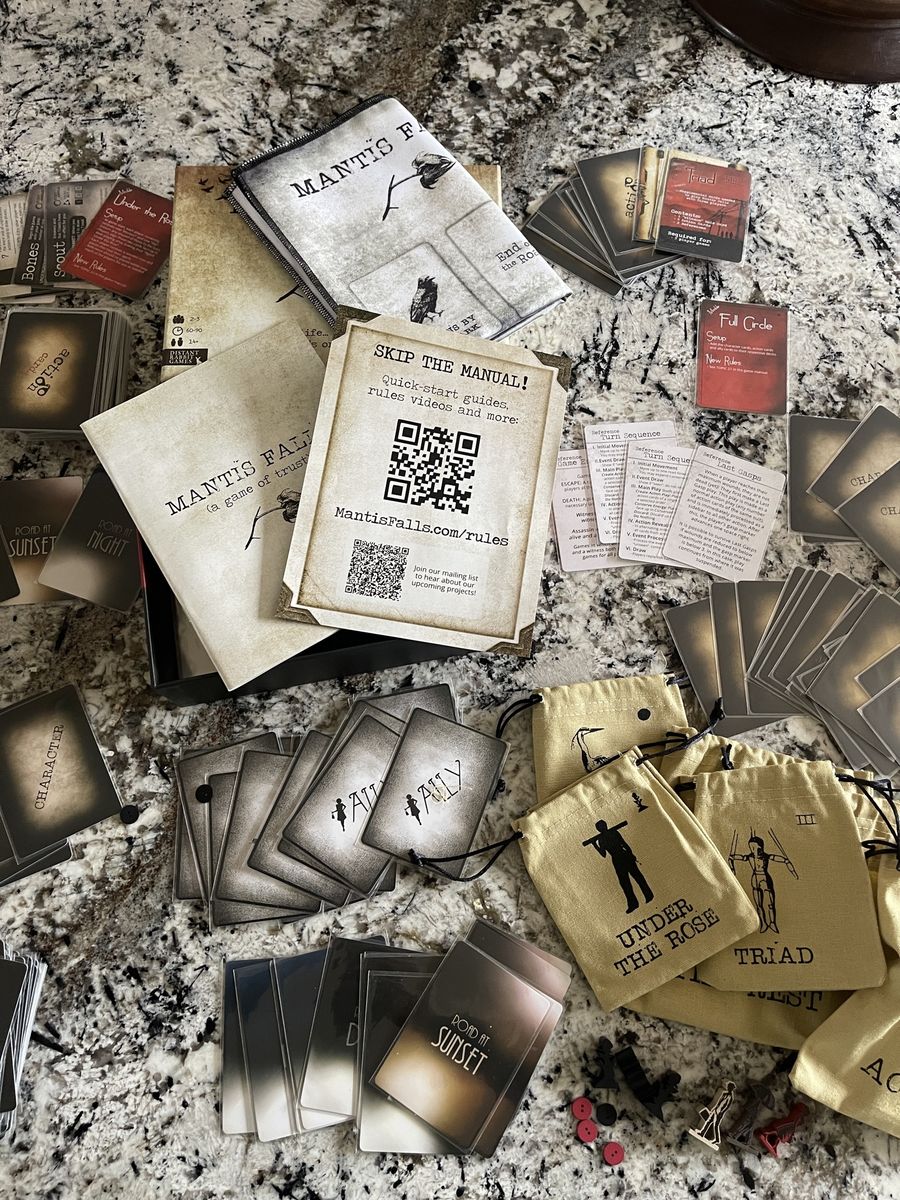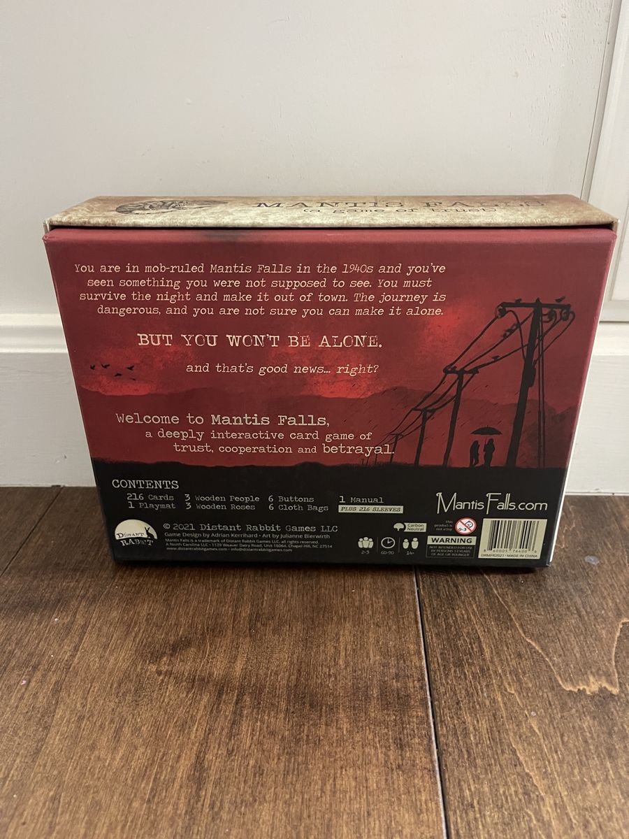 PayPalCool game called Mantis Falls: A Game of Trust. The cards are in sleeve protectors. It’s missing two action cards, which are not necessary to play the game. Really nice!