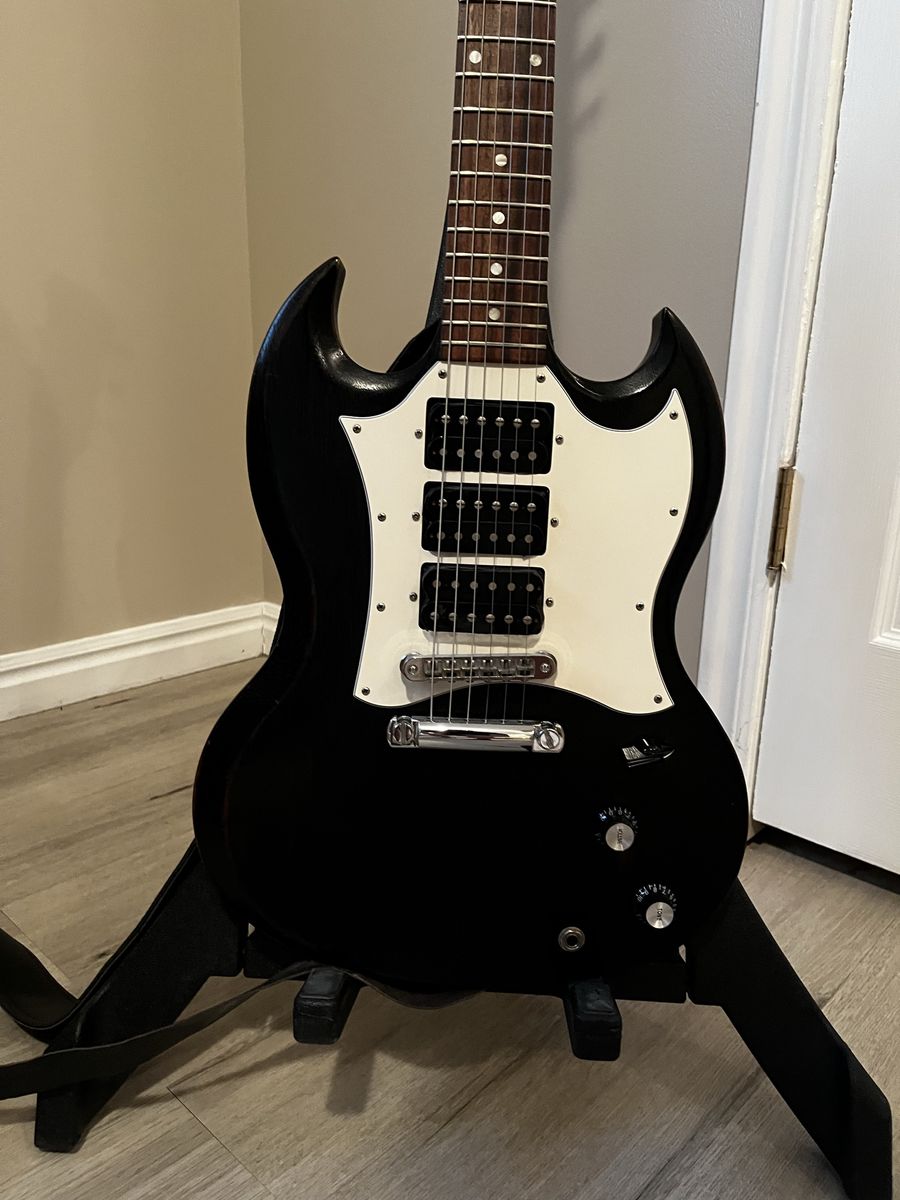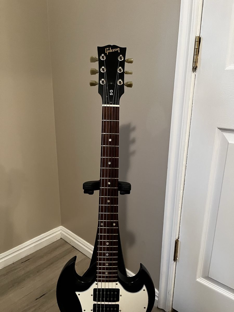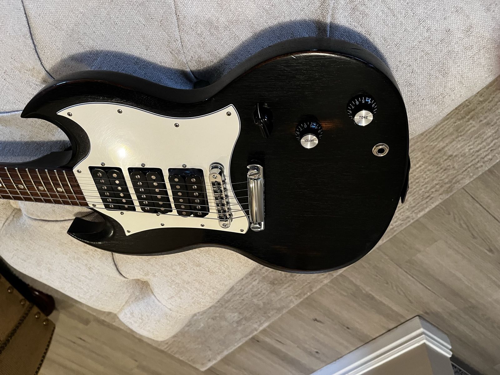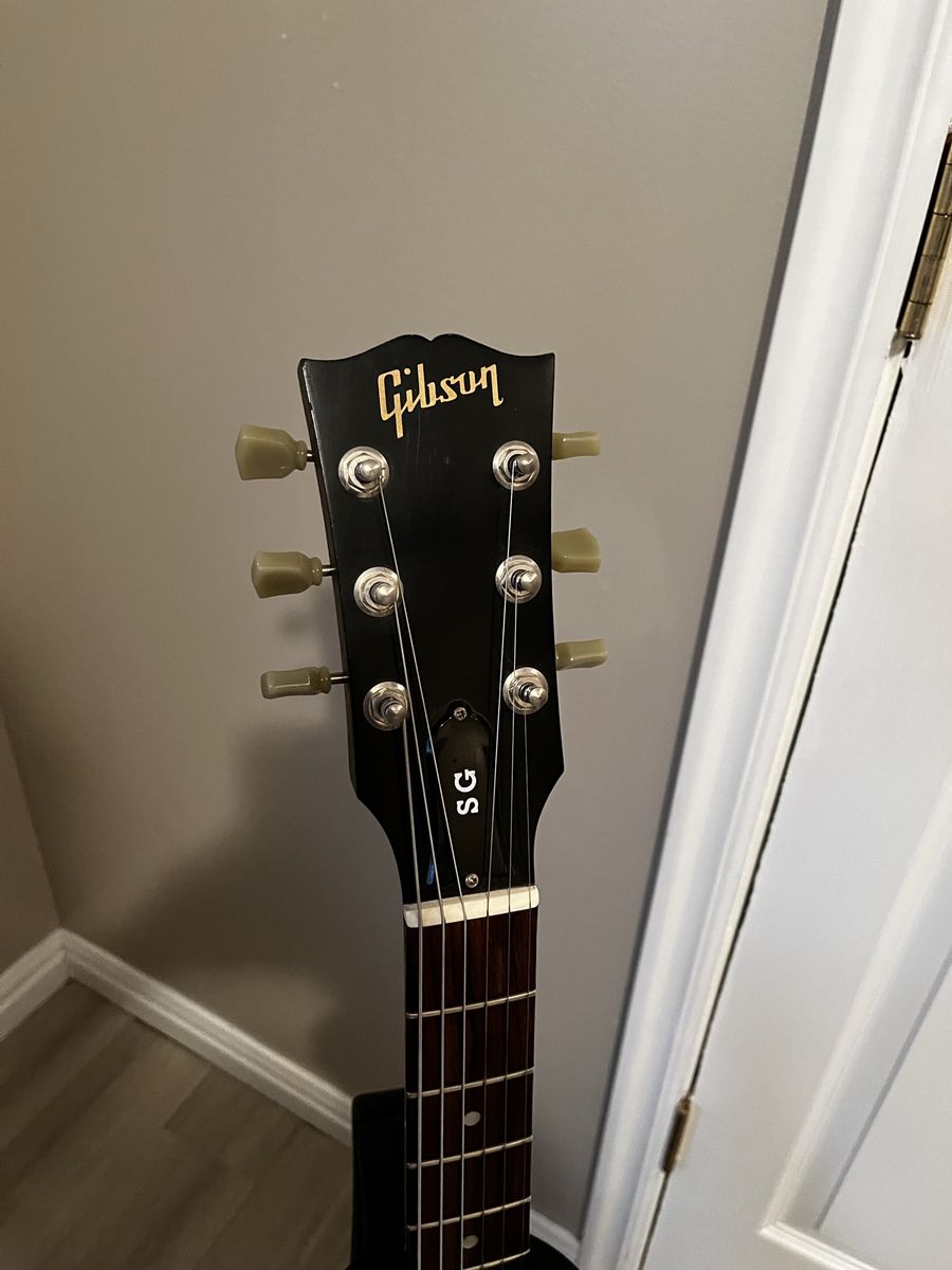 Excellent condition Gibson SG with three burst bucker pro pick ups. The chicken head knob give six different configurations, including coil splits.