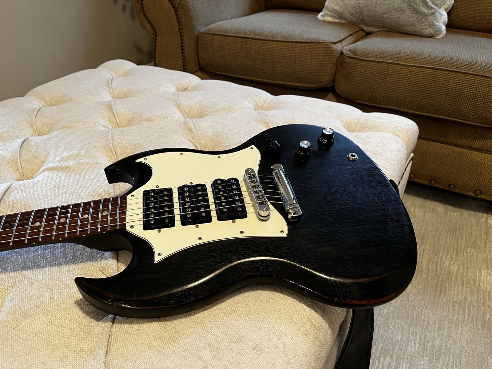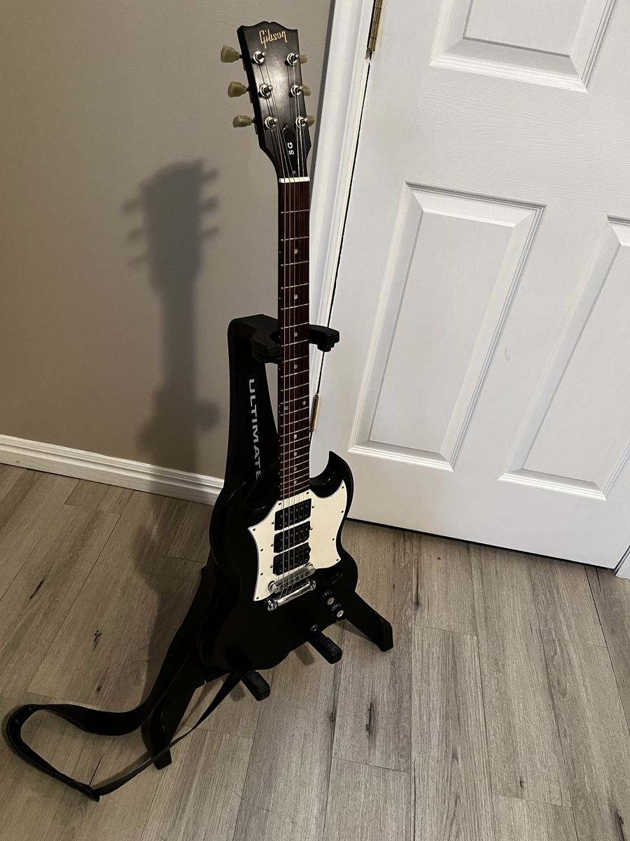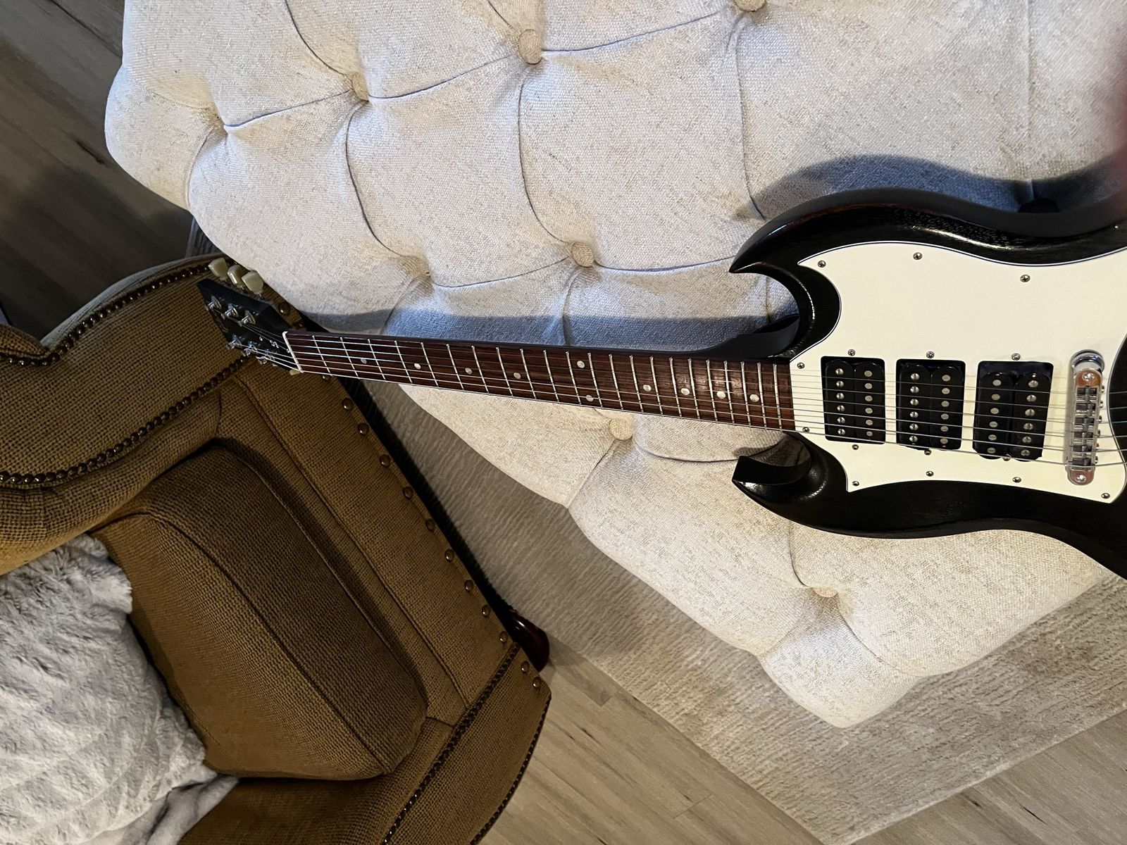 Excellent condition Gibson SG with three burst bucker pro pick ups. The chicken head knob give six different configurations, including coil splits.
