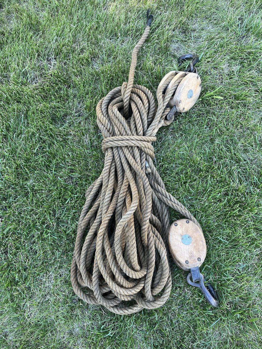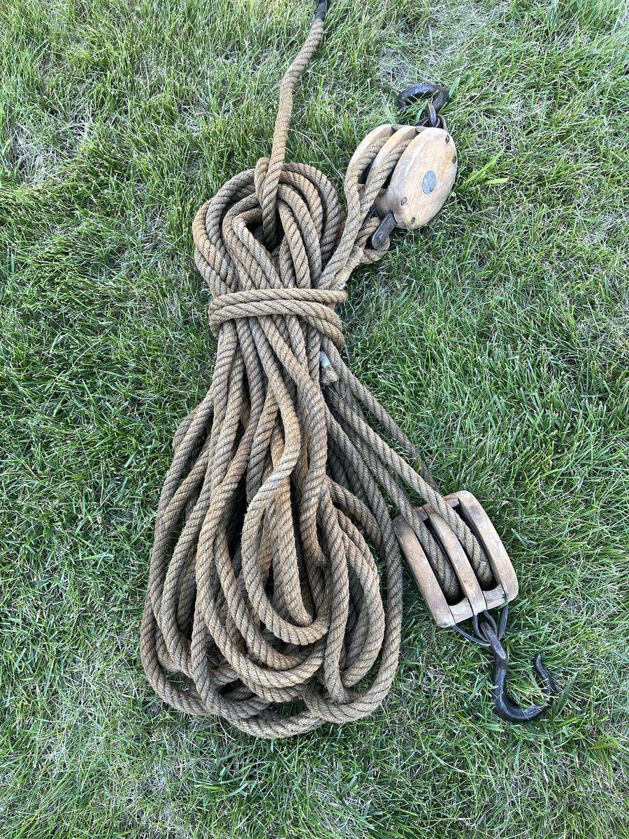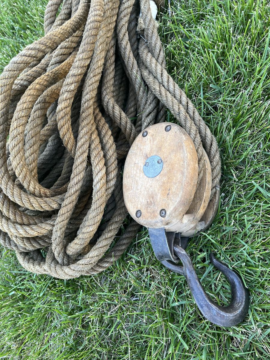 VenmoThis is a really fun barn find. A must have for collectors and hobbiests alike. This is a versatile tool that can handle a variety of tasks. It is a very large block and tackle. It offers durability and strength that is perfect for your needs. This has a classic design and craftmanship which was built to last. A real gem for a collector. It has 110 feet of 5/8 inch rope on it. Pulleys are wooden and hooks are metal or iron. This was made in Easton, PA., by Madesco Products. The wood part of the pulleys is 5 inches long x 4 inches wide x 4 inches deep. This is all original. It is in very good condition and would be a really unique display item for a resturant or hanging inside a rustic cabin. It also can be used. This is large and heavy, I will not ship. Serious inquiries only. Price is firm.