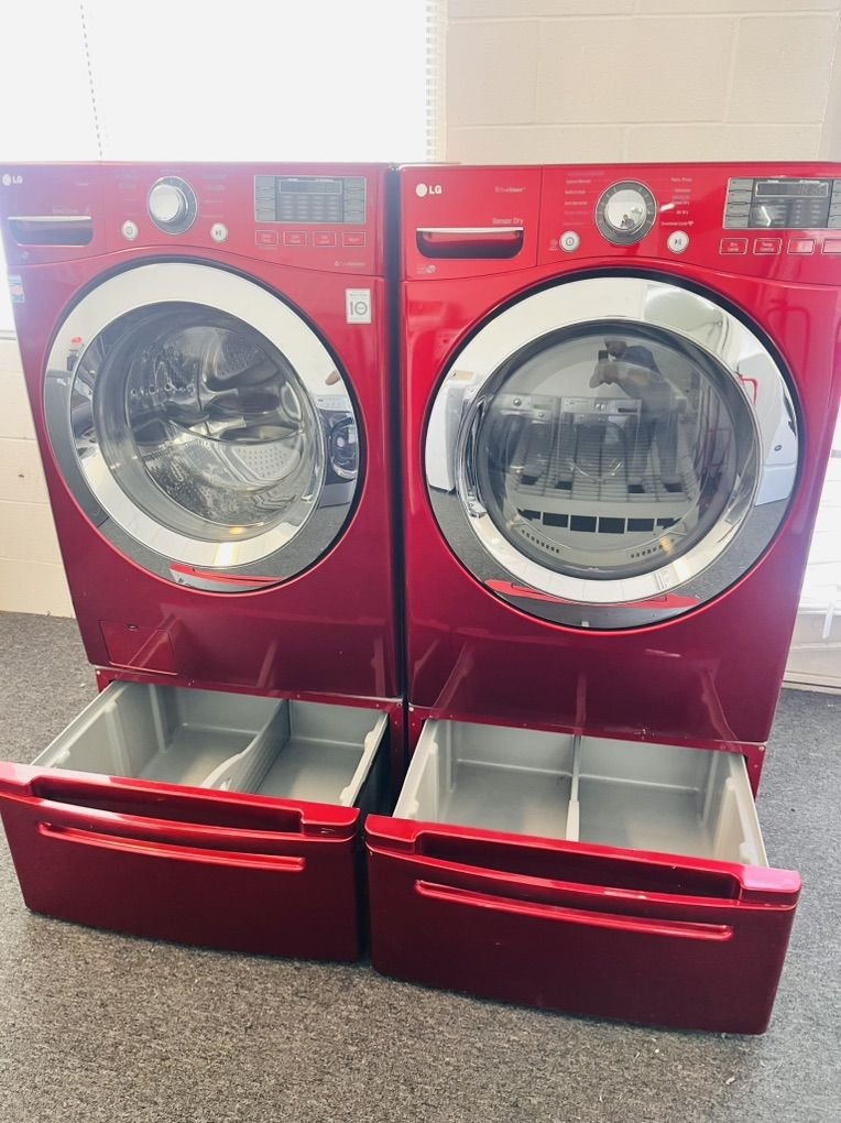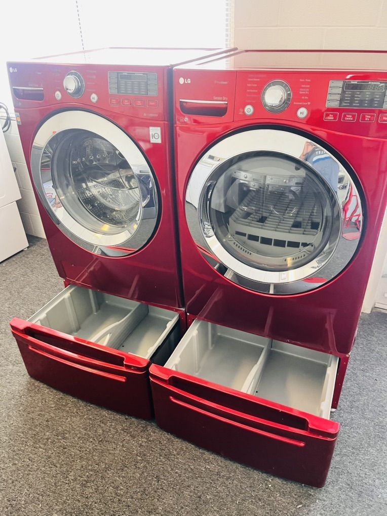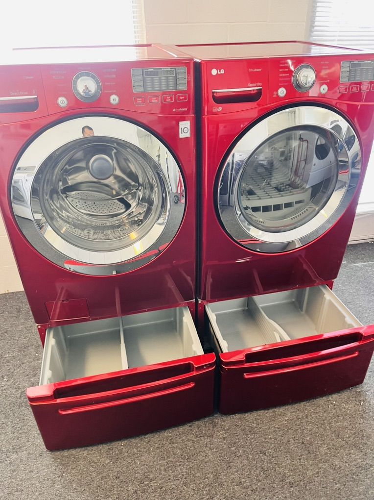 Very nice Lg washer and dryer set in excellent condition and super clean inside and out. The washer is 4.5 cu ft with optional steam wash as well as bulky/large, speed wash, delicates and many more options, the dryer is electric 7.4 cu ft stainless steel drum With steam refresh option to remove wrinkles and freshen up your load with steam, it’s optional but it’s there if you want to save yourself the hassle of ironing it also includes a removable drying rack for shoes, hats, etc. the come with 15” pedestal drawers for extra height and storage. Only $625 for the set. I can deliver and install for a little extra. 45 day warranty included. Call or text 8015403075