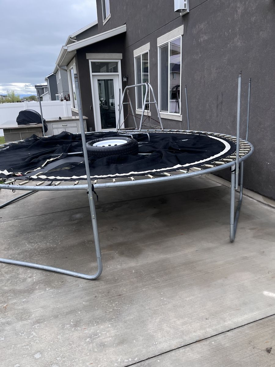 This is a good trampoline. it had a small hole on one side from 4th of July. the net works and has a ladder you can use for little kids. Come pick it up in American fork. it will be taken apart so you can transport it easy.