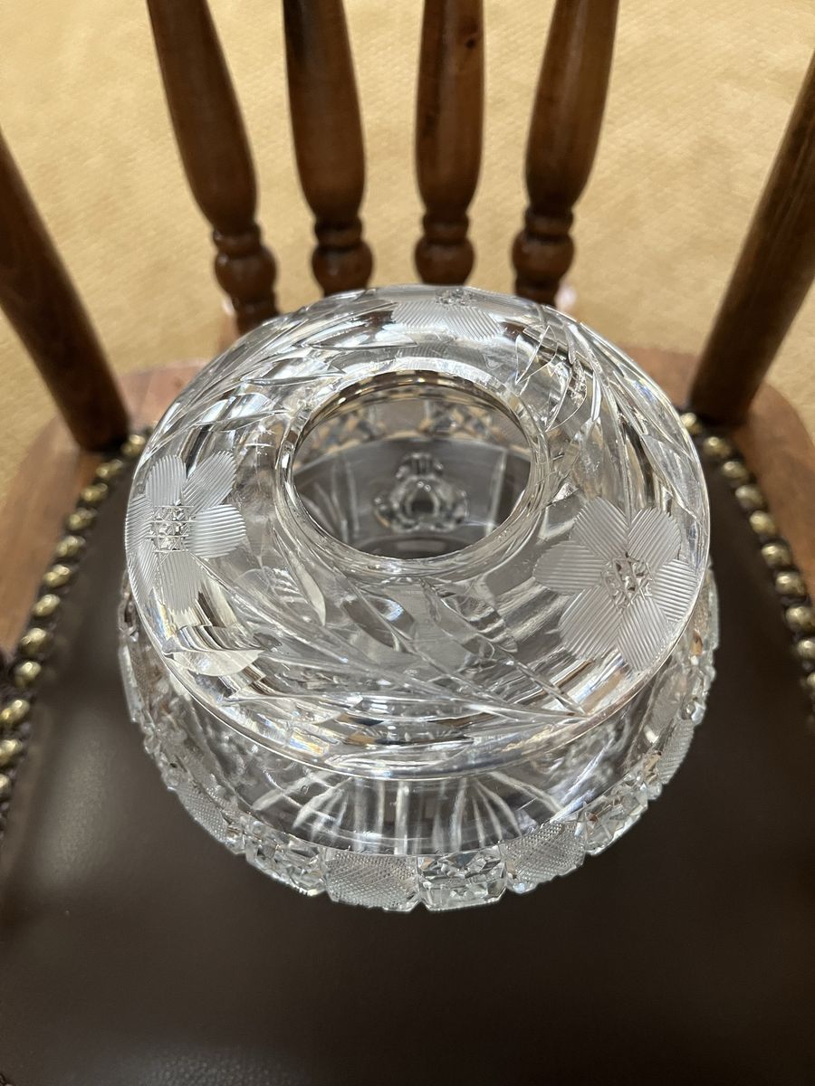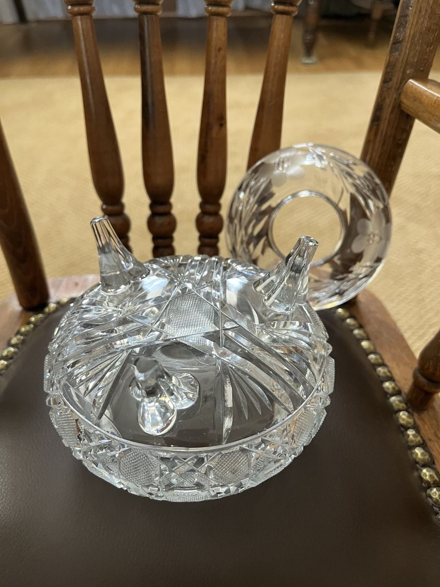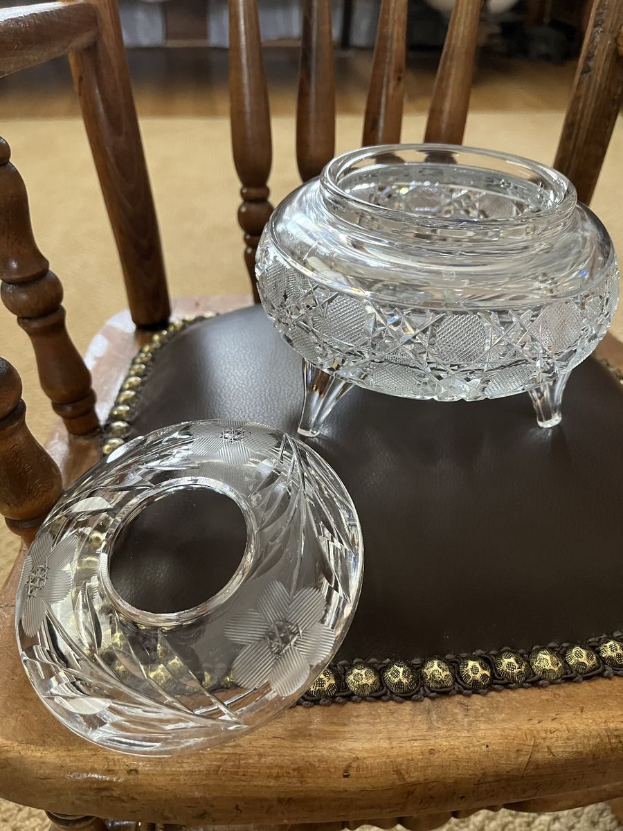 VenmoThis is in mint condition. It stands on three legs. The top does come off. This has a flower pattern etched into the glass. This is a heavy piece. It is a really stunning and unique piece. It is quite a high quality glass. This measures 4 1/4 inches tall and is 5 inches across. A must see piece. Selling for a parent. Price is firm.