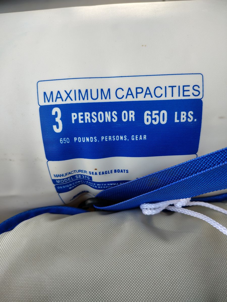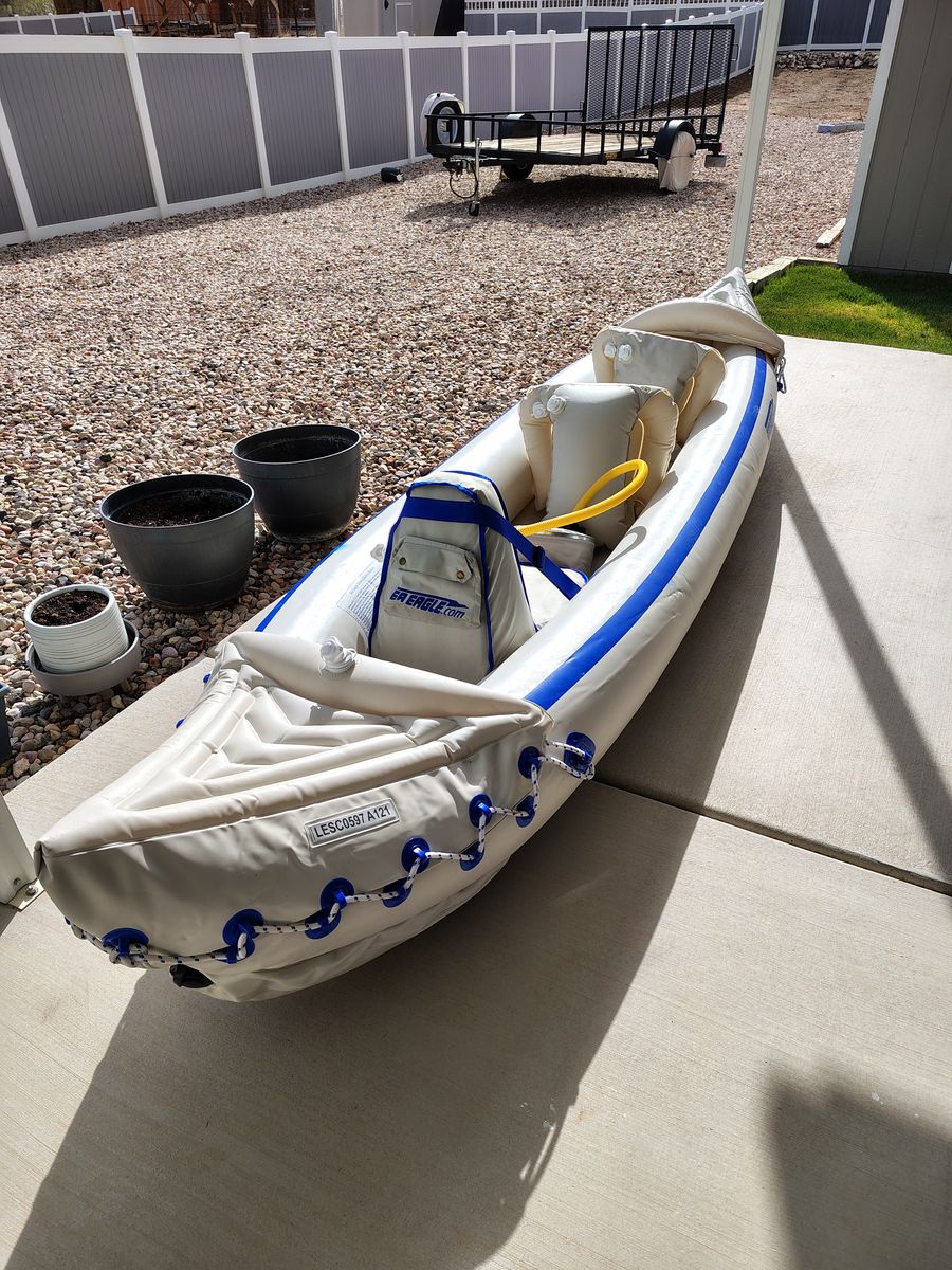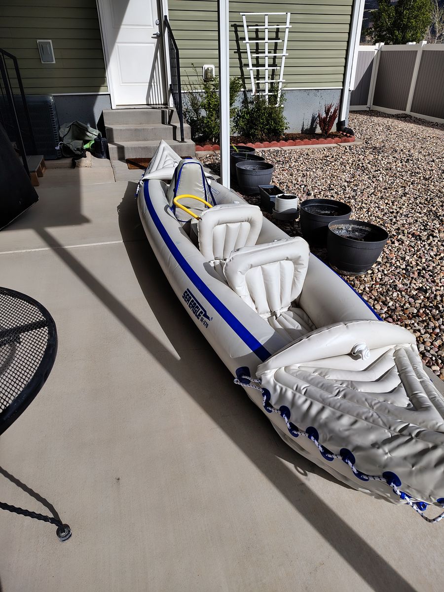 Inflatable Kayak. 3 person, 650 lbs limit. 12 ft in length. Weighs 32 lbs. Used only 3 times. Excellent condition.