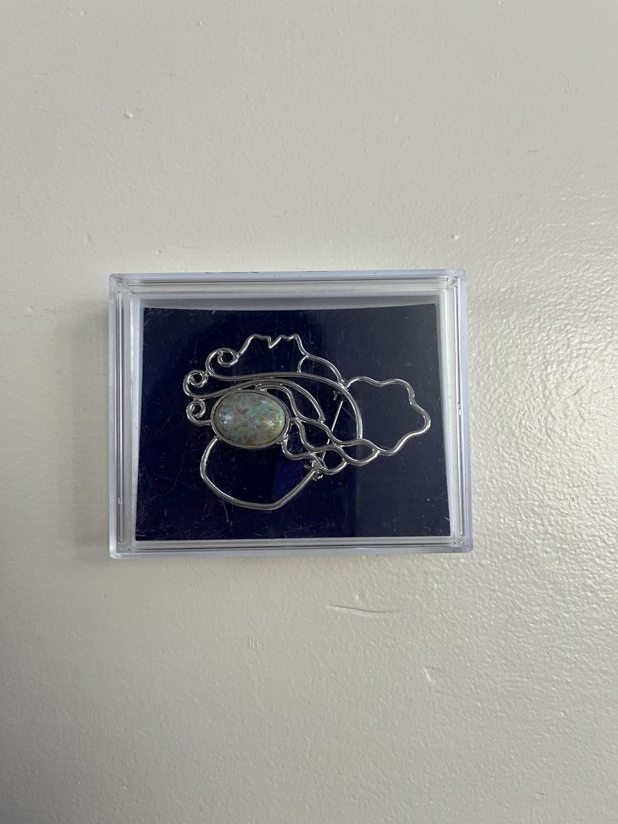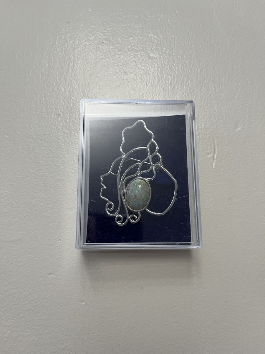 VenmoUnusual and stunning pin. This has a beautiful green stone in it. I love the face hidden in the design. It measures almost 2 1/2 inches tall x 1 3/4 inches wide. Pin comes with a case to keep it protected when not in use. Own something no one else will have. Price is firm.