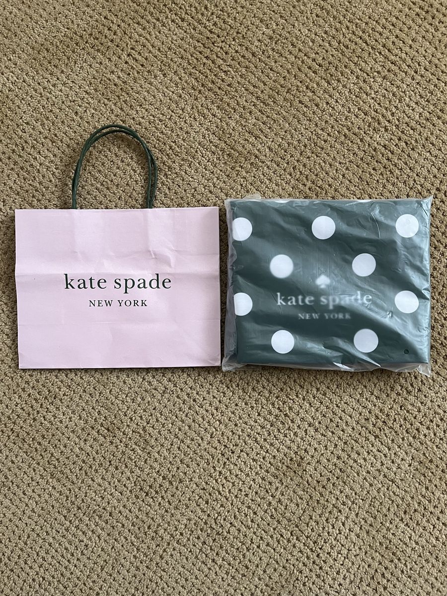 VenmoBrand new still in the bag. I only took it out only to take the pictures. If you love the emerald green color or polka dots. This is for you!. This says 'Kate Spade New York' on both sides. The bag is tapered. It gets a little bigger towards the bottom of the bag. The bag only, measures 15 inches tall x 24 inches across the top of the bag and 27 inches across the bottom of the bag. This even comes with the gift bag. Must See! Price is firm.