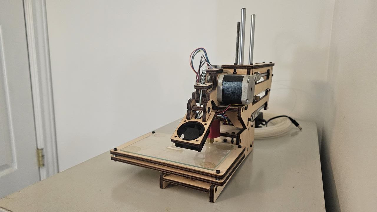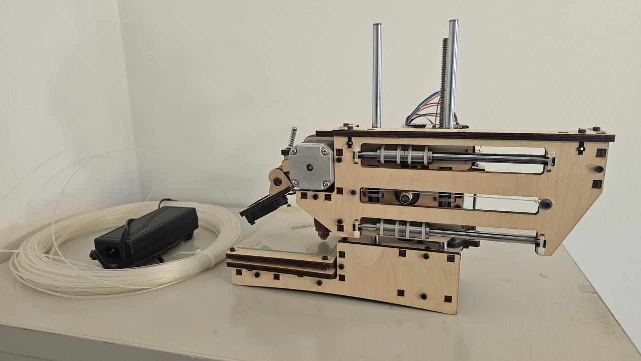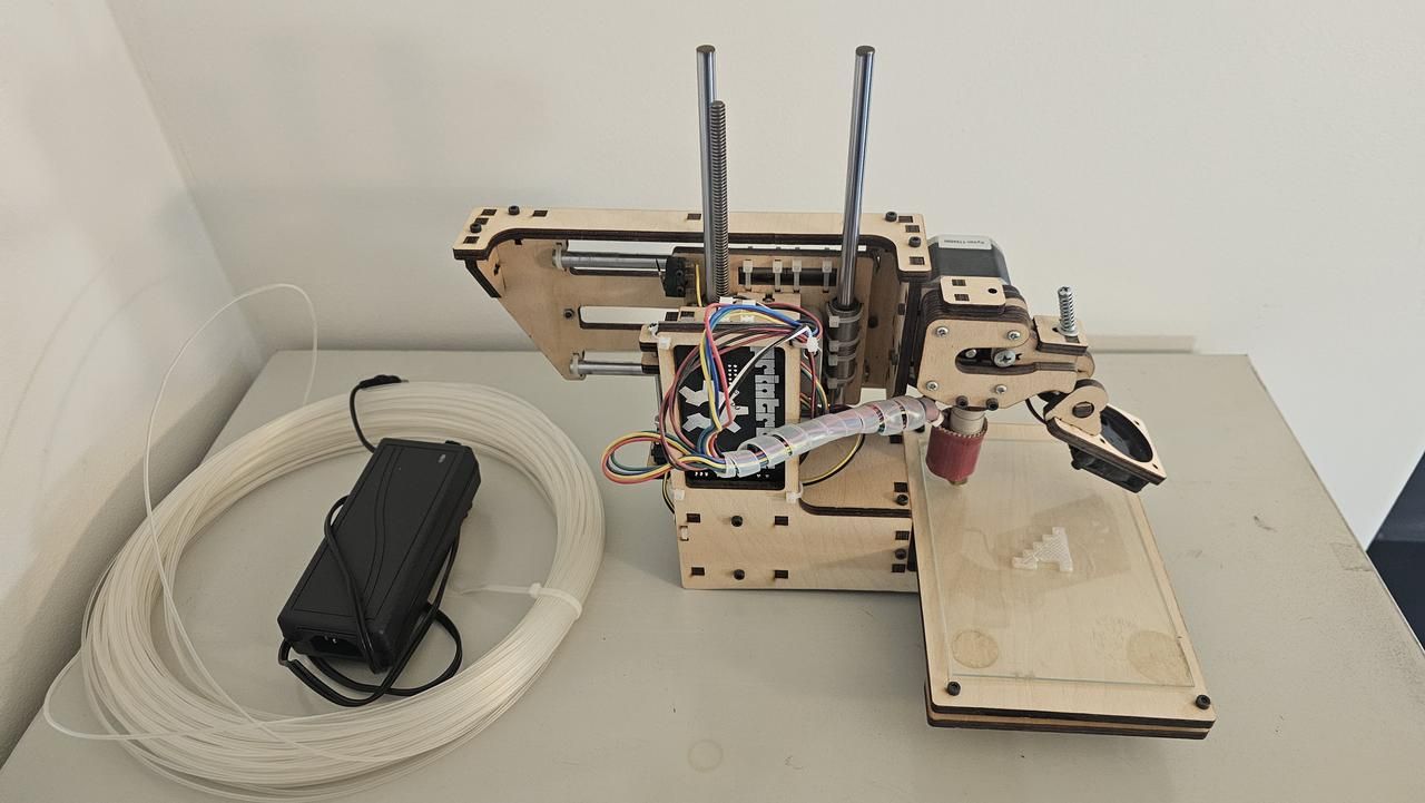 Pristine Wood Frame: Unlike most units from this era, the wood is not warped, stained by filament, or scorched by the hot end. The laser-etched "Printrbot" logo is crisp and clear. Original Hardware: Includes the iconic Ubis Hot End, the original Printrboard electronics, and the signature "fishing line" (Spectra line) drive system that defined Brook Drumm’s early designs. "Time Capsule" Status: This is a 100% stock build with only a glass printing plate added and one test piece printed to verify model was assembled and working correctly. This is exactly as it was when the Maker movement was at its peak (plus some dust). Mechanical Integrity: All axes move smoothly; the motors and belts show zero wear or degradation. History & Significance: