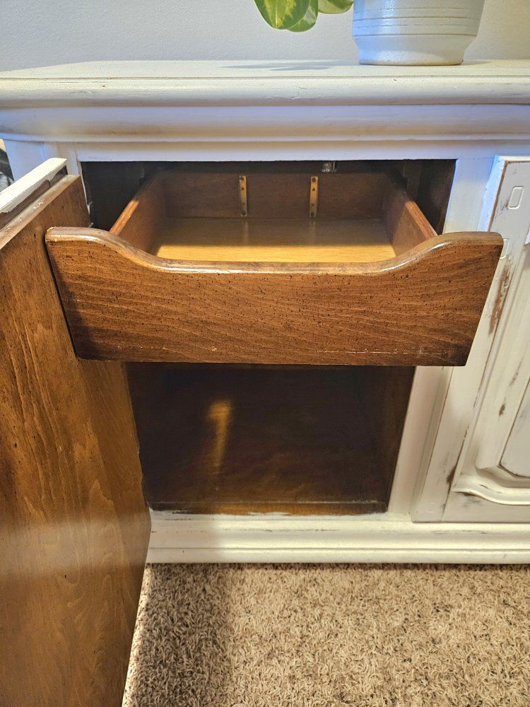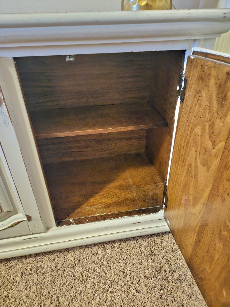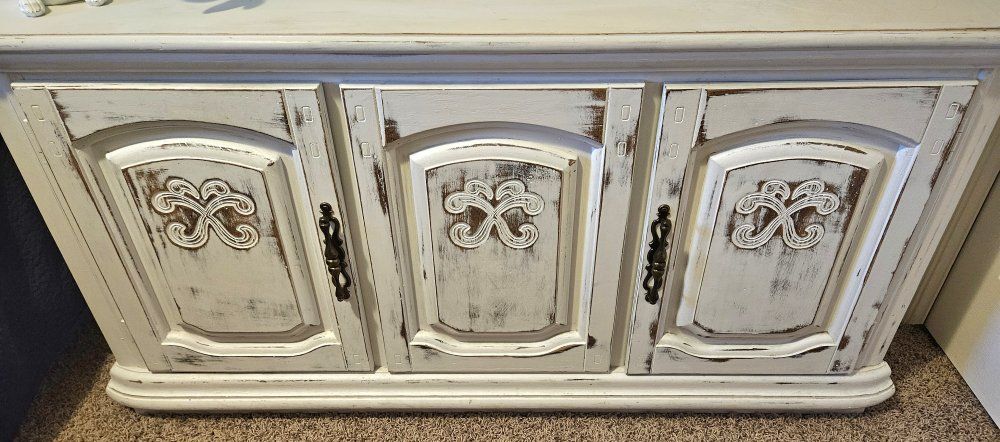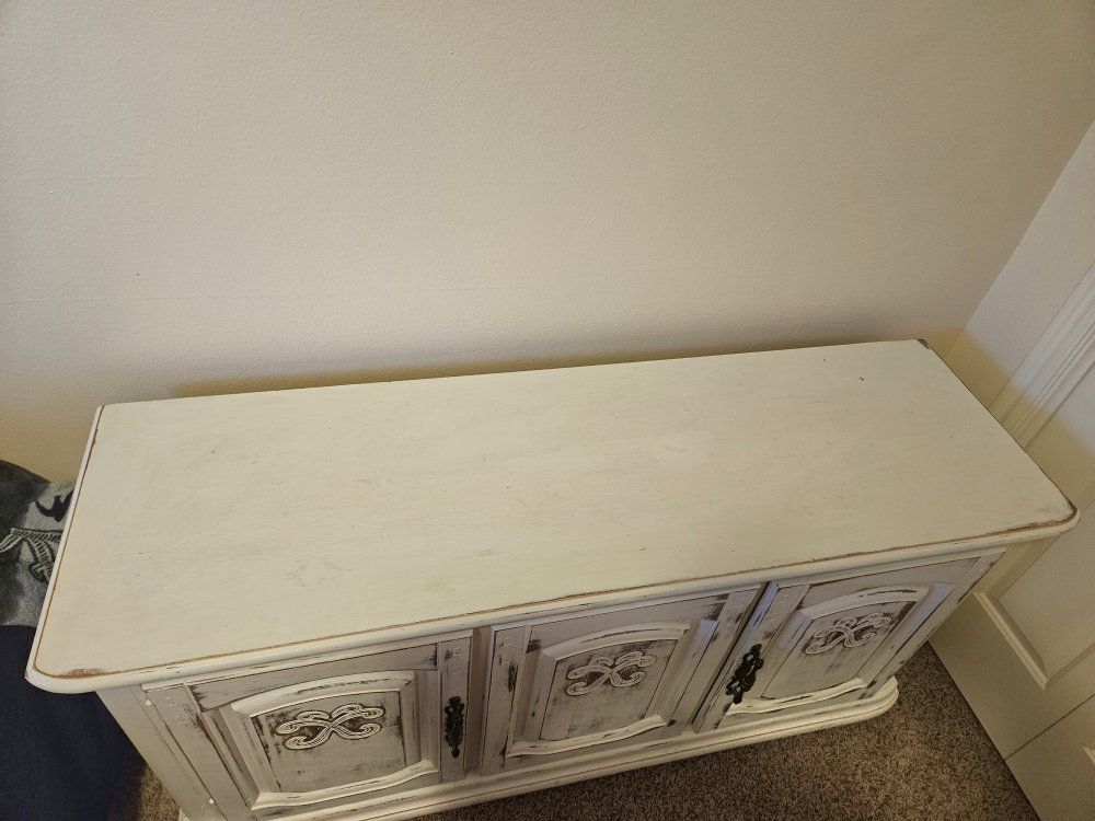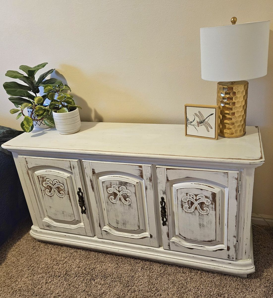 VenmoBeautiful farmhouse-style cabinet with a distressed white finish. Solid, sturdy piece that works great as a TV stand, entryway cabinet, or extra storage. Two side cabinets with interior shelving Unique center flip-down storage compartment Solid wood construction (not flimsy) Distressed finish gives it a rustic, vintage look Clean and ready for use Dimensions: 55” W x 17” D x 28” H Great size for living room, bedroom, or entryway. Condition: Good overall condition with intentional distressed finish. Some light wear consistent with use. Pickup in Santaquin.