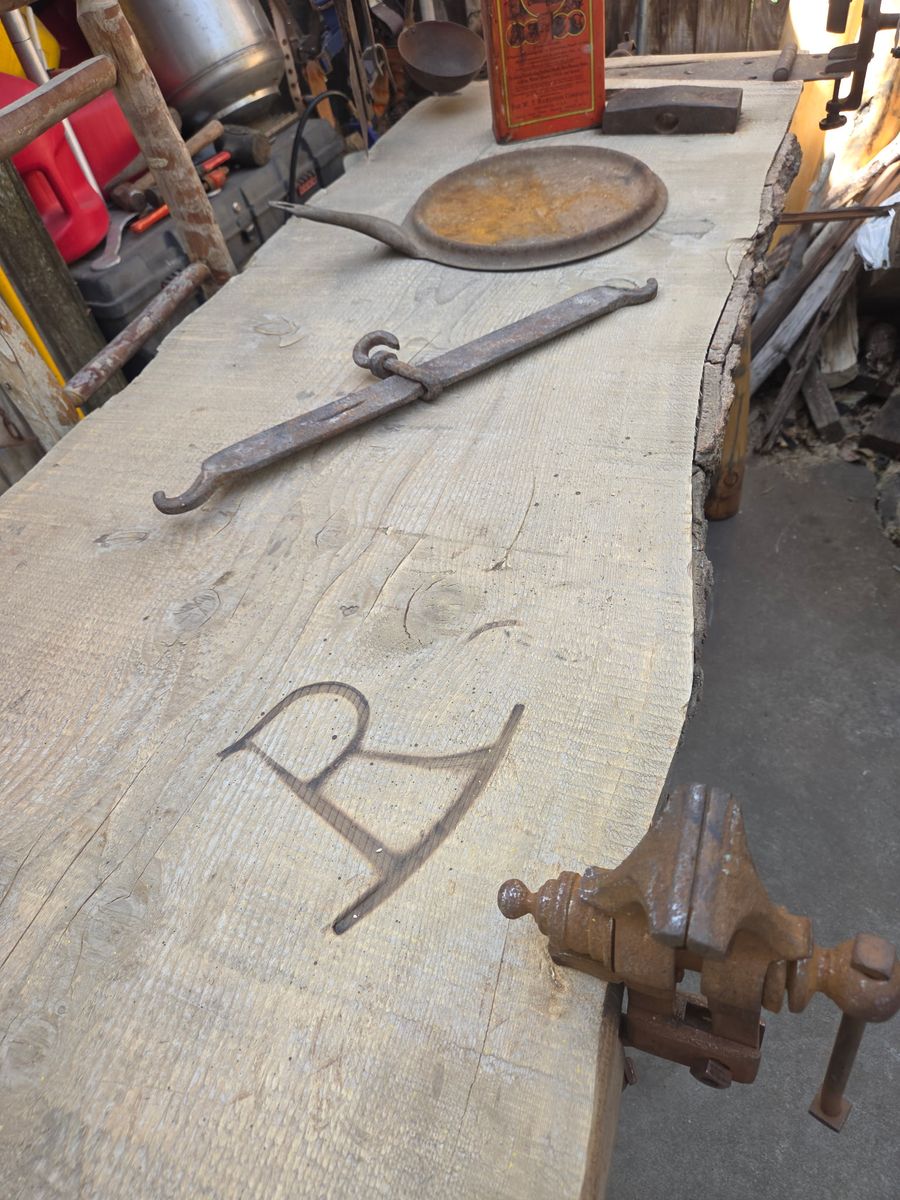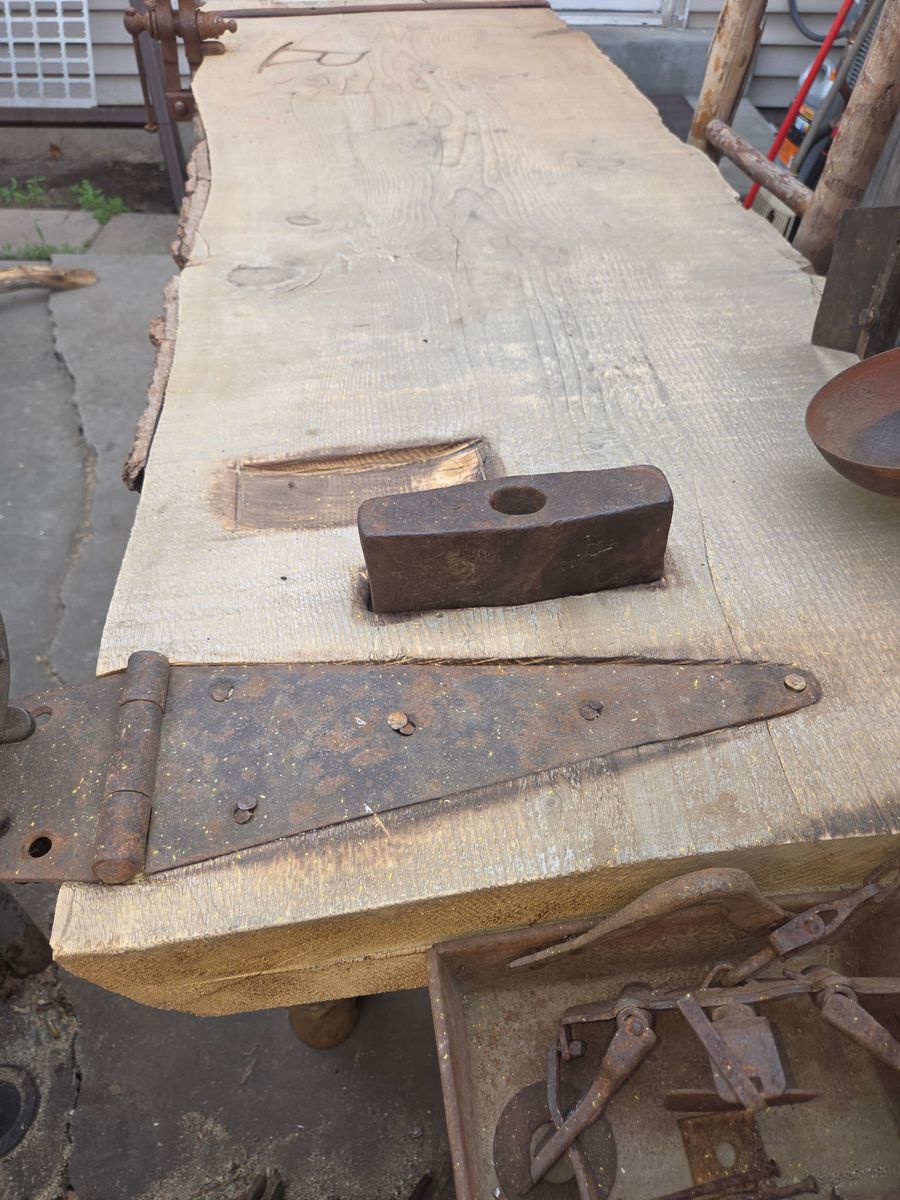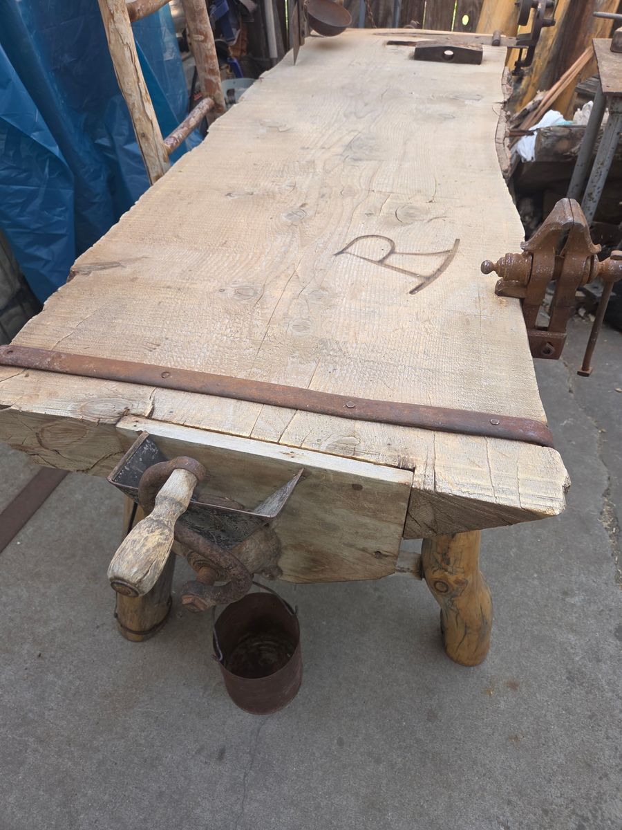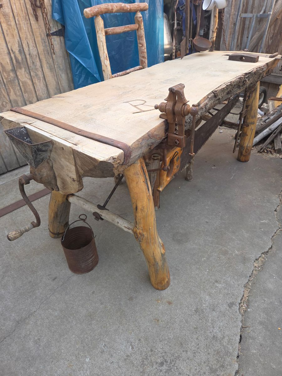 work table with various work tools made to the table very old from southern Utah. Has a ranch brand burned into the surface. Looks like rockin R? $700 firm location Provo Utah alternate phone number text only to 801-7240.