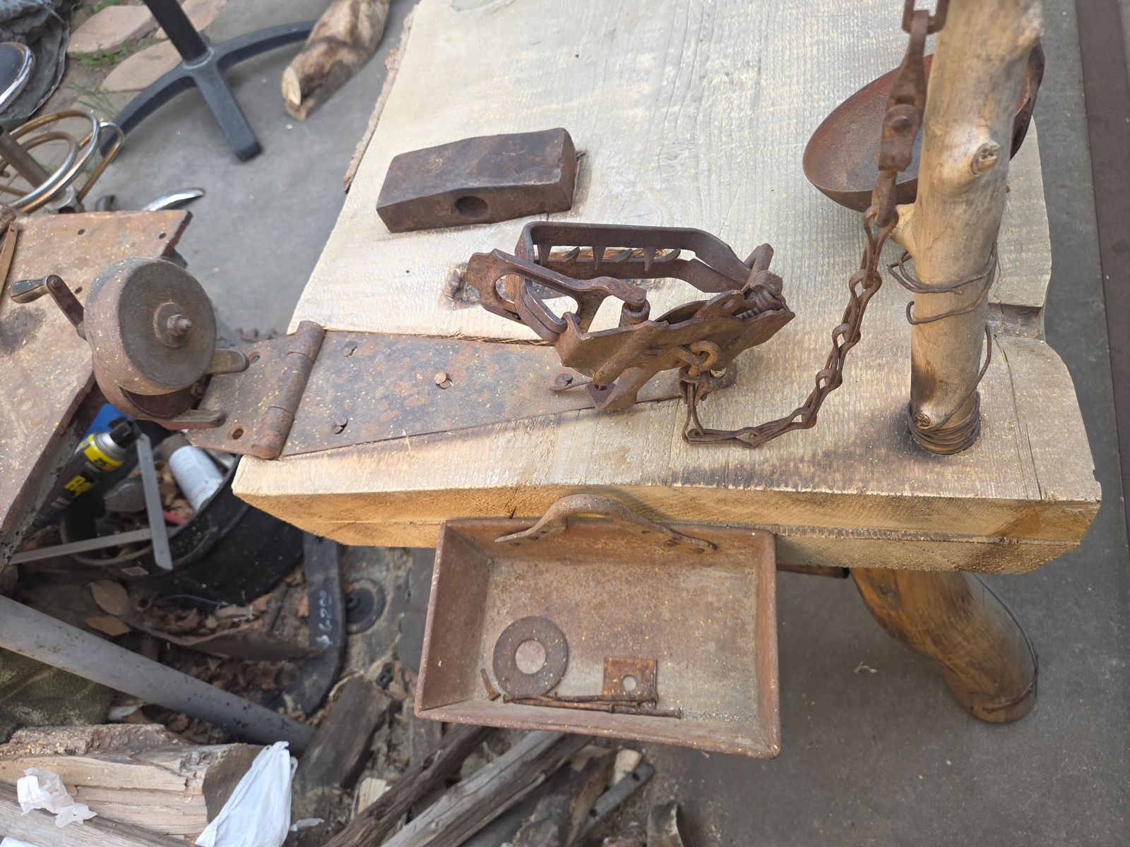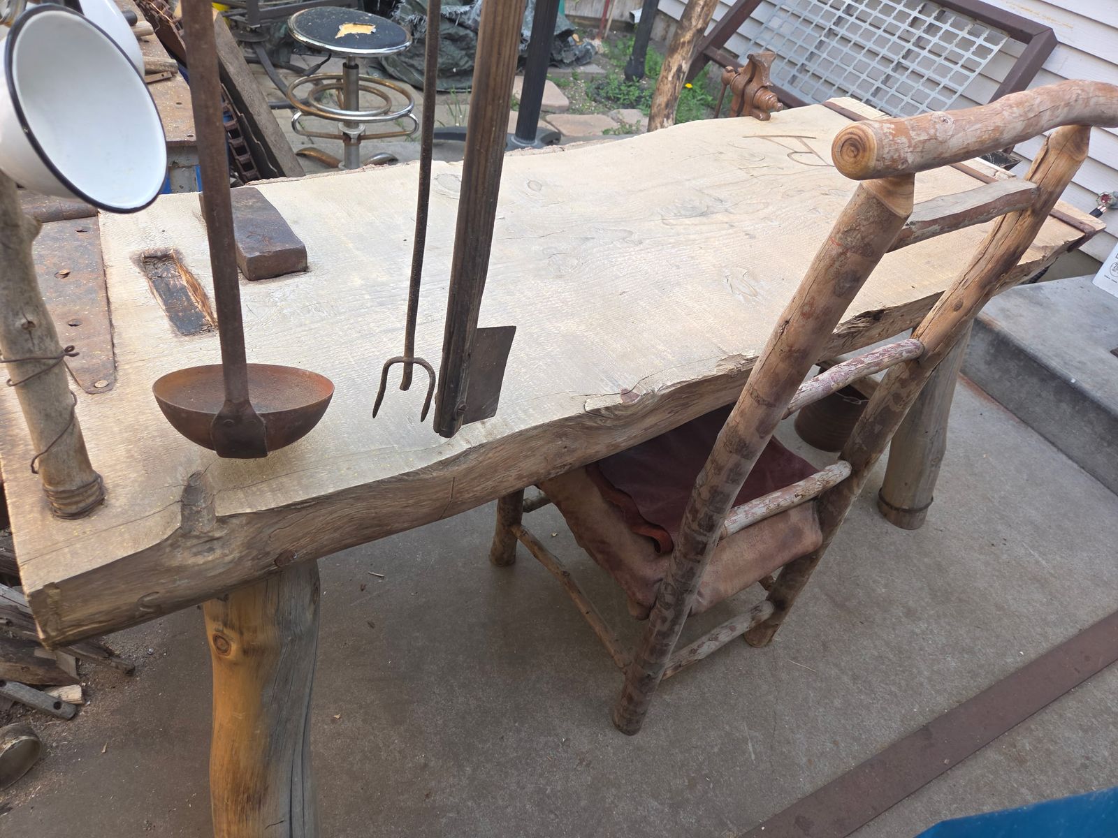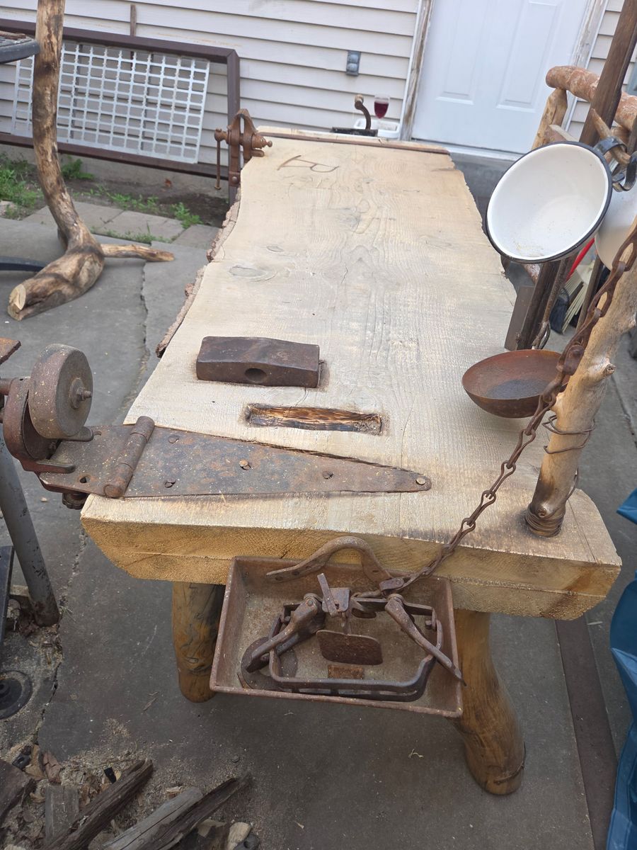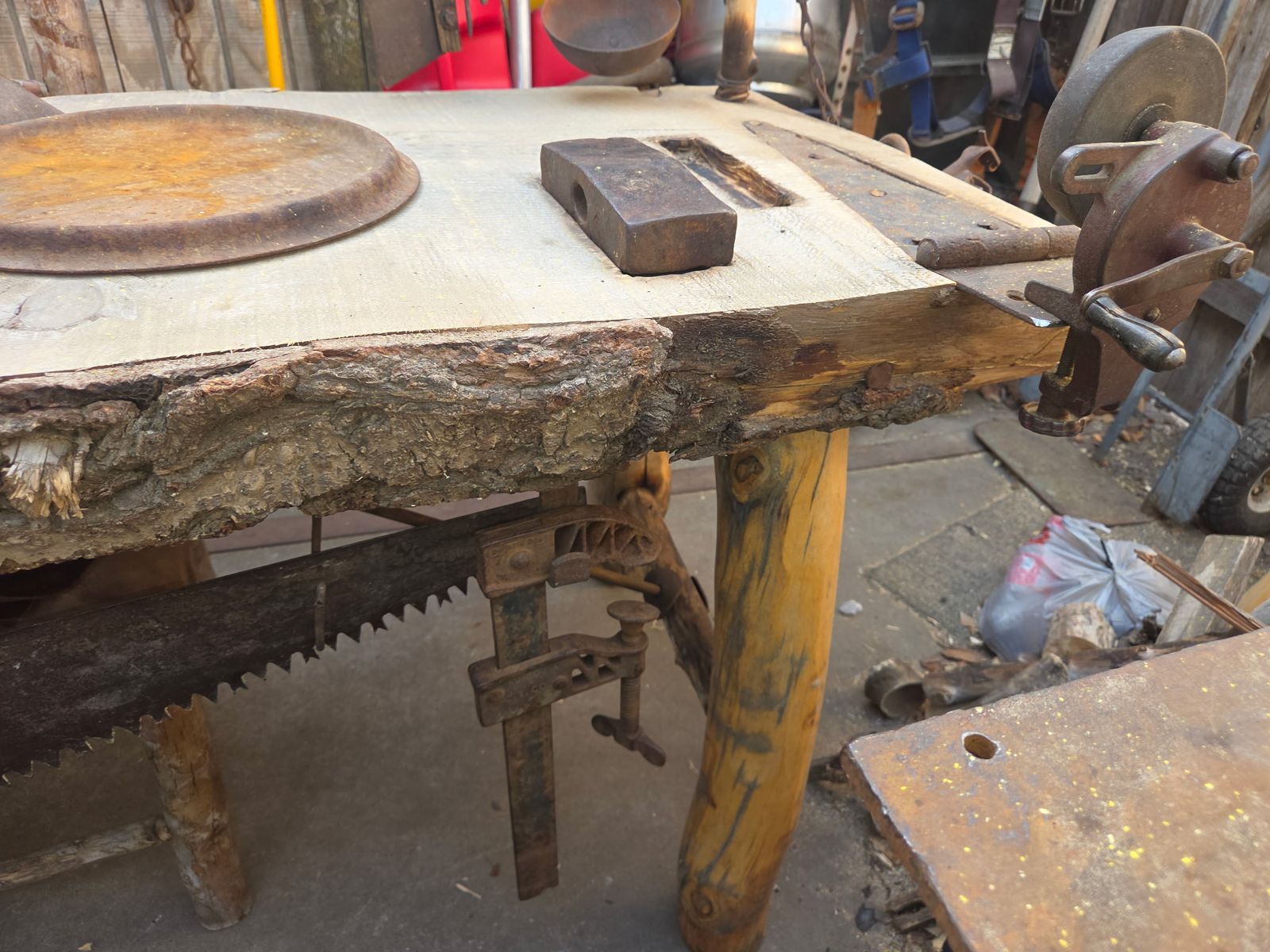 work table with various work tools made to the table very old from southern Utah. Has a ranch brand burned into the surface. Looks like rockin R? $700 firm location Provo Utah alternate phone number text only to 801-7240.
