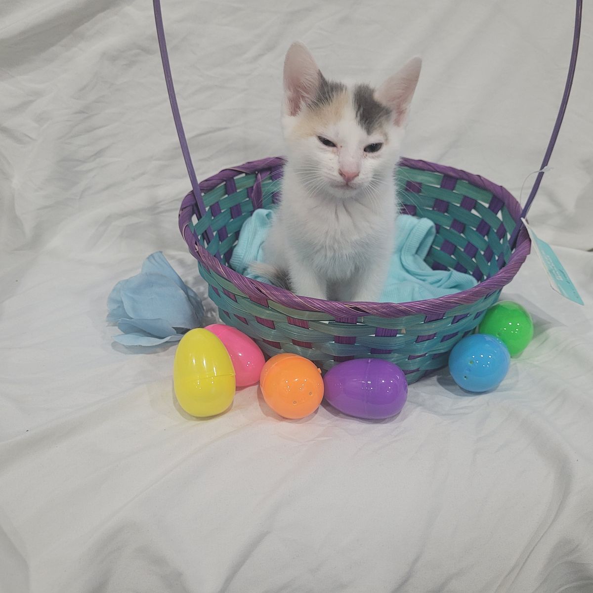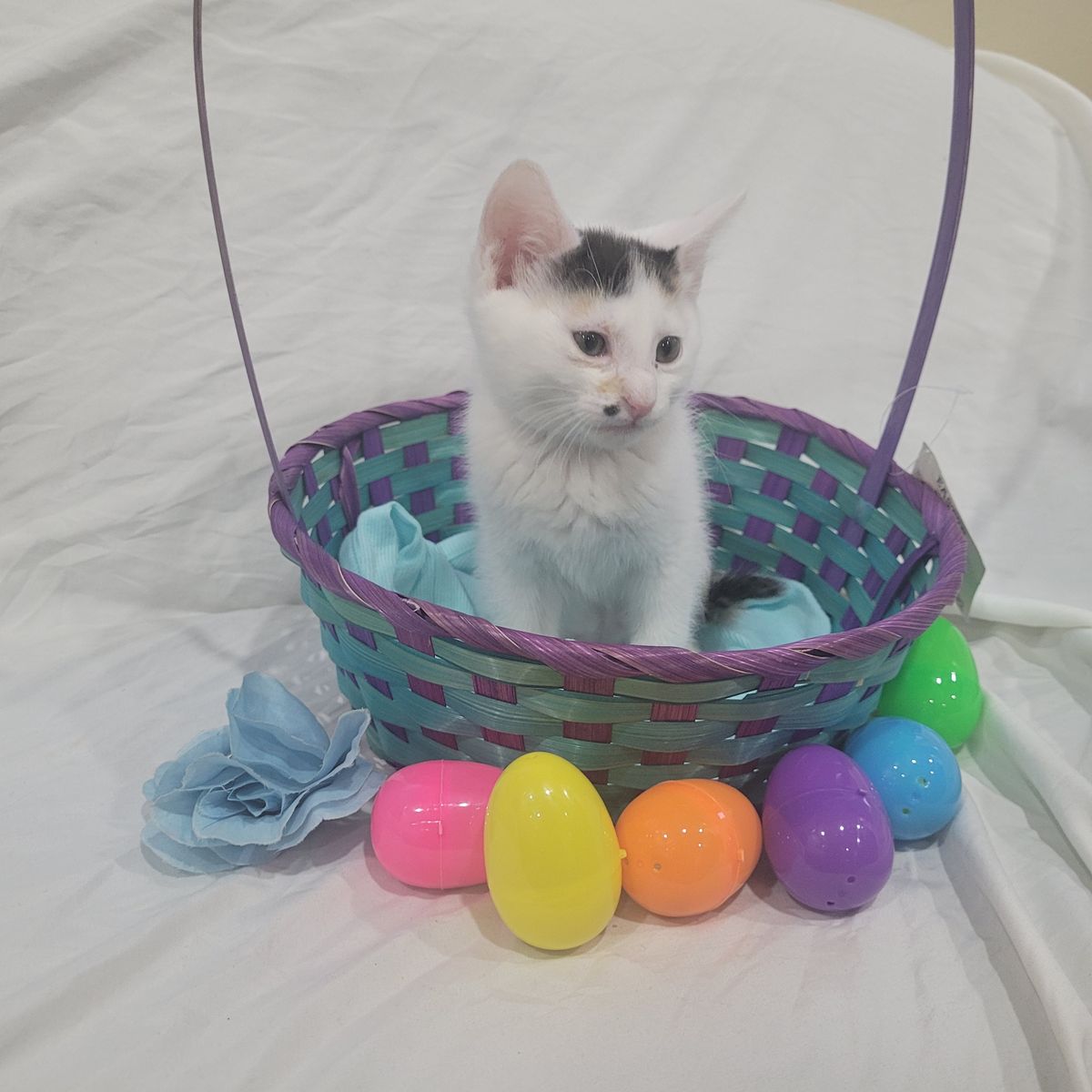 Spotty is also mostly white. But she has calico markings on her tail and by her ears and on her face.