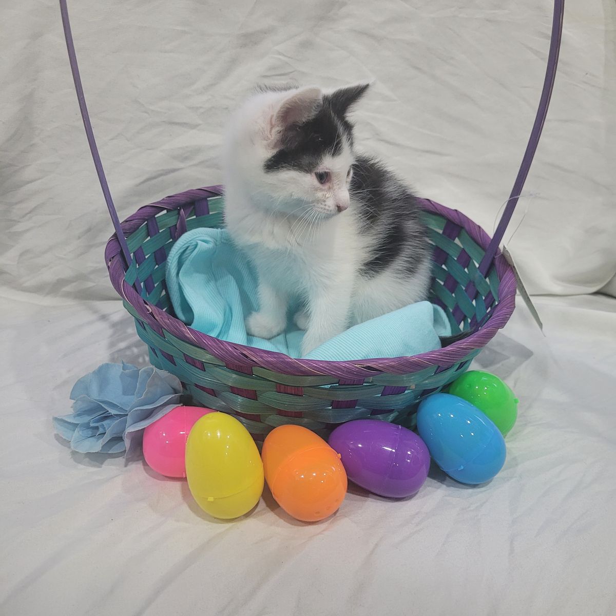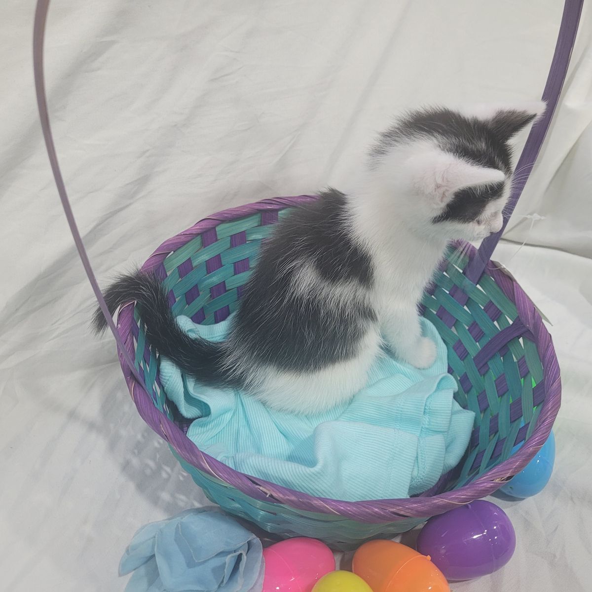 Oreo is a black and white male kitten. He is spunky and is the first to run and chase things. But he is also needs his cuddles.