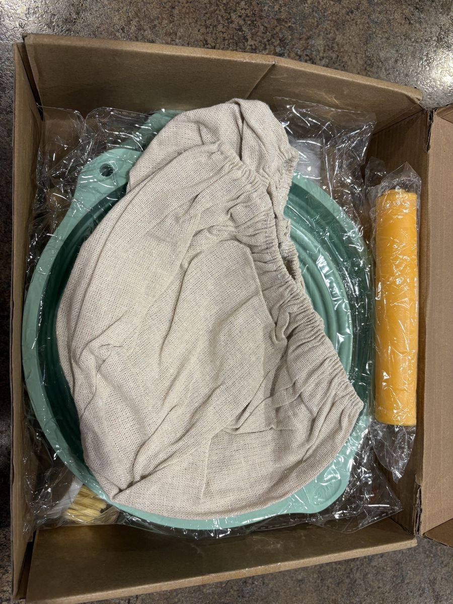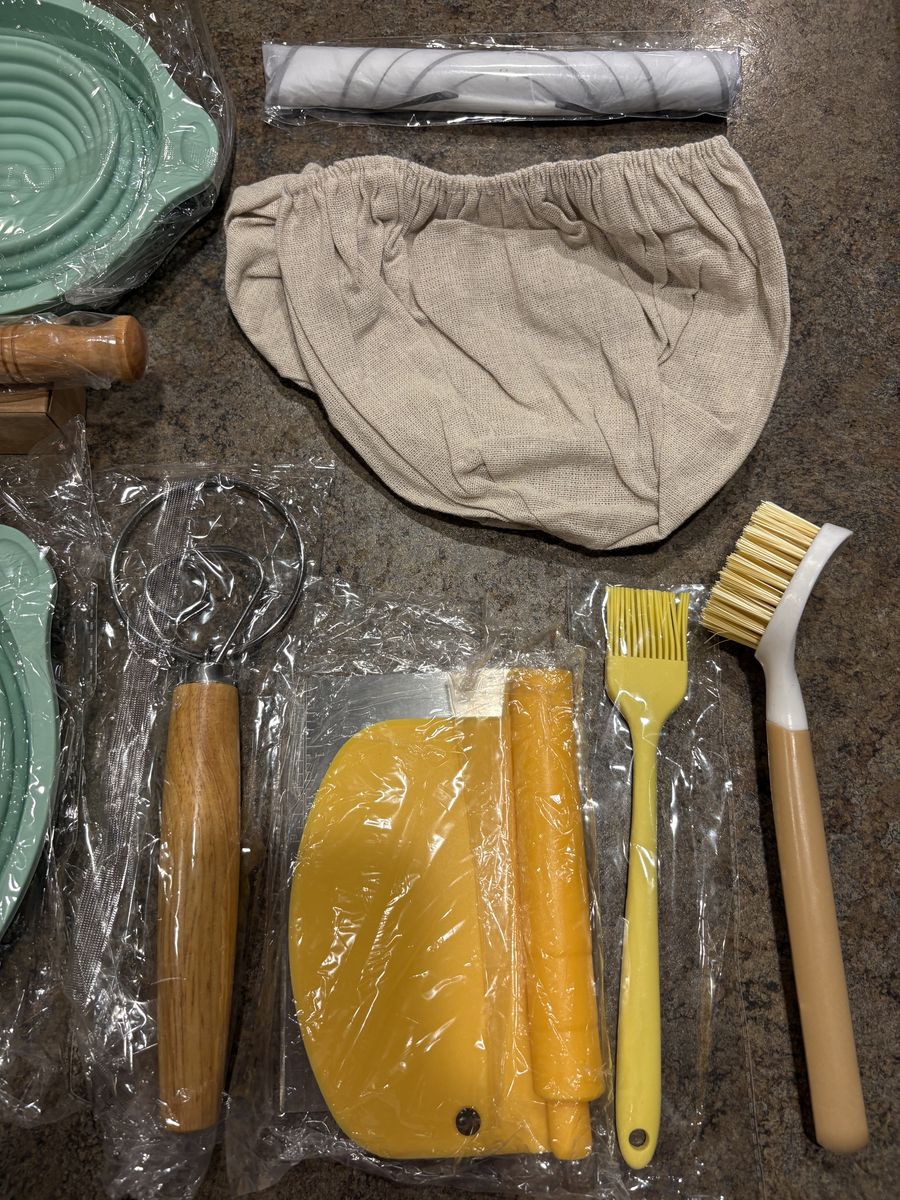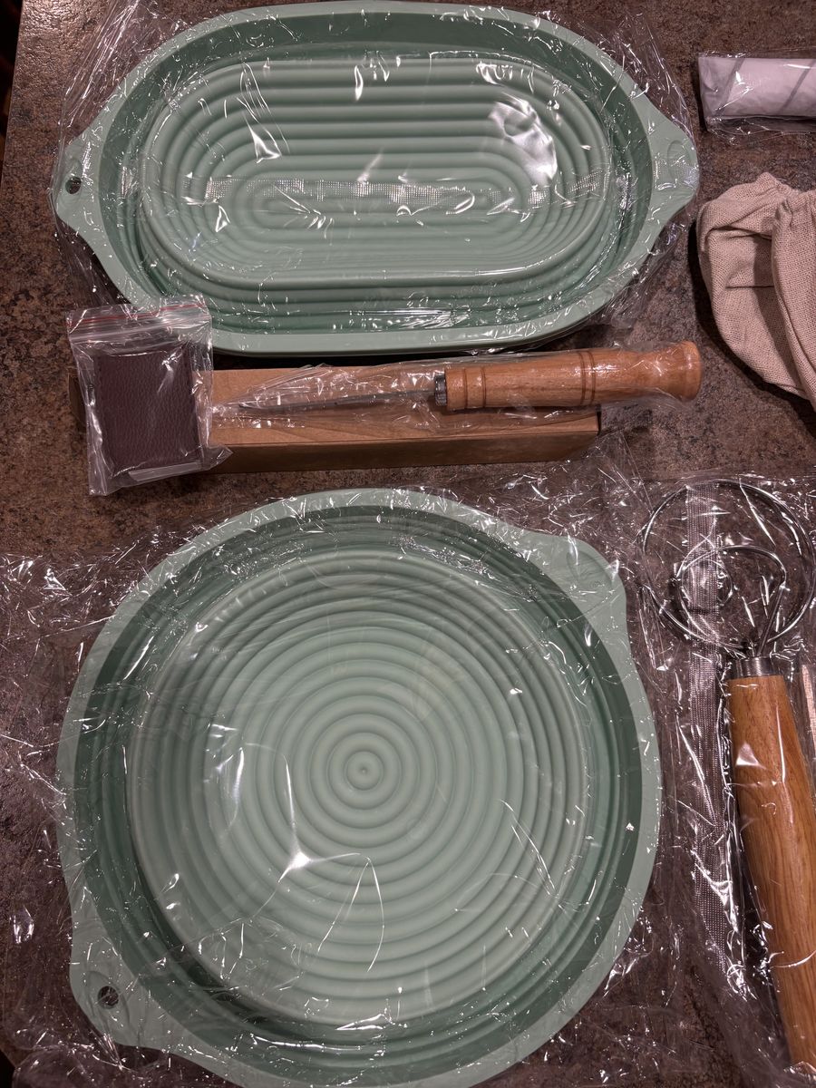 9 Inch Round 10 Oval Bread Banneton Basket Bread Lame with blades Dough Scraper Dough Whisk Dish brush Silicone basting brush Linen liners Silicone Bread Sling for Making Baking Fermentation Brand new! Get started on the sourdough bread kick! $25
