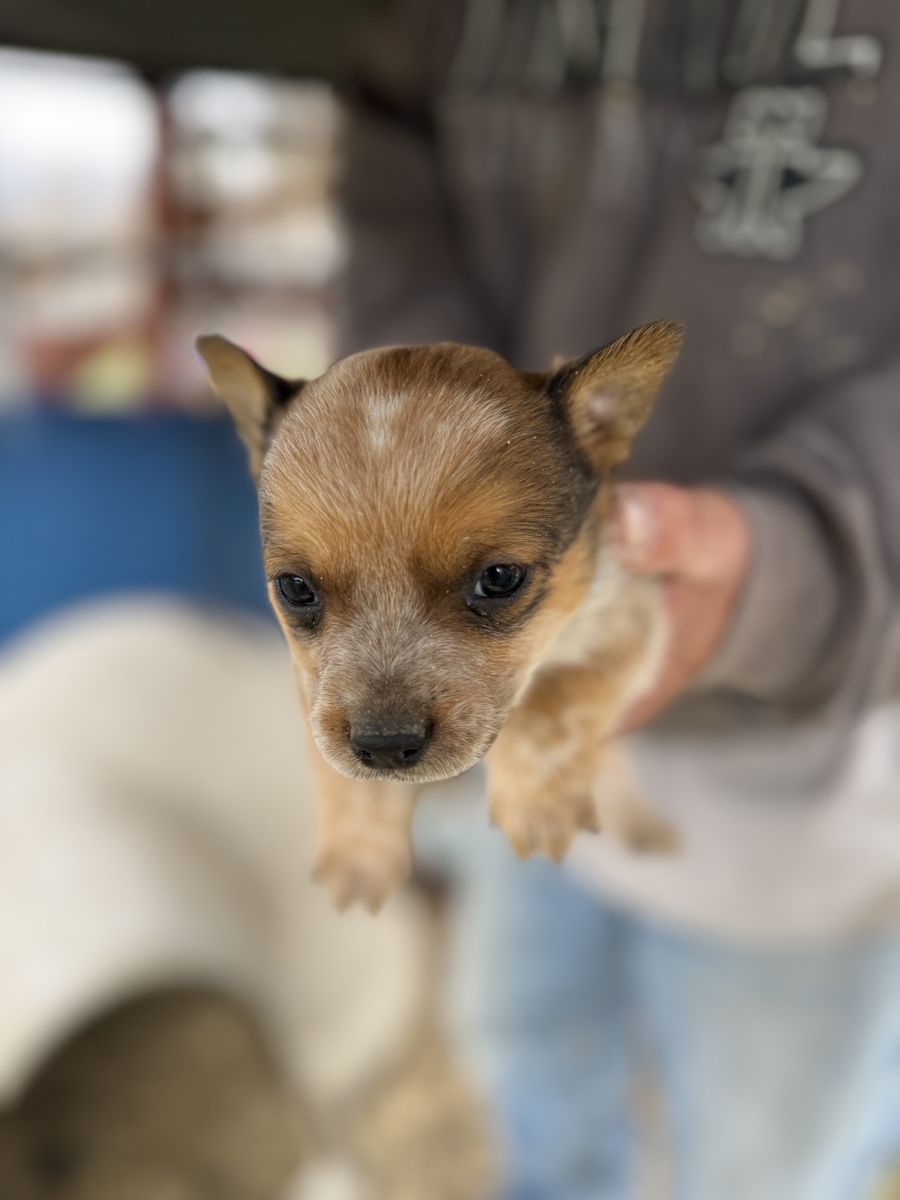 ZelleI HAVE 1 RED MALE AND 1 BLUE FEMALE AND 3 RED FEMALES LEFT, THEY ARE MINI HEELERS THEY ARE 5 WEEKS RIGHT NOW WILL BE READY IN A FEW WEEKS , GET YOUR RESERVED! DAD IS A MINI BLUE, HE IS 15 INCHES TALL AND ABOUT 15 PDS AND MOM IS A MINI RED, SHE IS 14 INCHES TALL AND ABOUT 17/18 PDS NORMALLY BUT FAT RIGHT NOW TO NURSE PUPS, BOTH ARE WORKING COW DOGS, THEY LOVE KIDS!!! THEY COME WITH THEIR TAILS DOCKED, DEWCLAWS REMOVED, 1ST SET OF SHOTS, NAILS TRIMMED AND DEWORMED, A BAG OF PUPPY FOOD CALL OR TEXT FOR MORE PICS IT WONT DOWNLOAD THEM! THANKS ! 700.00 EACH