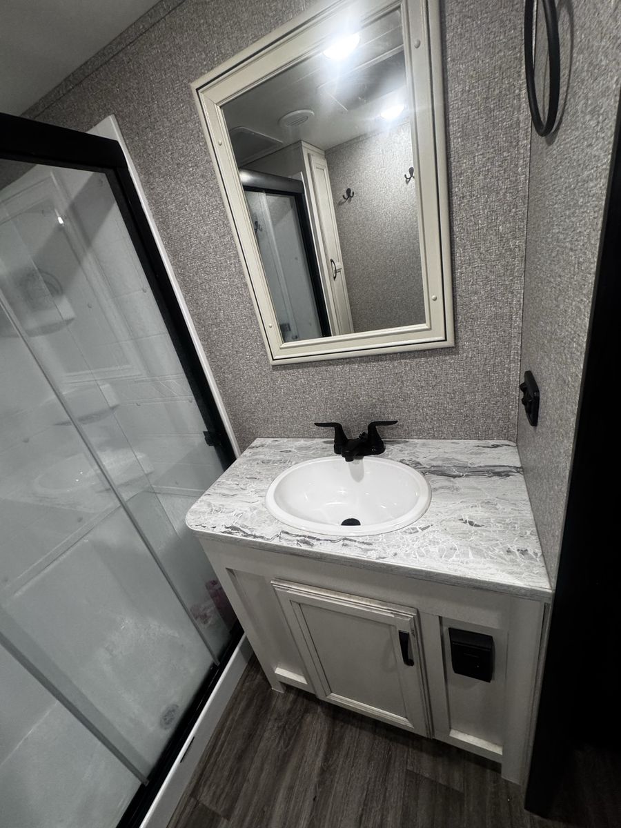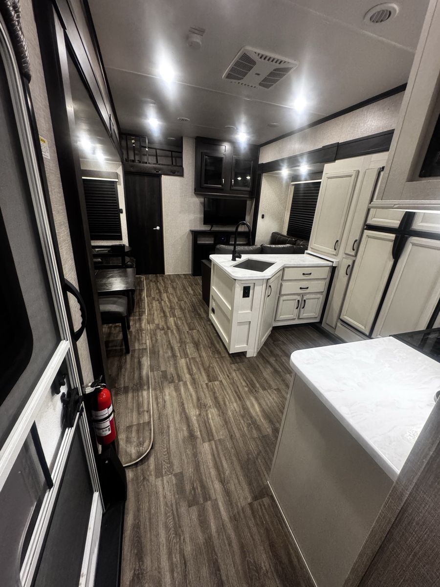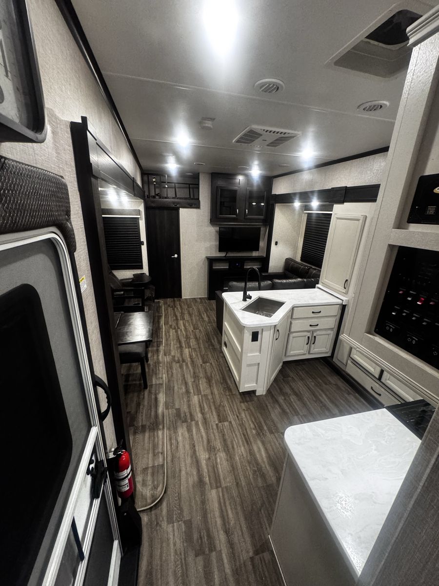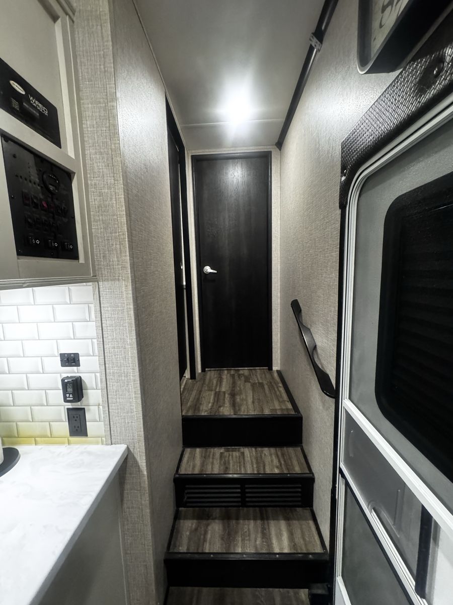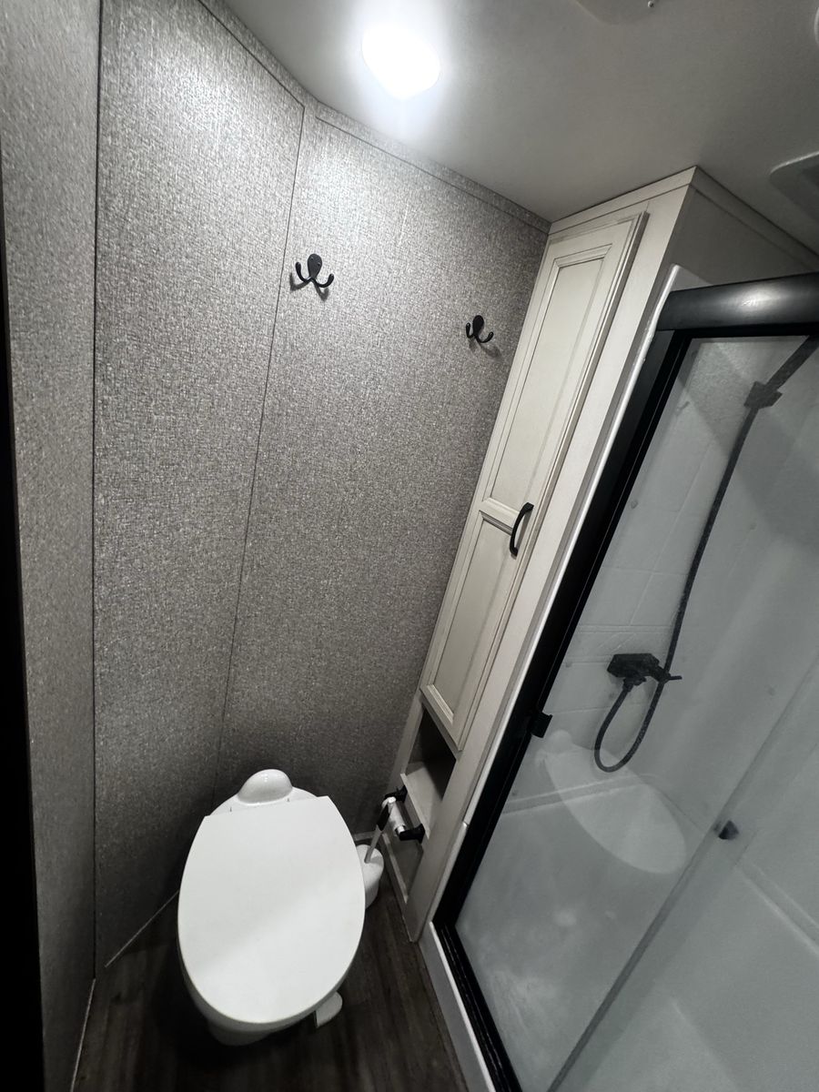 Bedroom/Bath: Includes a king bed with an east-west setup for more space, a front wardrobe, and a spacious bathroom with a glass-door shower. Exterior: Comes with a rear patio with steps, 3-season doors, a 5.5K Onan generator, and Goodyear Beast tires. Construction: Built with a 102-inch wide-body, Climate Shield zero-degree tested weather protection, and a 2-year limited warranty.