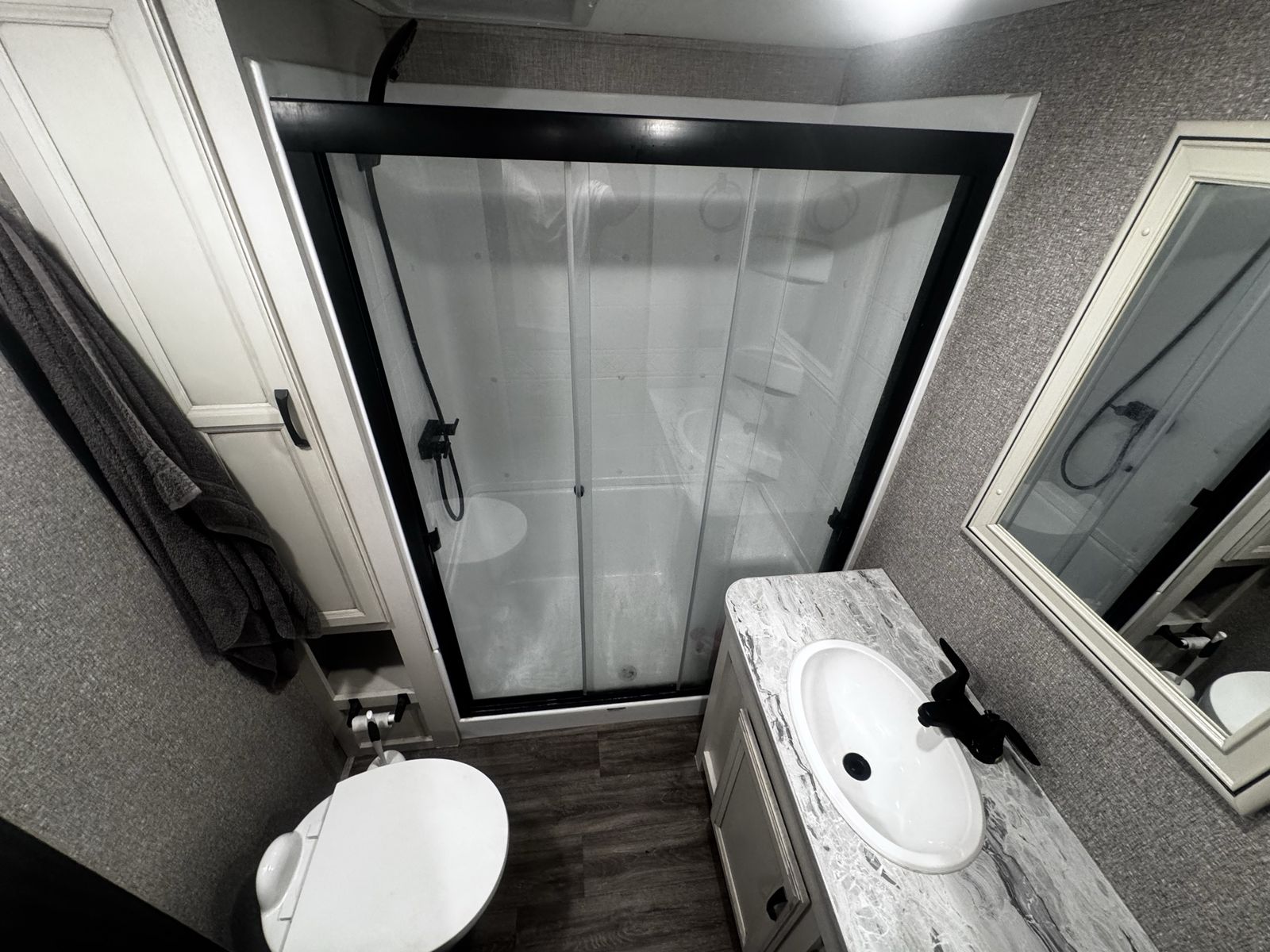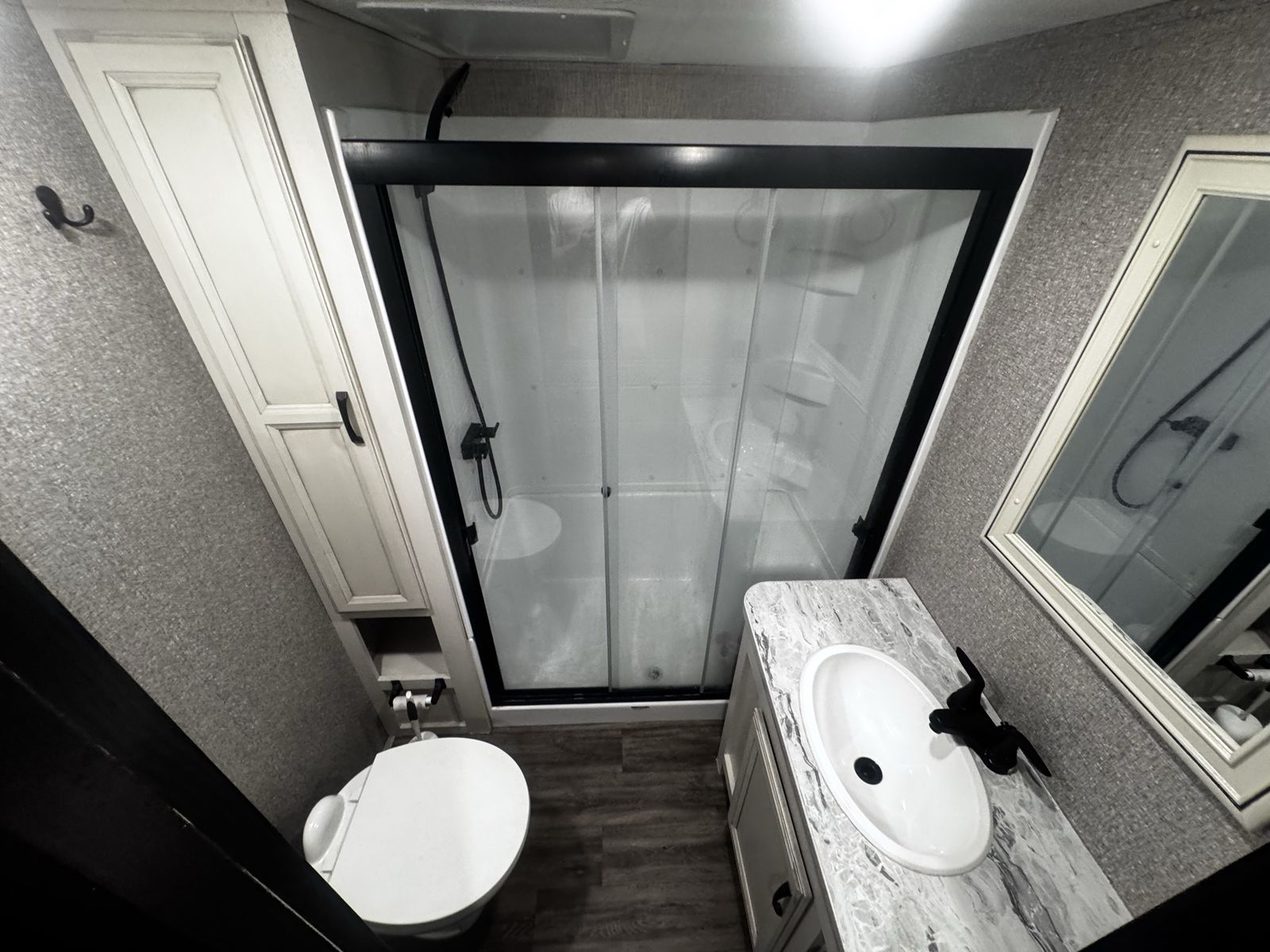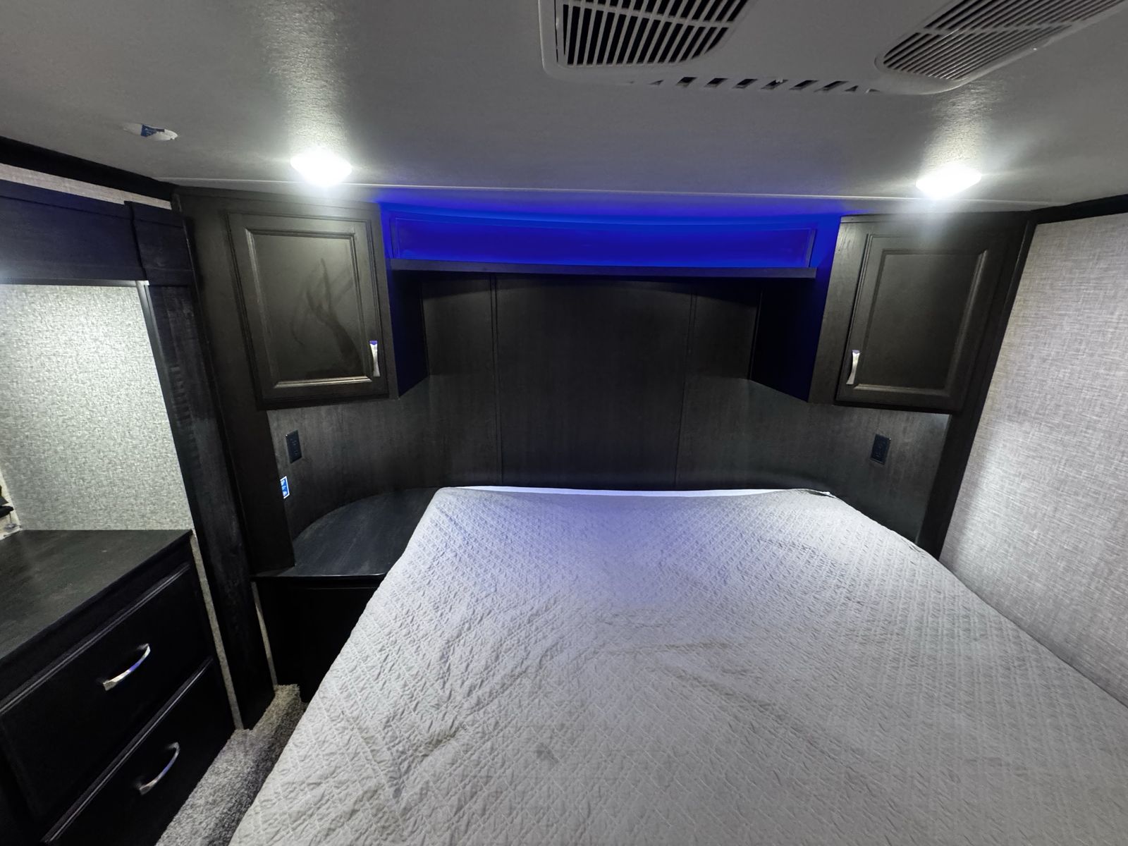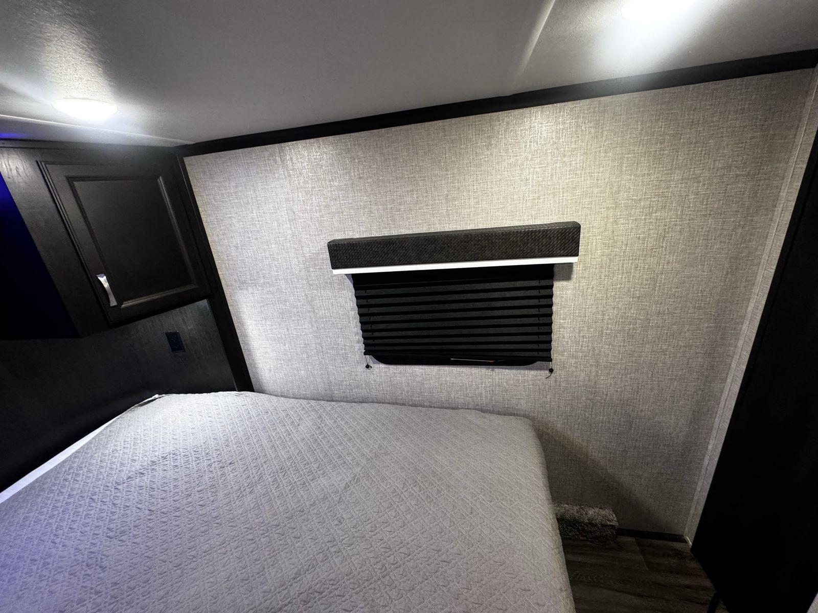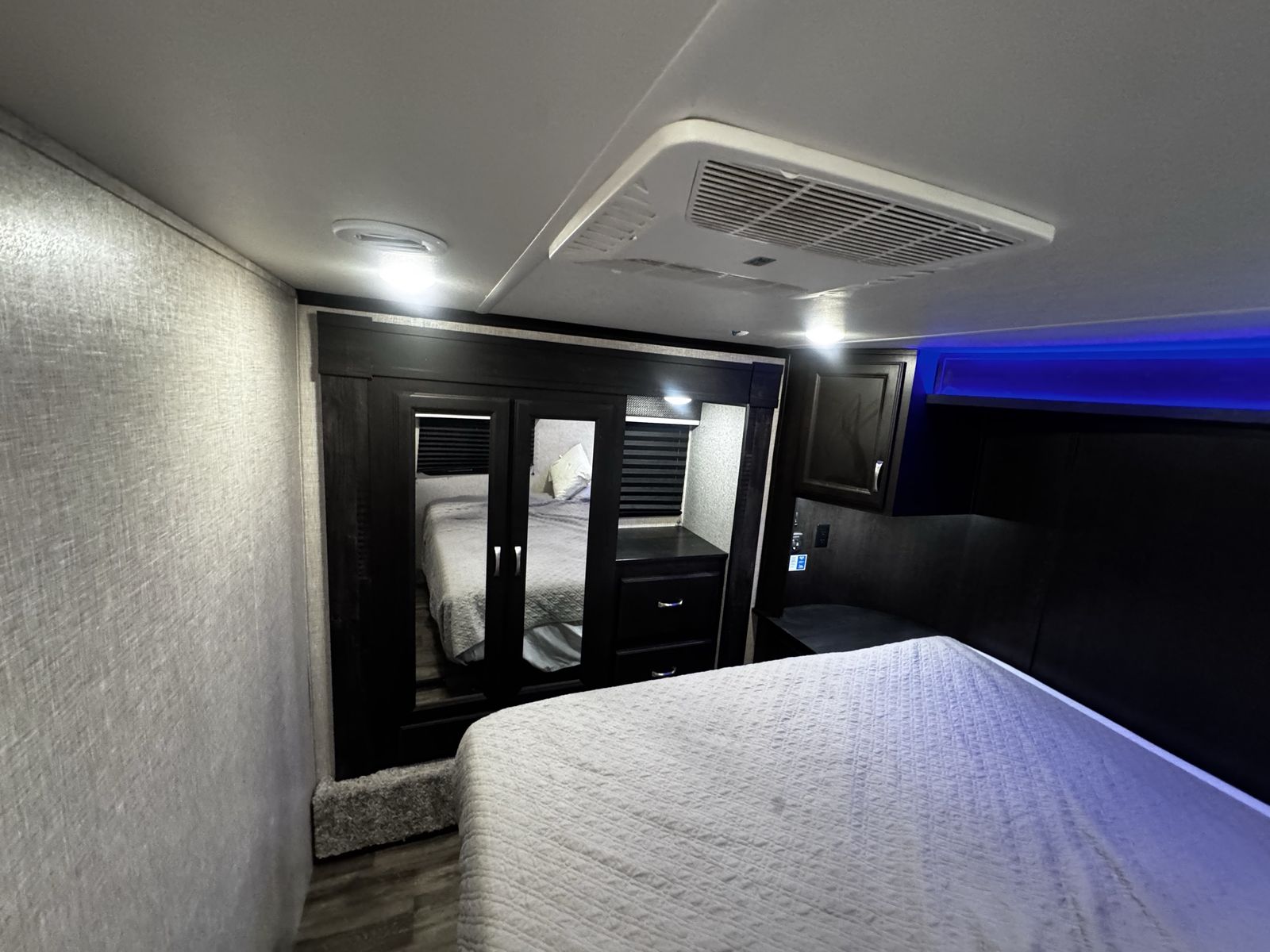 Bedroom/Bath: Includes a king bed with an east-west setup for more space, a front wardrobe, and a spacious bathroom with a glass-door shower. Exterior: Comes with a rear patio with steps, 3-season doors, a 5.5K Onan generator, and Goodyear Beast tires. Construction: Built with a 102-inch wide-body, Climate Shield zero-degree tested weather protection, and a 2-year limited warranty.