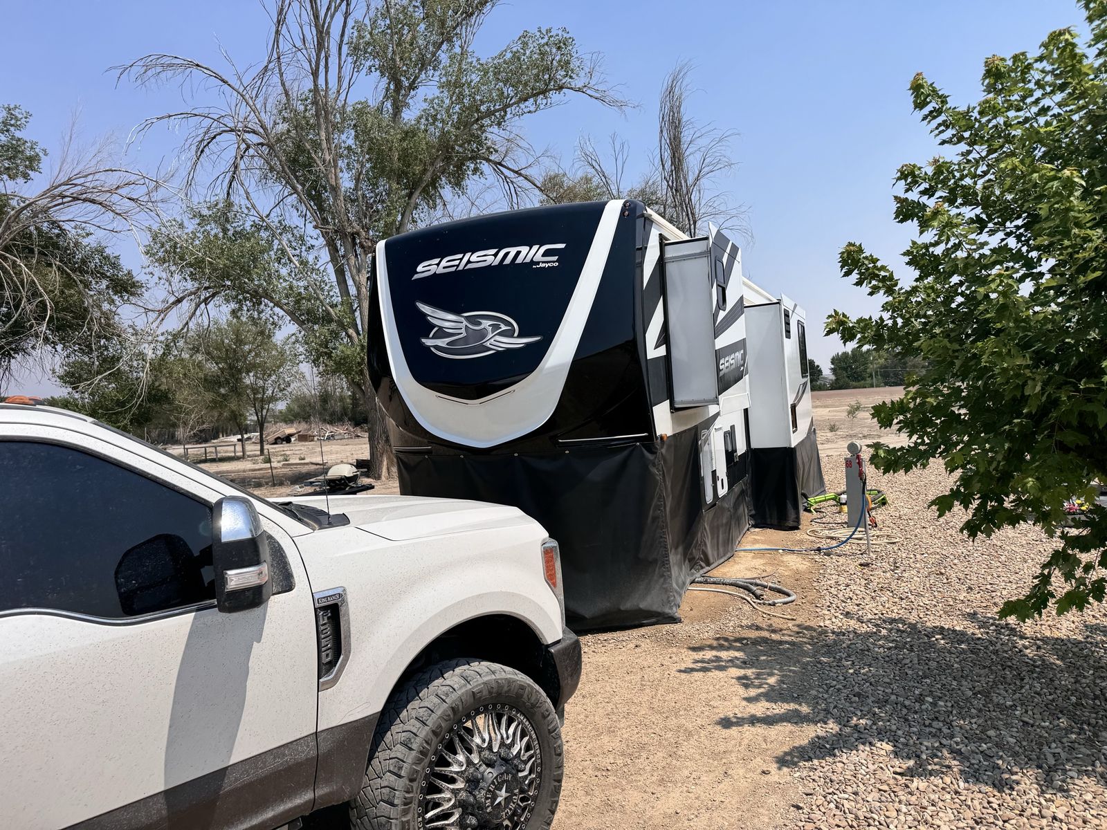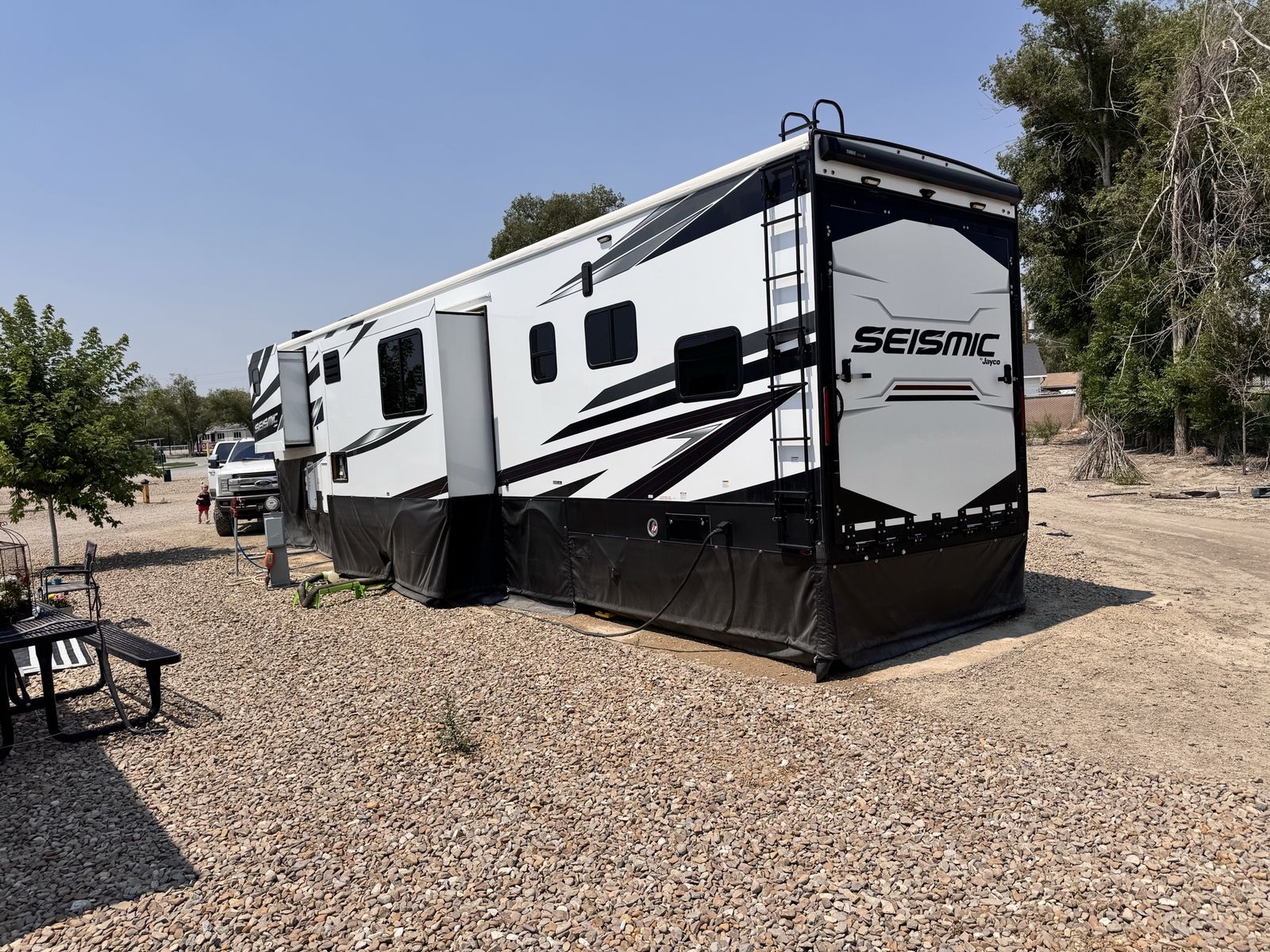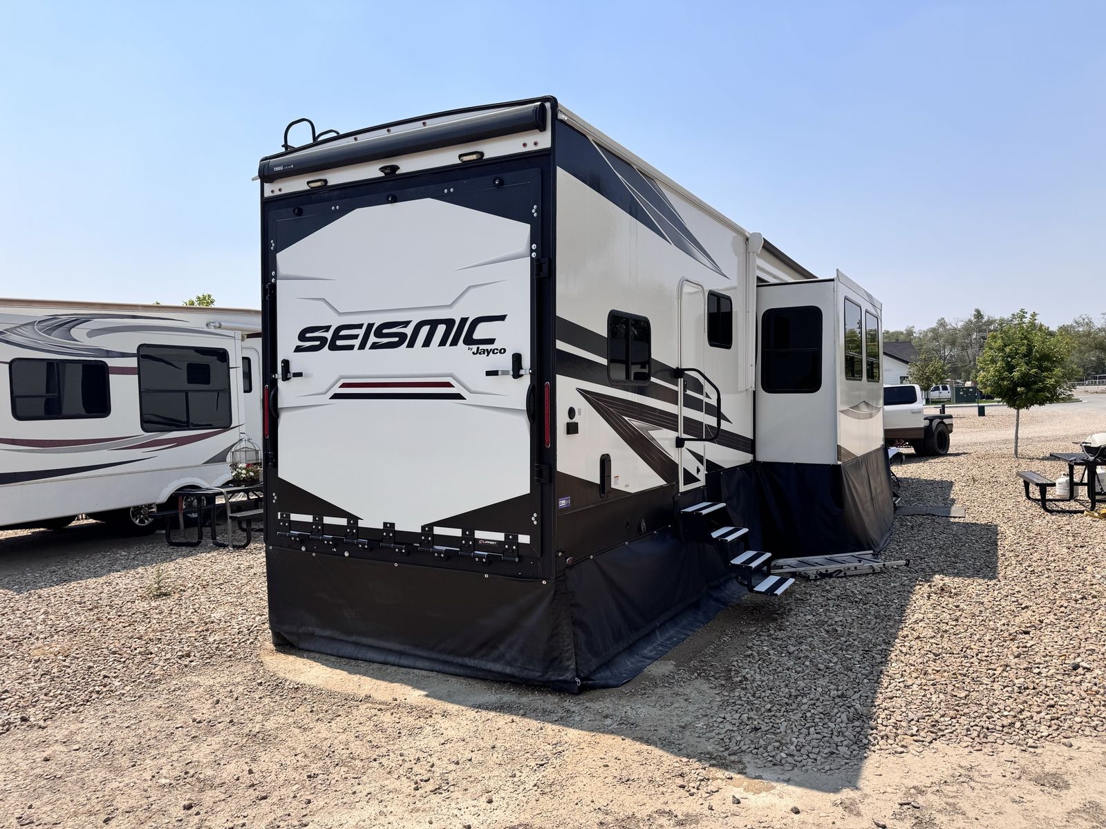 The 2023 Jayco Seismic 395 RL is a luxurious 45-foot+ 5th wheel toy hauler featuring a 14-foot garage, triple slides, and a 102-inch wide-body design that sleeps up to 9 people. It includes a 3-season garage wall, rear patio, 5.5K generator, and 6-point hydraulic leveling, making it a high-end option for hauling toys