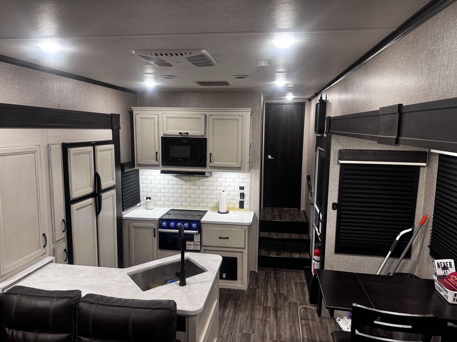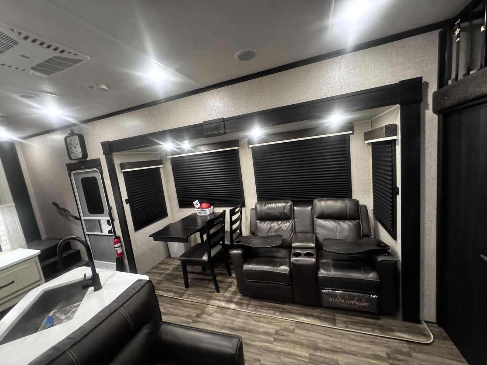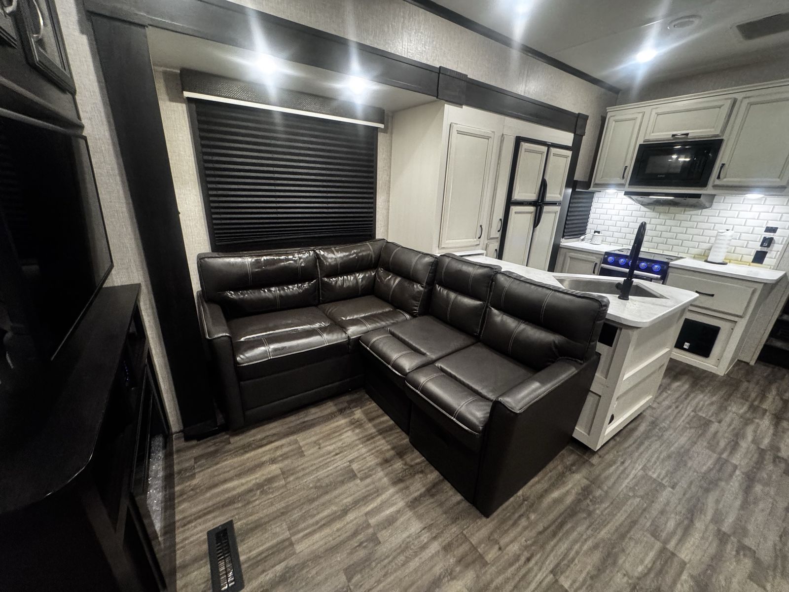 Living/Kitchen: Features opposing slides with an L-shaped sofa, theater seating, and a residential-style kitchen with a large refrigerator, 3-burner stove, and ample counter space.