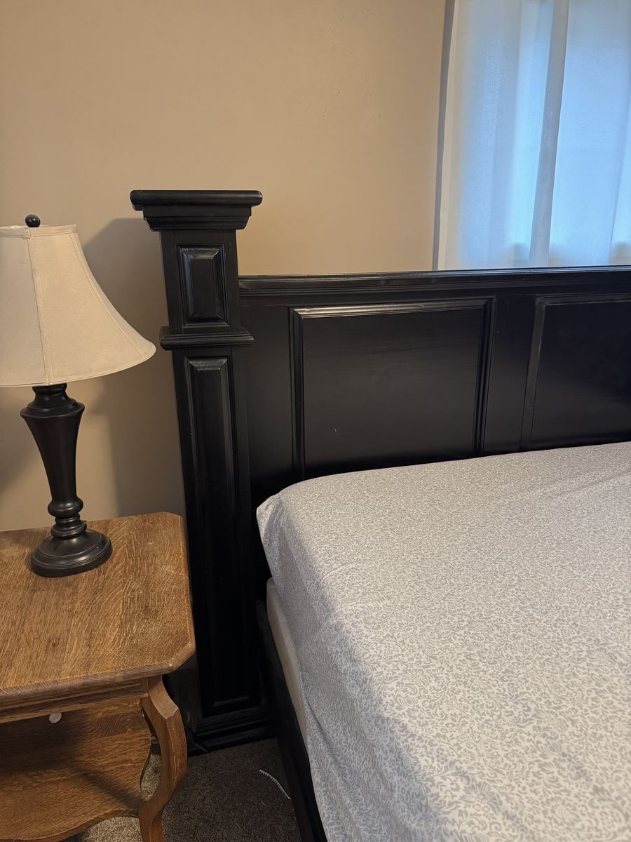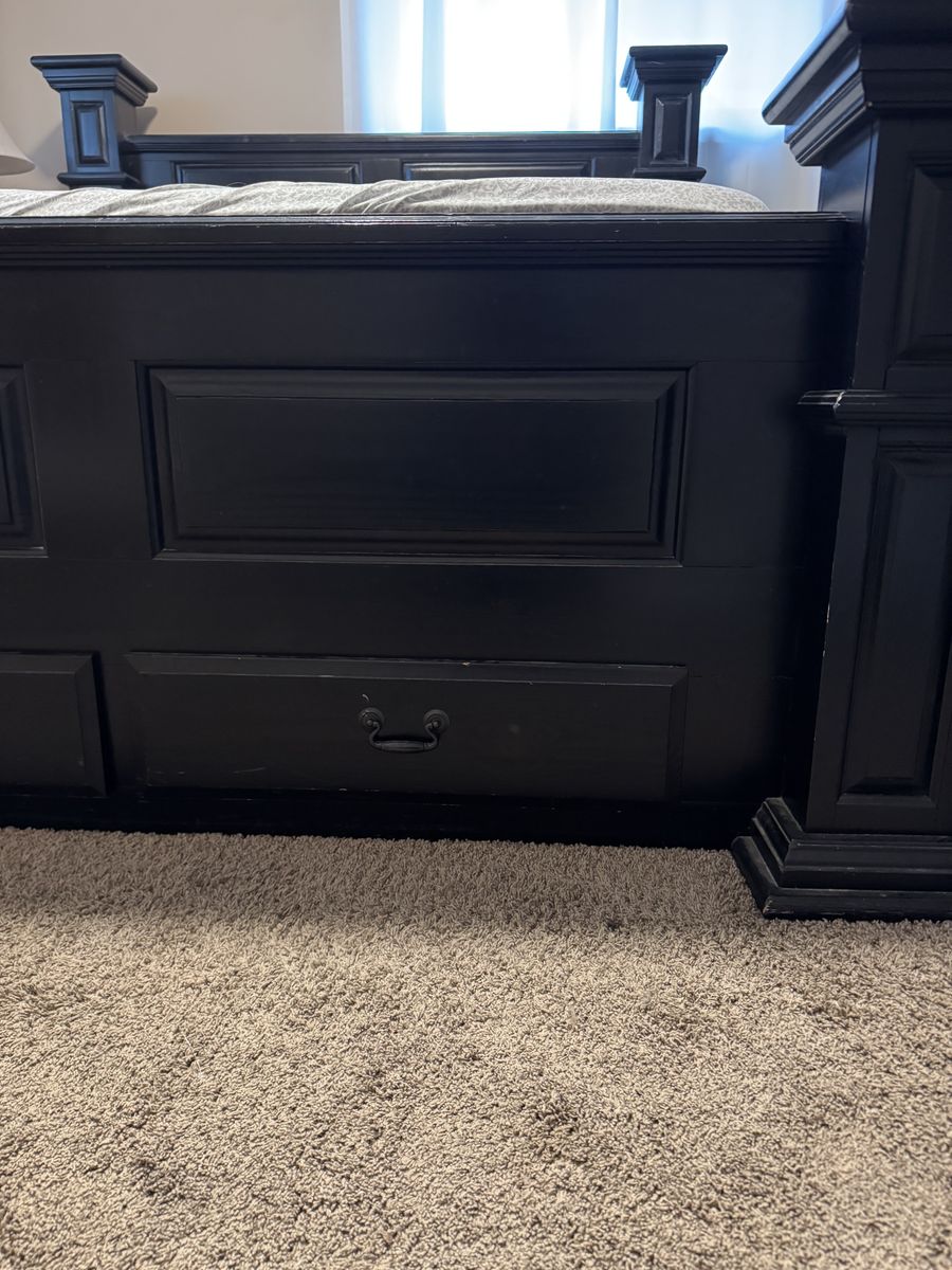 VenmoBeautiful dark wood bed frame with tall headboard and footboard. Heavy, well-built, and in great condition. Comes from a smoke-free home with built-in two drawers at the footboard $350 or best offer.