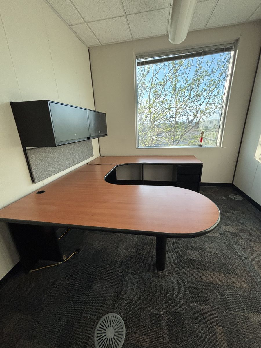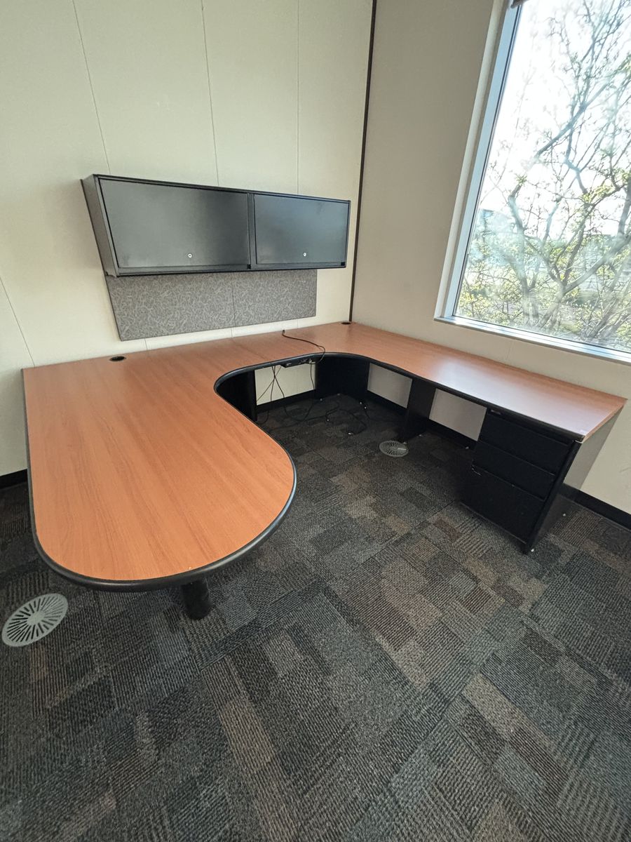 ApplePayThis item is a used commercial-grade U-shaped office desk featuring a cherry laminate top, black base, a mobile file cabinet, and a matching wall-mounted hutch. 7' 8" x 8". Used sell price is over $1,000 but asking price is $300 or best offer. Pickup is needed, send any message for questions :)