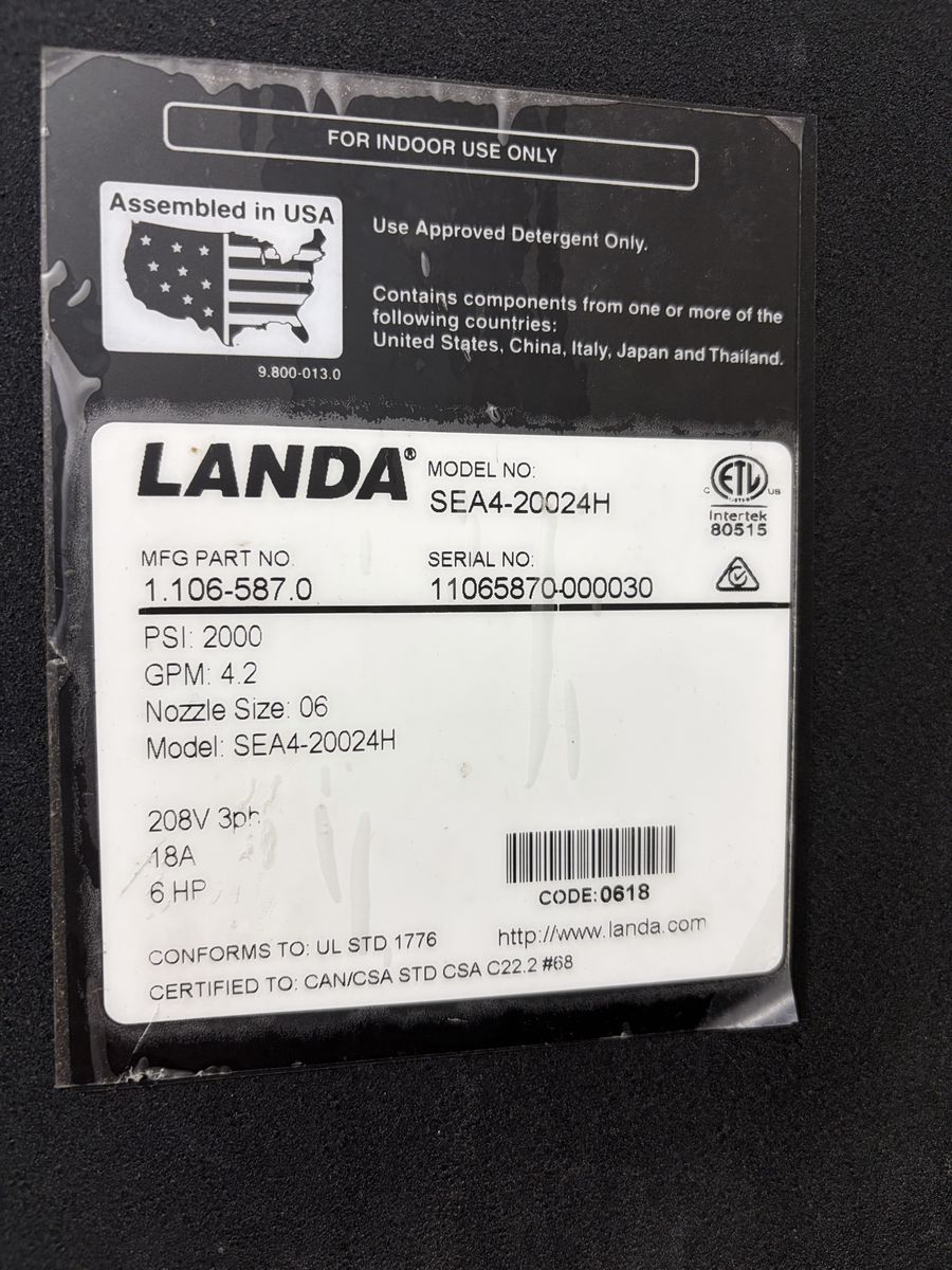 LANDA SEA4-20024H Hot Water Pressure Washer • 2000 PSI • 4.2 GPM • 208V 3-Phase • 6 HP • Indoor commercial unit • Wall-mounted hose reel included