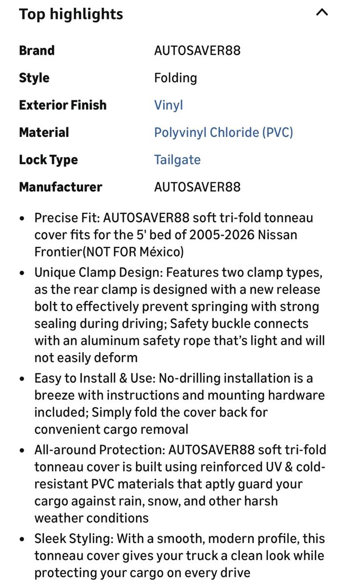 VenmoTri-Fold Soft Truck Bed Tonneau Cover Fits 2005-2026 Nissan Frontier 5’ Bed New in the box Cash preferred Will accept Venmo Pick up in Roy
