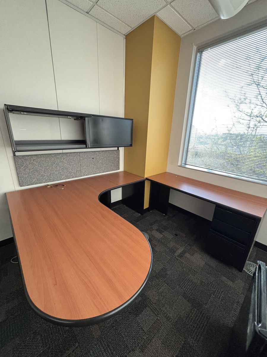 VenmoThis is a U-shaped office workstation featuring a cherry laminate surface, a black filing cabinet, and a hutch with a tackboard. 7' 8" x 8". Great condition. Price for this tends to be over $1,000 but asking price is $300 or best offer. Needs to be picked up.