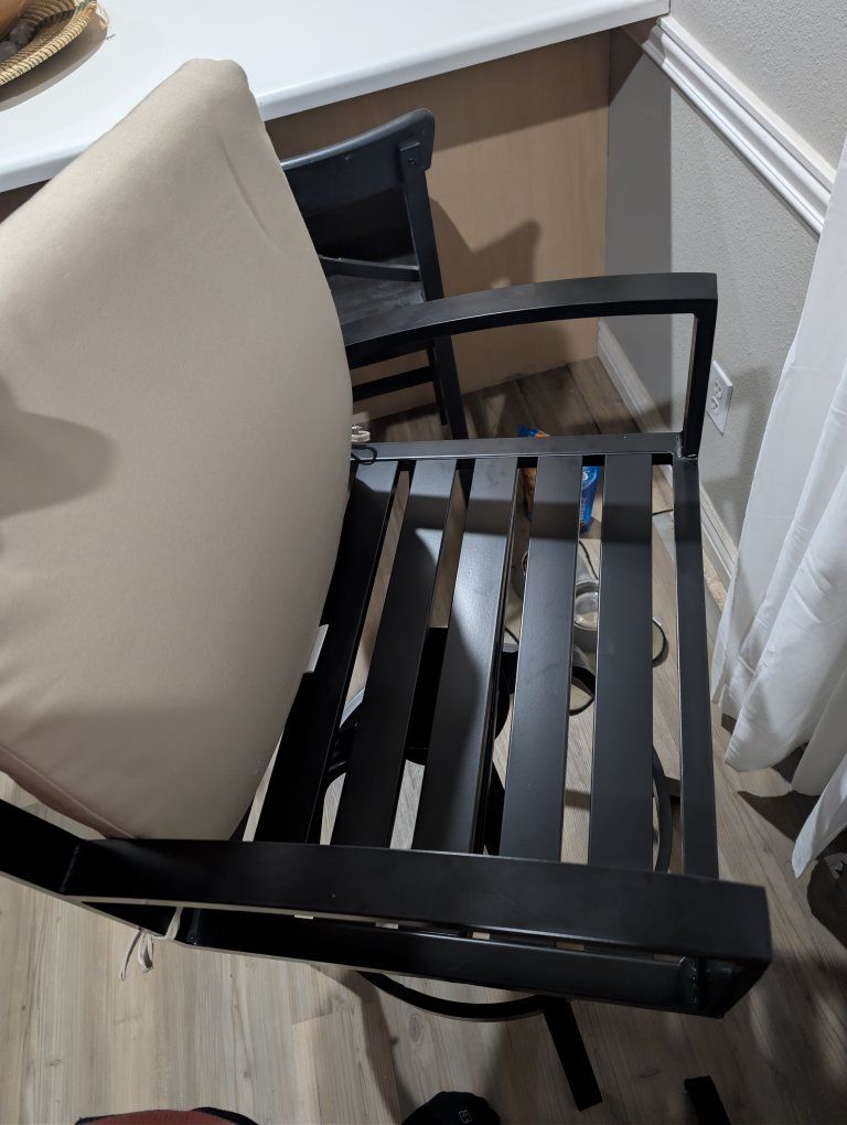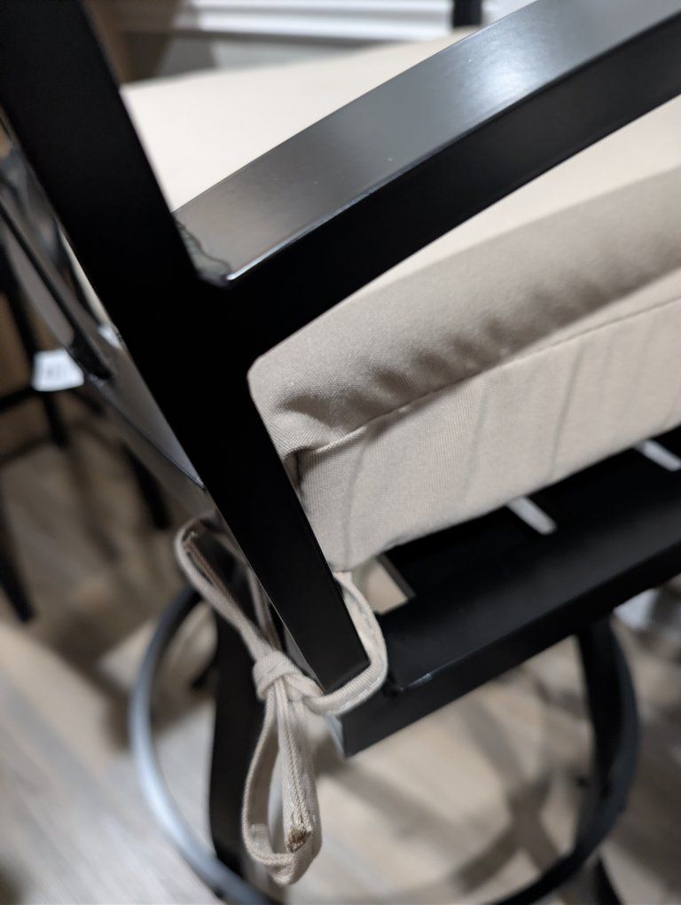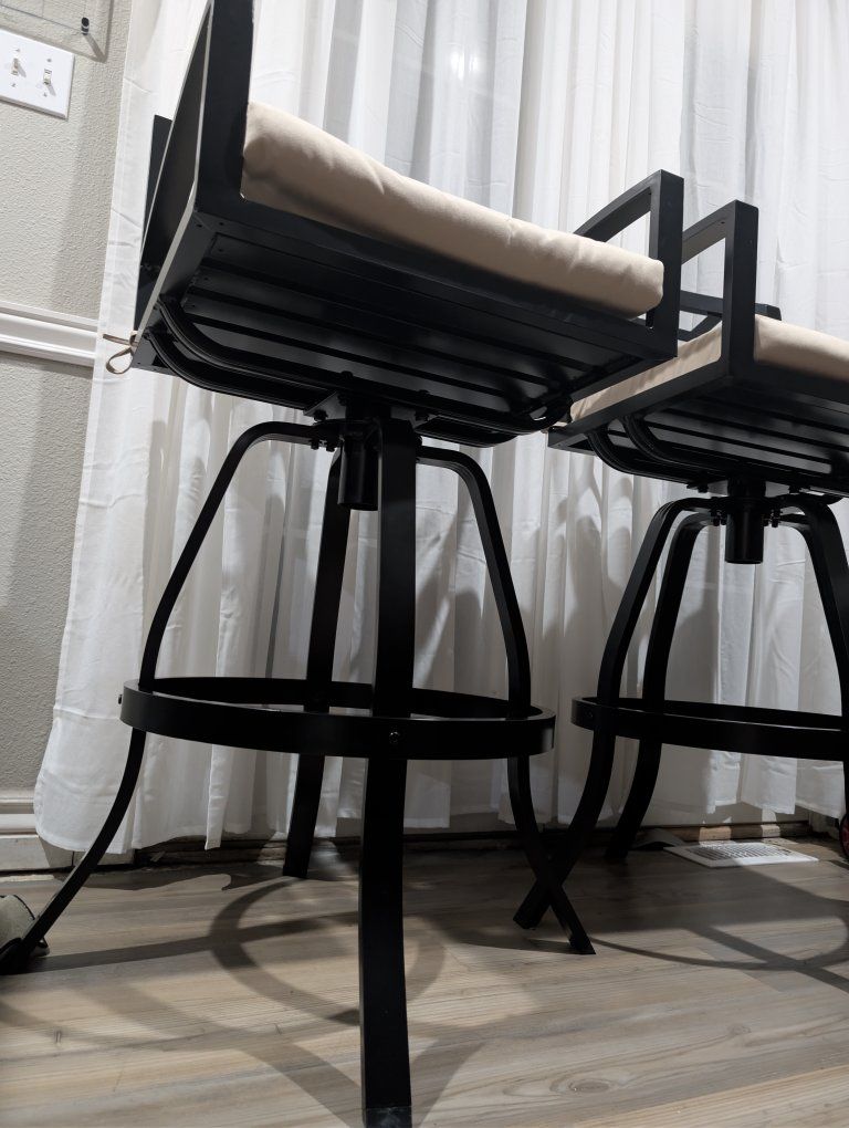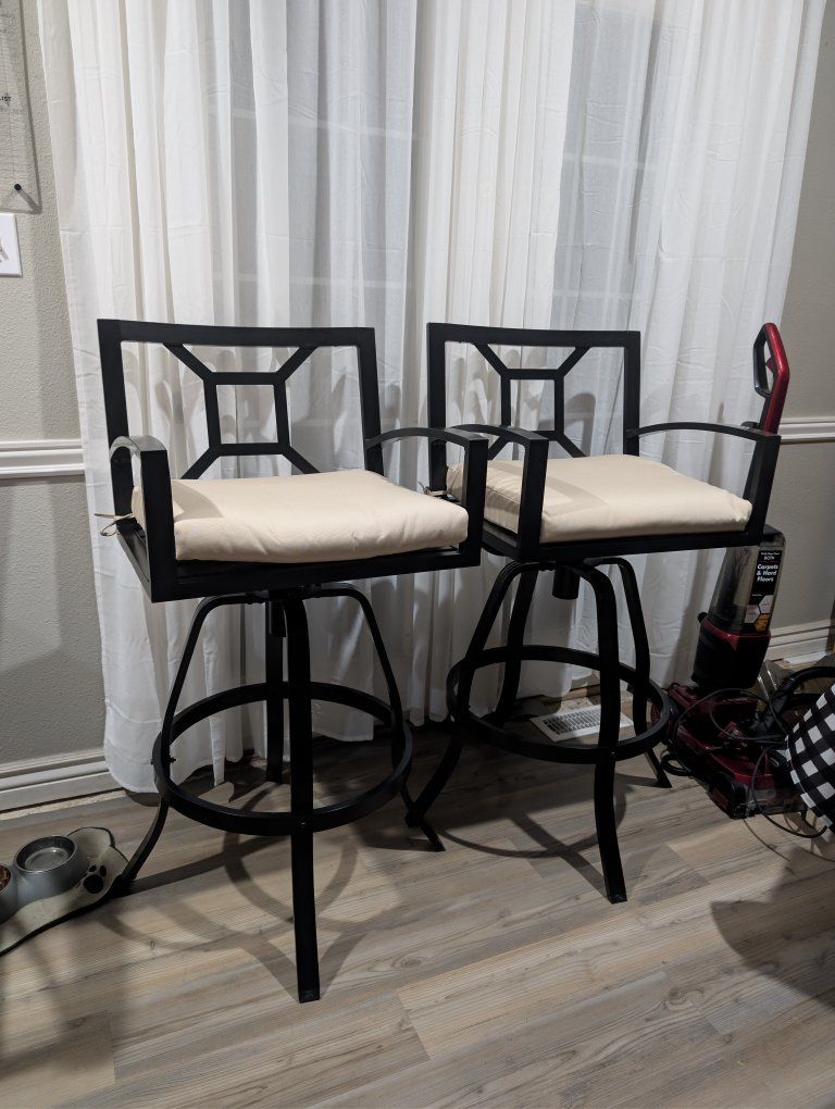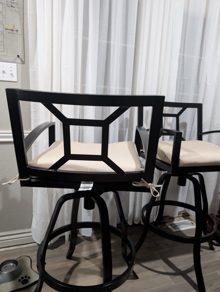 PayPalBrand New and retail for $428 on Amazon. They are too tall for my bar. Sturdy black metal swivel bar stools come in a set of two. Each chair has a decorative geometric backrest and curved armrests. Tan fabric seat cushions are included and tie to the frame. Circular footrest provides extra comfort and stability.