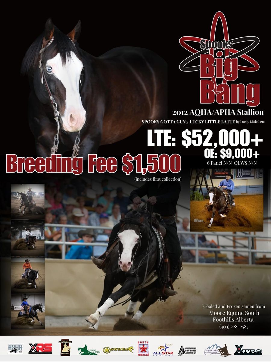 I purchased breeding to Spooks Big Bang but will not end up using it, I’m selling my contract (contract has not been filled out with mare info that will be bred). Reach out to me if you’re interested and we can get semen sent over, Fresh or Frozen is available. The total breeding fee is $1,500. I paid $1,000 already, A $500 chute fee is still needing to be paid. I’m selling the contract for $800, my loss is your gain.