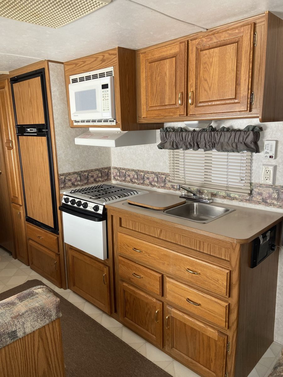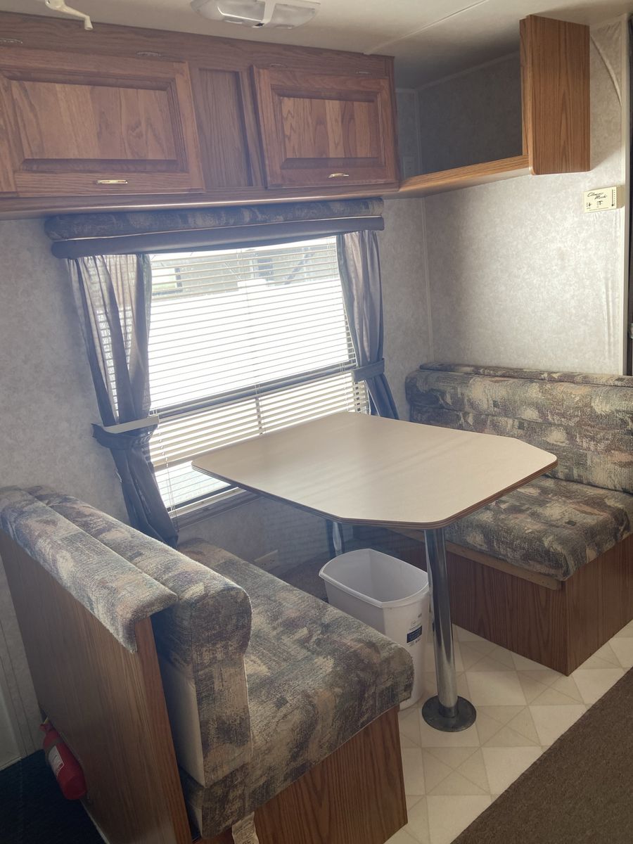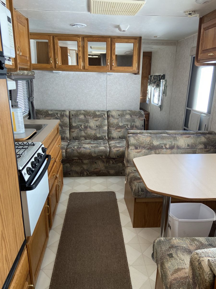 When we got the trailer it had some water damage. No structural issues but you can tell on parts of the wallpaper. The prior owner had new rubber matting on the roof and then it sealed. We haven’t had issues since. We took the roof down to the rubber last year, primed (rv primer is thick like pine gum), and sealed. Ran rv tape and caulk along the seams as well. The awning wasn’t ever used due to the awning so it sort of just dry rotted away.