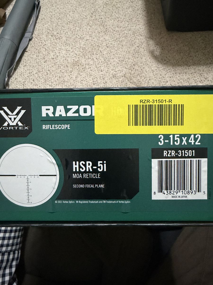 ZelleVortex Razor LHT 3-15x42 MOA with HSR-5i reticle in second focal plane. Recently been upgrading and looking to sell. Has never been mounted and comes with box. Fully backed by vortex's VIP warranty $1100 OBO