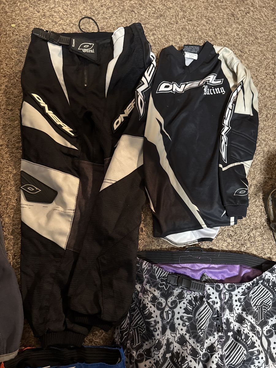 O’Neal racing pants and jersey set, black and white, size kids small jersey and size 8T-10T pants. $45.