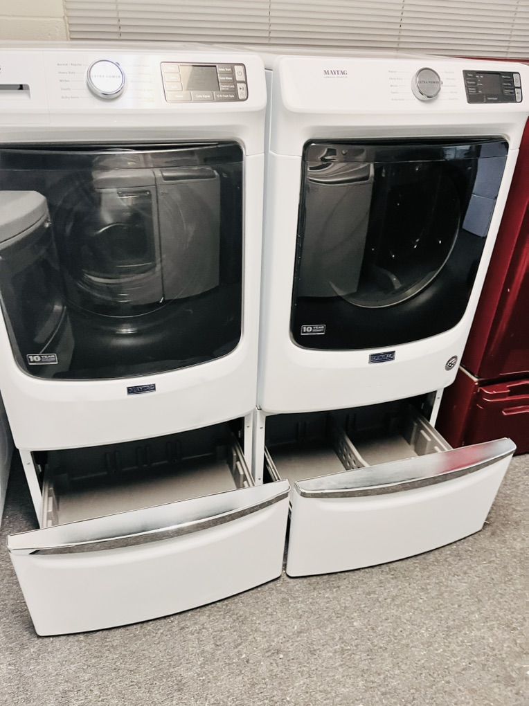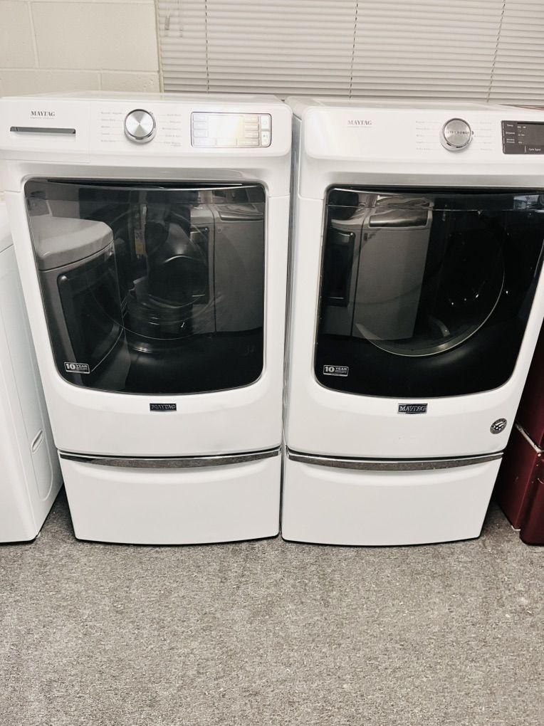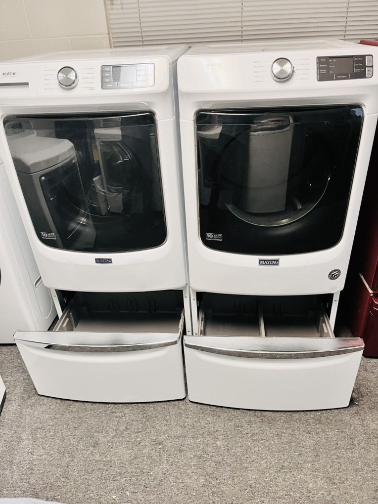 Beautiful Maytag washer and dryer set, both machines in excellent condition and very clean the washer has a 4.5 cu ft capacity drum with lots of different options, the dryer is electric with steam refresh option to remove wrinkles and freshen up your load with steam, it’s a 7.4 cu ft capacity, they come with 16” pedestal drawers for extra height and storage, these machines look and work amazingly. $650 for the set. I can deliver and install for a little extra call or text 8015403075
