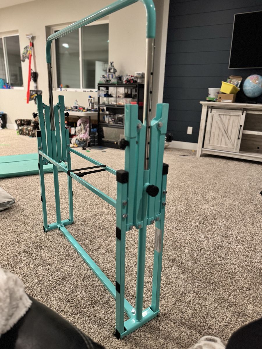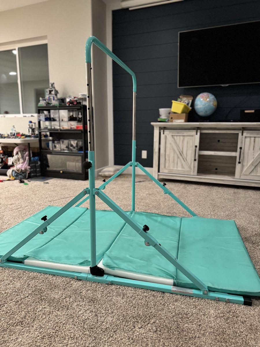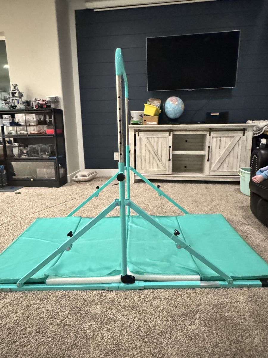 VenmoGymnastic bar for kids ages 3 to 7yrs old. Max height, 48 inches (4 feet) Length 60 inches (5 feet) Bar folds up and collapses very easily and slender for easy storage! Bar is in great condition. Will probably need a new mat but can have the one it came with the stitching is just coming apart, otherwise the foam is in great condition! Great condition just needing to upgrade as my children have outgrown it!