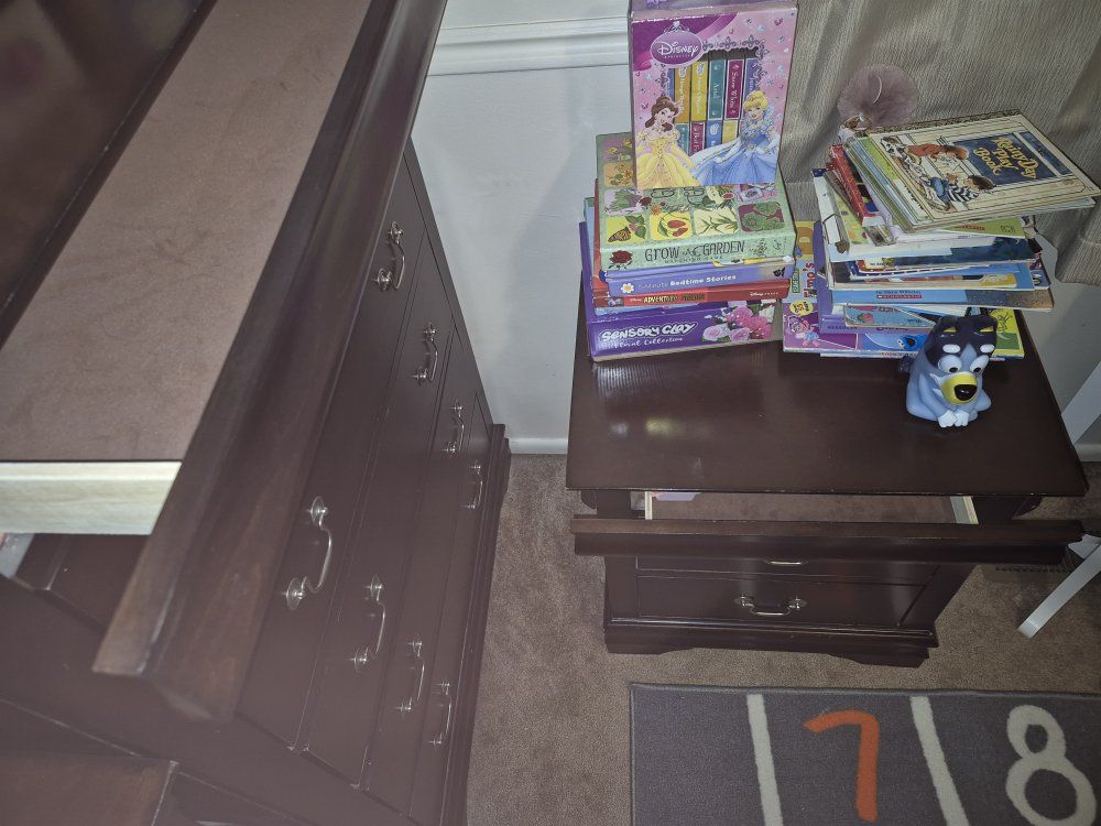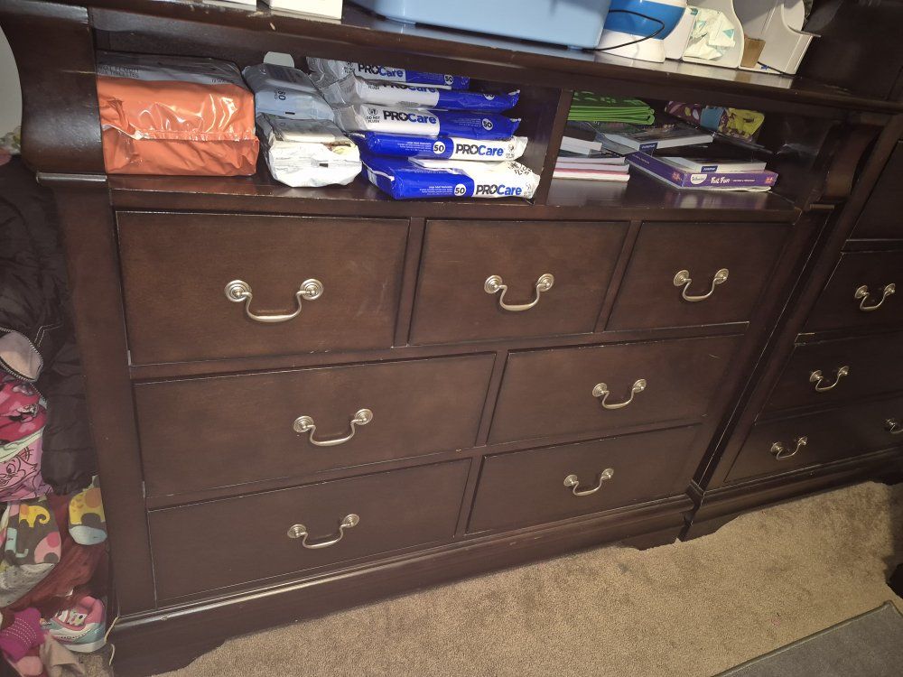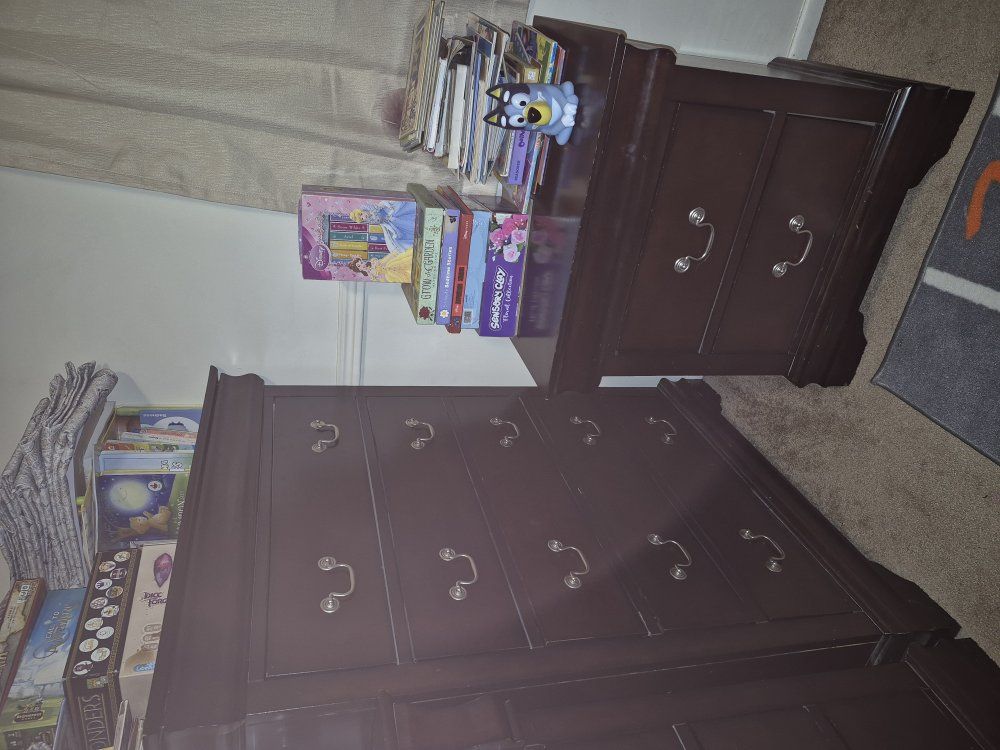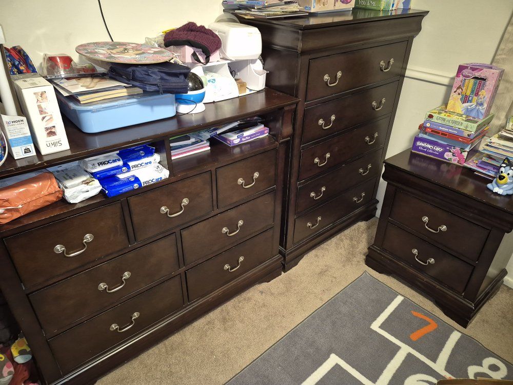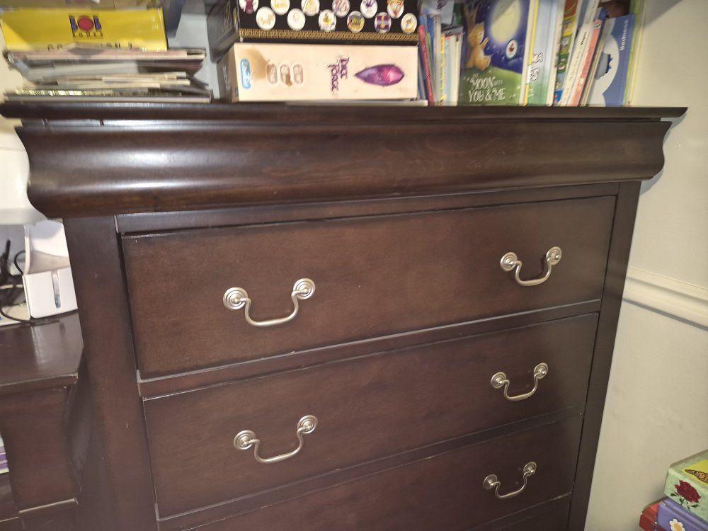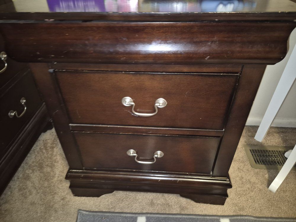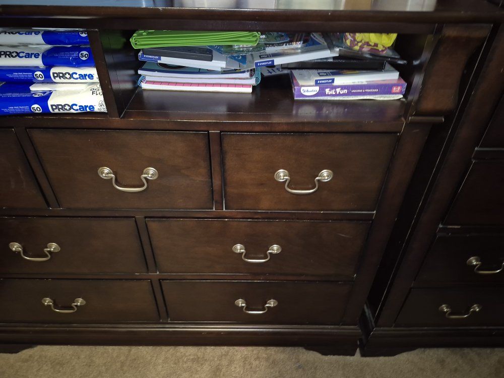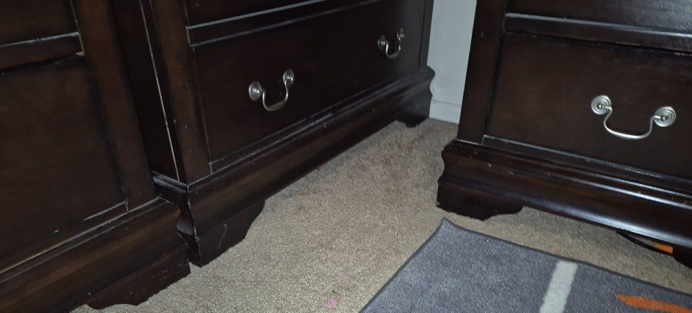 Minor scuffs, one drawer on the media chest has a broken slide rail-stop so it will come out if pulled all the way.