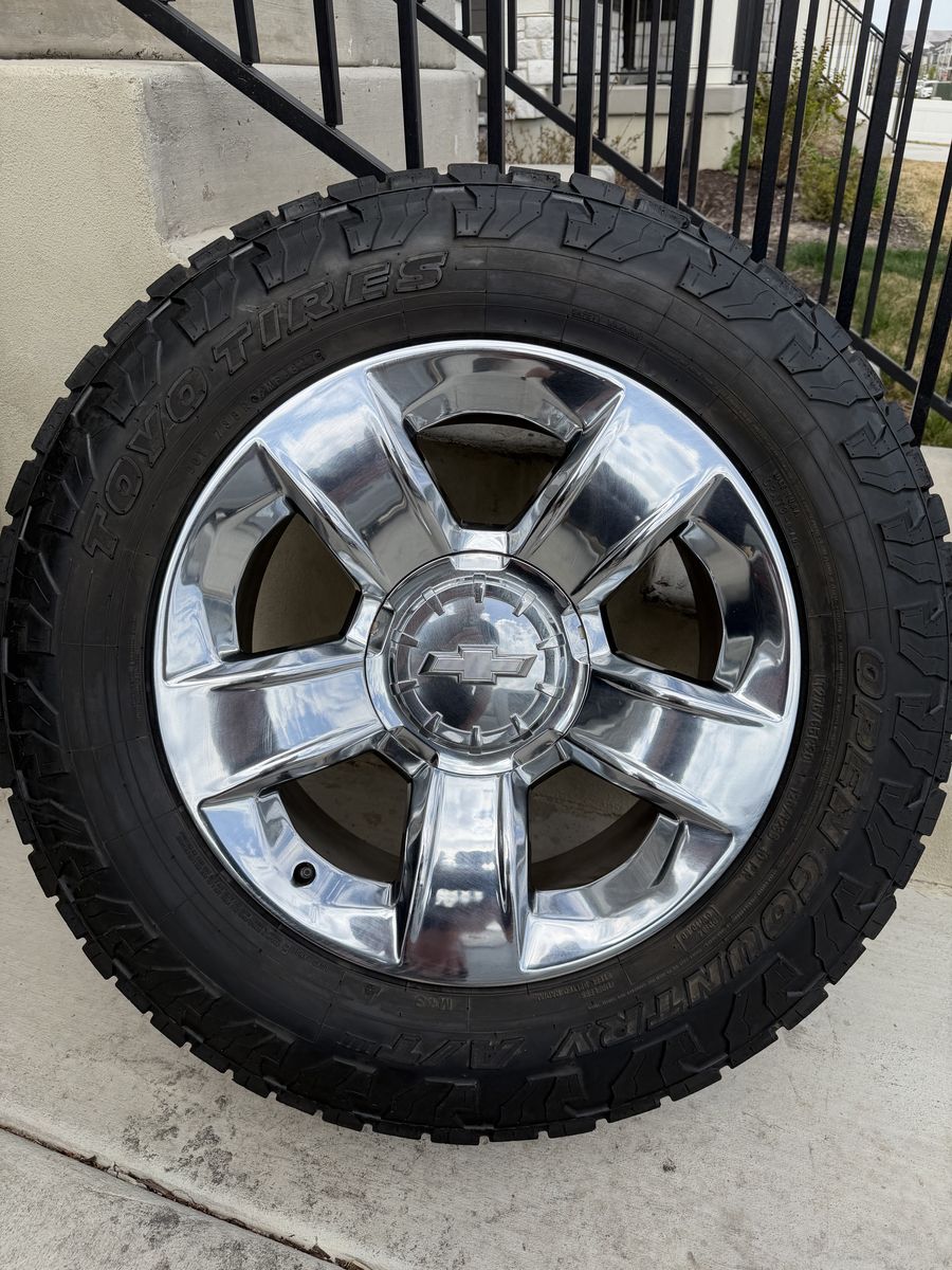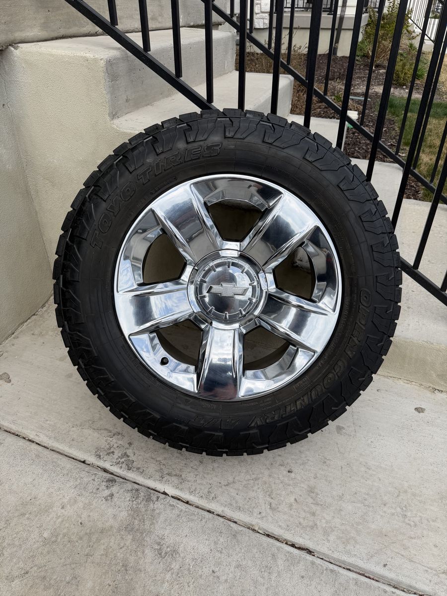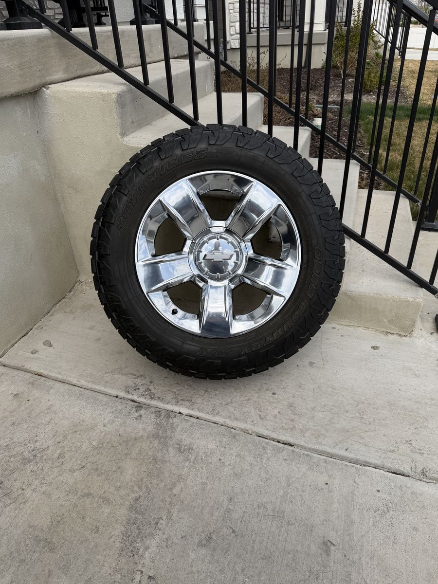 ApplePaySet of 4-Chevy Silverado 1500 Suburban Rims and Tires 275/65R20 Toyo AT3 in great condition,asking $1500 obo Tires have lots of tread left Rims are almost new no curb rash Comes with lug nuts or sensors I can sell the rims or tires separately Bolt pattern 6-5.5 or 6-139.7 They will fit Chevy Silverado Tahoe suburban avalanche GMC sierra Yukon Text anytime 385-402-2292