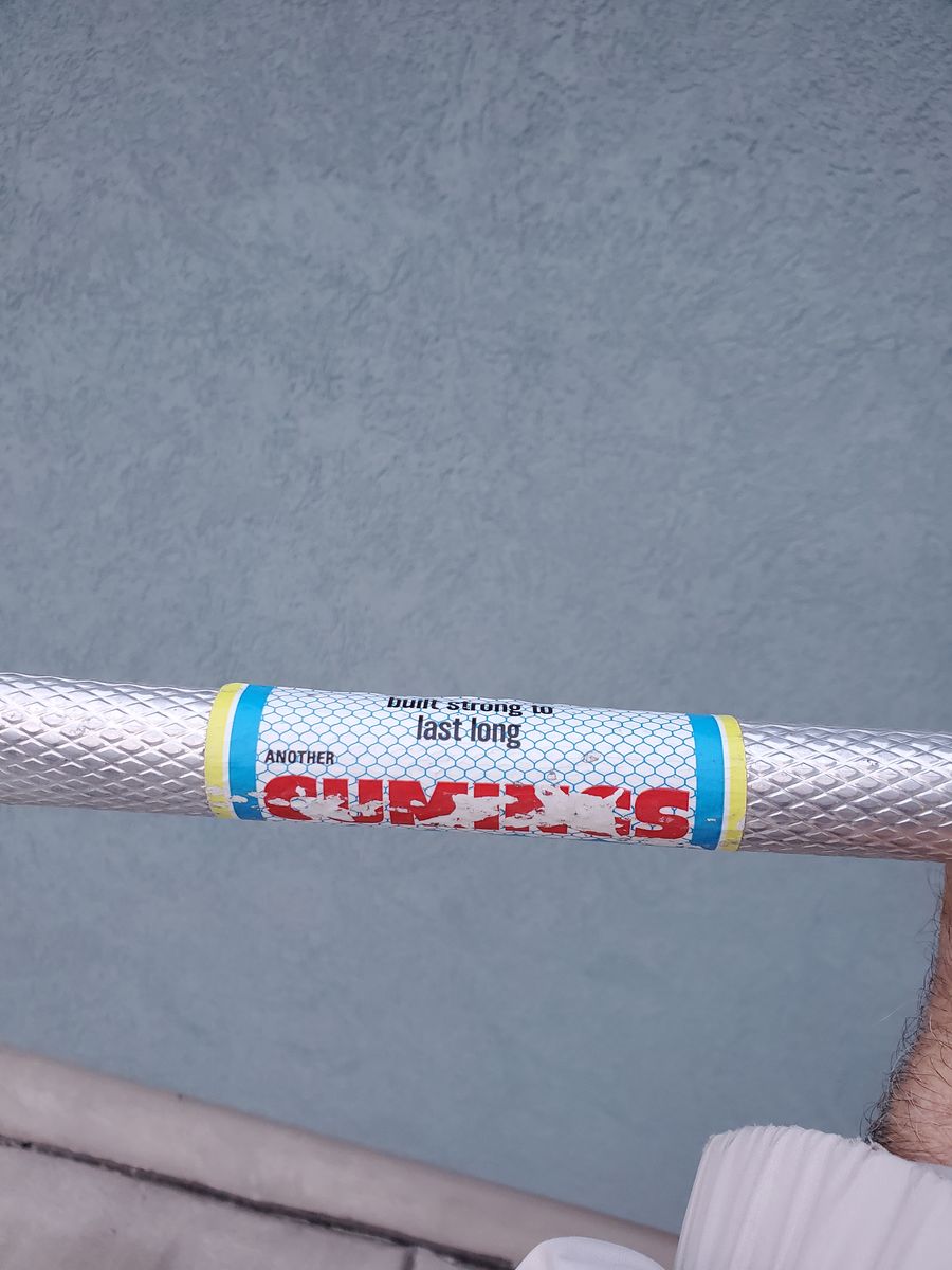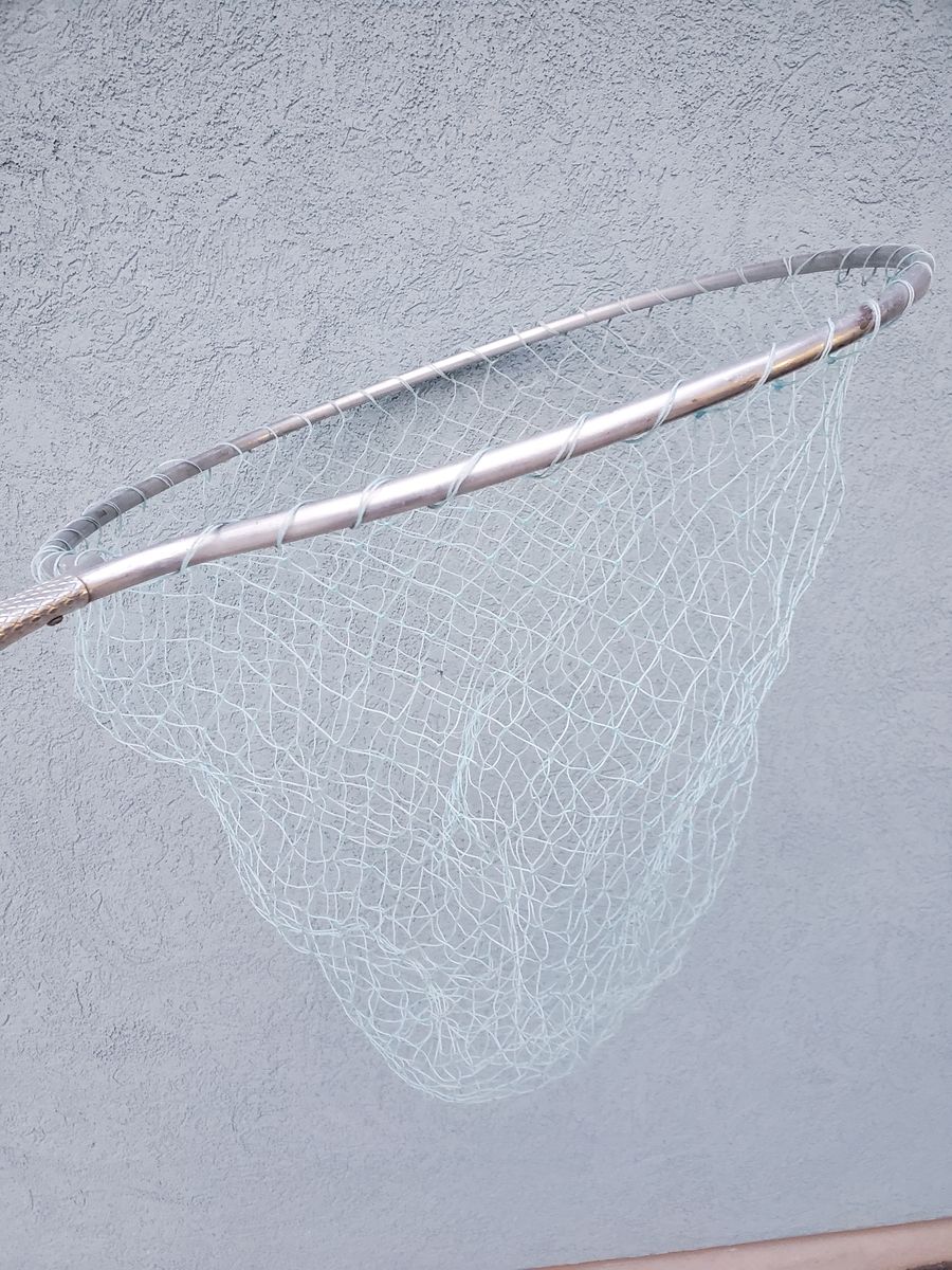 Used, but still works just fine. Aluminum handle is 3 feet long... net is 22 inches across... giving you almost a 5 foot reach.