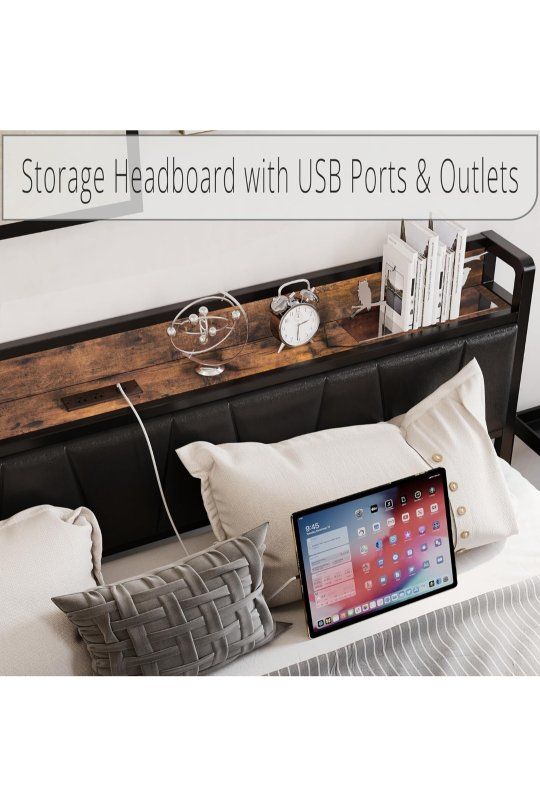 VenmoQueen Bed Frame, Storage Headboard with Charging Station, Solid and Stable, Noise Free, No Box Spring Needed, Easy Assembly (Vintage and Black) We used it for about a year and then switched to a king bed instead. Had an adjustable frame with it, so the slats were never installed. Pet friendly, smoke-free home. Pickup only please. Cash or venmo accepted.