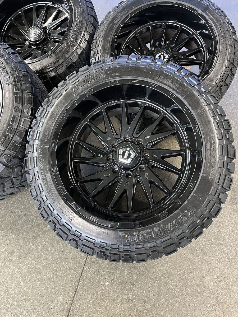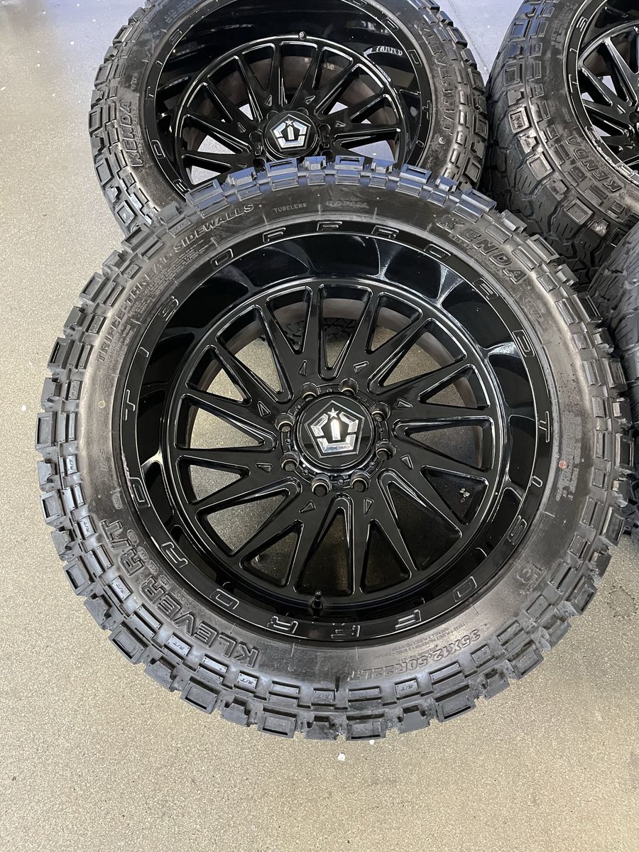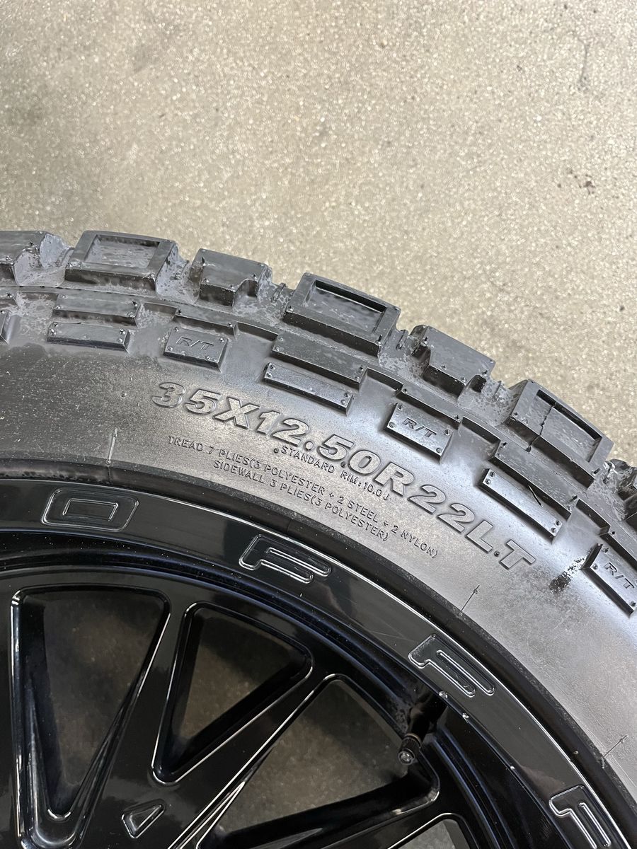 Wheels are 22x12 tis 547, -44 offset, wheels are in good overall shape, light curb rash, no major damage on them. All of the center caps are also included and in great shape! Super good looking wheels. Tires are 35x12.50r22 kenda kleaver r/t, 12ply, load range F, triple threat side walls. No patches or plugs in them, tires have about 60% tread life.