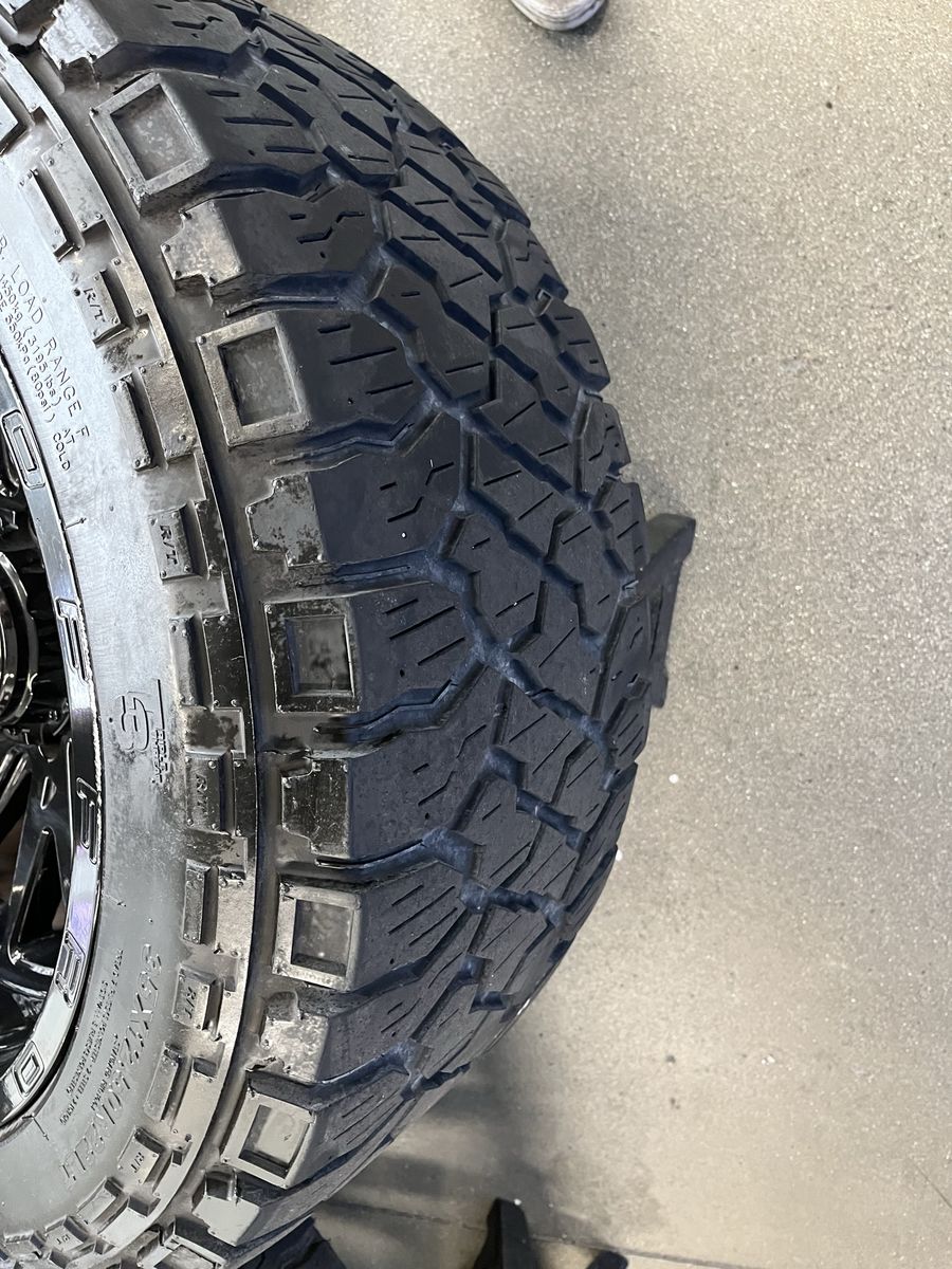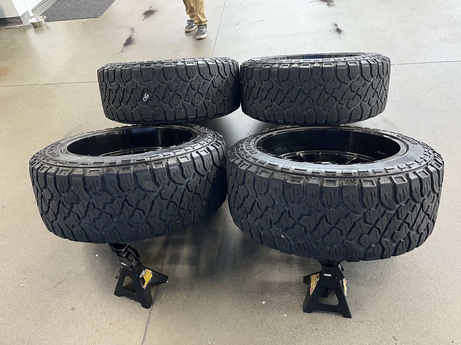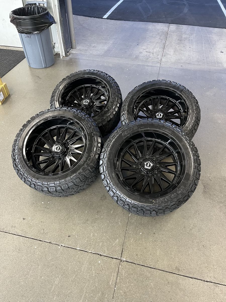 Wheels are 22x12 tis 547, -44 offset, wheels are in good overall shape, light curb rash, no major damage on them. All of the center caps are also included and in great shape! Super good looking wheels. Tires are 35x12.50r22 kenda kleaver r/t, 12ply, load range F, triple threat side walls. No patches or plugs in them, tires have about 60% tread life.