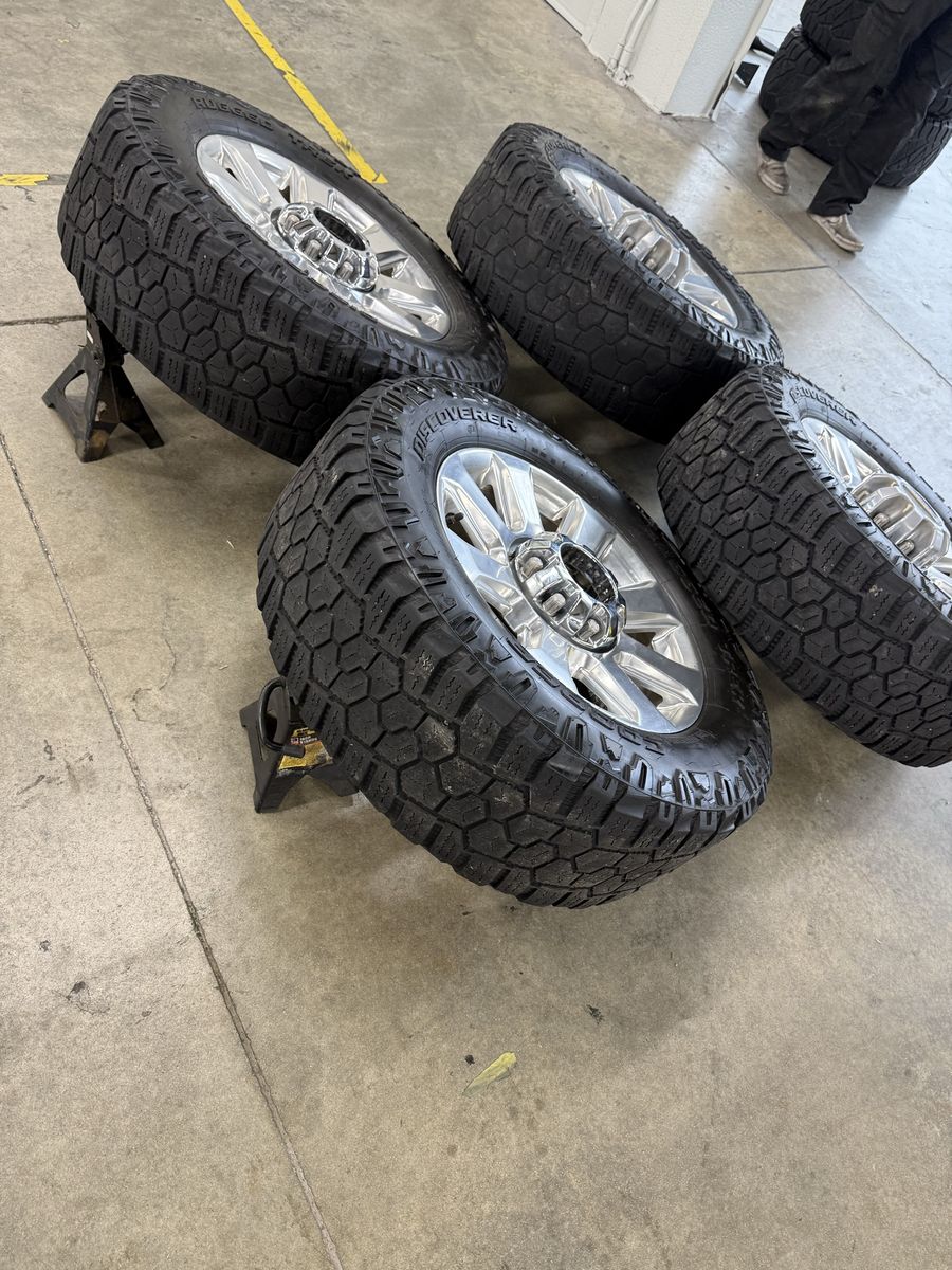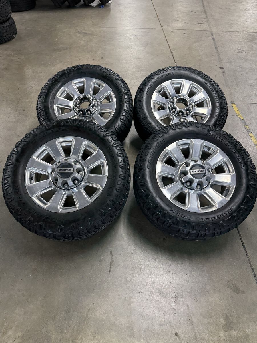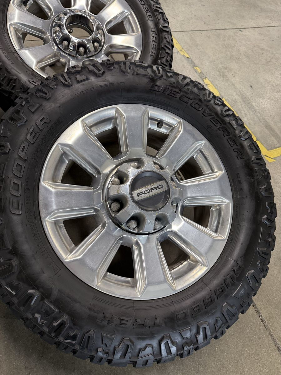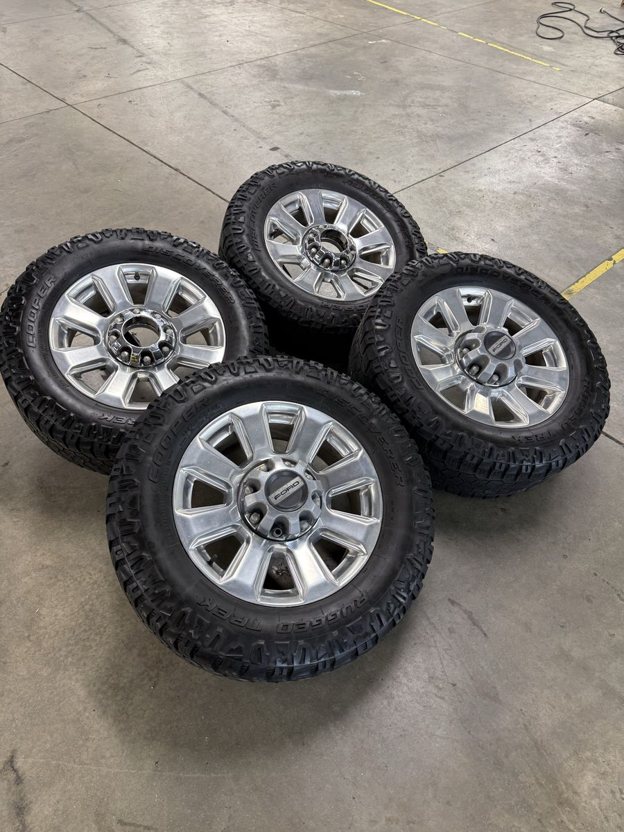 Wheels are 20in OEM wheels off a 2022 ford f350 platinum. Wheels are in good shape, no major damage, other then some average wear, wheels are in like new shape. All of the center caps and lugs are included. Tires are 275/65/20 cooper discovery all terrain, load range E, great riding tires. No patches or plugs, tires have decent tread left.