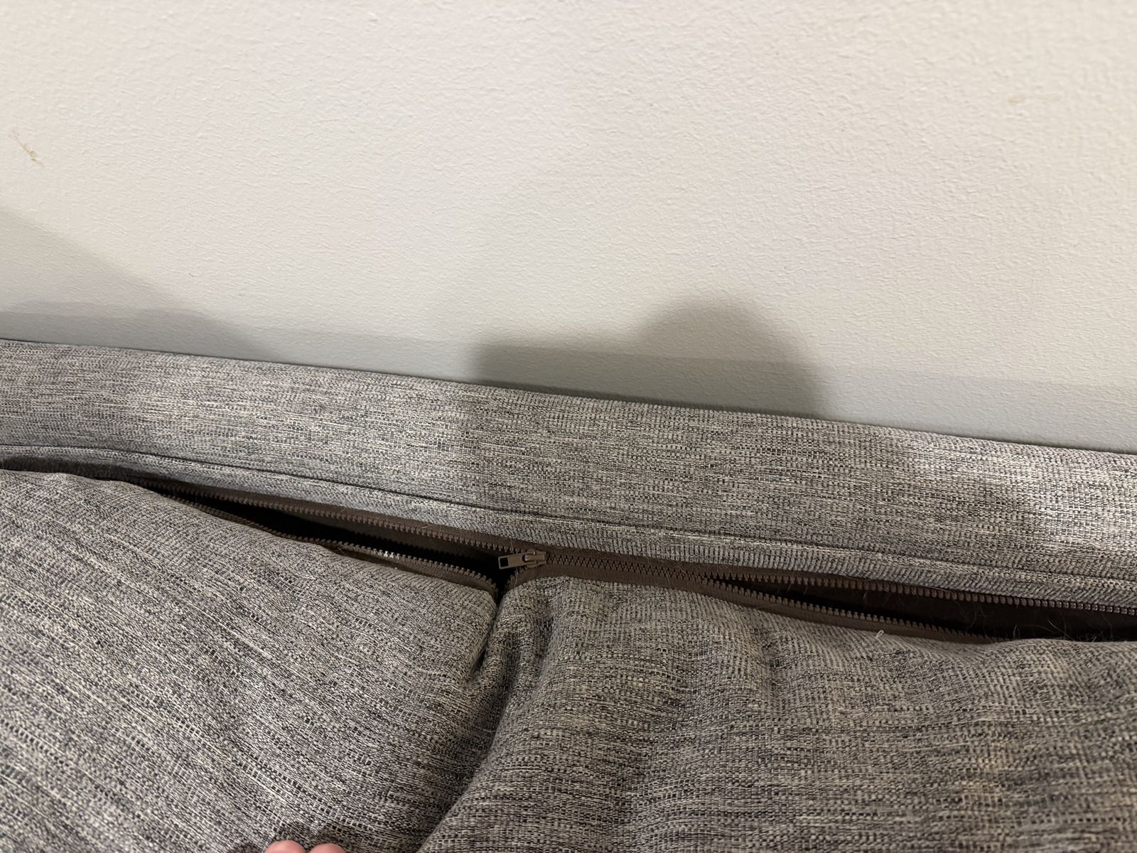 Comes apart into two pieces, includes the ottoman. Comes from a cat friendly home, but is very clean. No rips or tears. The only damage is a broken zipper on one of the removable cushions. The backs all detach and the covers come off for easy cleaning.