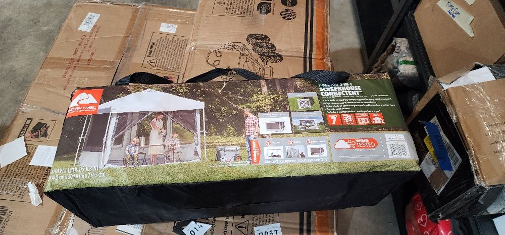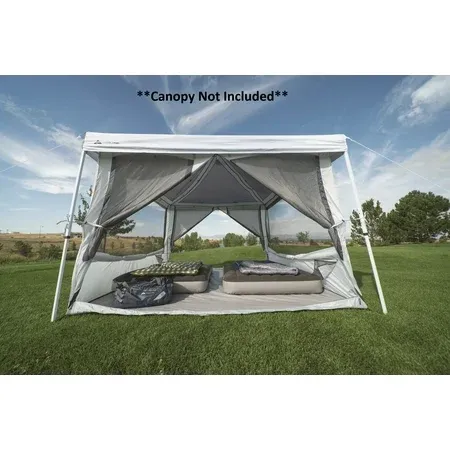 Ozark Trail 7 Person 2-in-1 Screen House Connect Tent with 2 Doors, Canopy Sold Separately: Features: Sleeps up to 7 people Spacious interior fits 2 queen size air beds Multipurpose 2-in-1 design can be used as a screen house or cabin tent Clip-in hanging design uses your 10 ft. x 10 ft. Straight-Leg Canopy (sold separately) as a frame for your screen house/tent Nine-foot center height provides cathedral ceilings for walk around room Large windows zip open to expose mesh walls and convert tent into a screen room The windows zip up to provide protection from rain and extra privacy for sleeping Contains a durable sewn-in floor Six oversized windows and mesh ceiling provide cross-ventilation while keeping the bugs out Front and rear doors make entrance and exit convenient Two large doors can be zipped closed to keep bugs out or conveniently rolled back and secured using the loop and toggle on each side of the door Versatile system can be used at camp, at home, or while tailgating Seam tape on lower walls for weather protection E-Port for convenient electrical cord access Movable hanging media pocket holds a tablet for group viewing Four convenient interior loops for hanging lanterns Contains hanging organizers and pockets for convenient storage of small, lightweight items Folds compactly for easy transport and storage Carry duffle makes repacking and storage easy Universal canopy accessory fits most 10 ft. x 10 ft. straight-leg canopies (Sold Separately) Dimensions/Weight: Floor Dimensions: 10 ft. x 10 ft. Center Height: 108 in. Floor Area: 100 sq. ft. Packed Size: 24.25 in. x 8.25 in. x 8.25 in. Carry Weight: 11.8 lbs. Specifications: Sleeping Capacity: 7 Body Fabric: Poly Taffeta 185T 600mm Floor Fabric: Polyethylene Mesh Fabric: Polyester 68D Carry Bag Fabric: Poly Oxford 210D Frame: Not included. Clips into your canopy (canopy sold separately) Seam Tape Location: Lower walls Number of Seasons: 3 Number of Rooms: 1 Number of Doors: 2 Number of Windows: 6 Number of E-Ports: 1 Number of Media Pockets: 1 Number of 4-Section Pockets: 2 Number of Lantern Loops: 4 Number of Steel Stakes: 4 Tent Set-Up System: Hangs inside 10' x 10' Straight-Leg Canopy Frame **Sold Separately** Average Set-Up Time for 2 people: 10 minutes once canopy is set-up Model No.: W2027