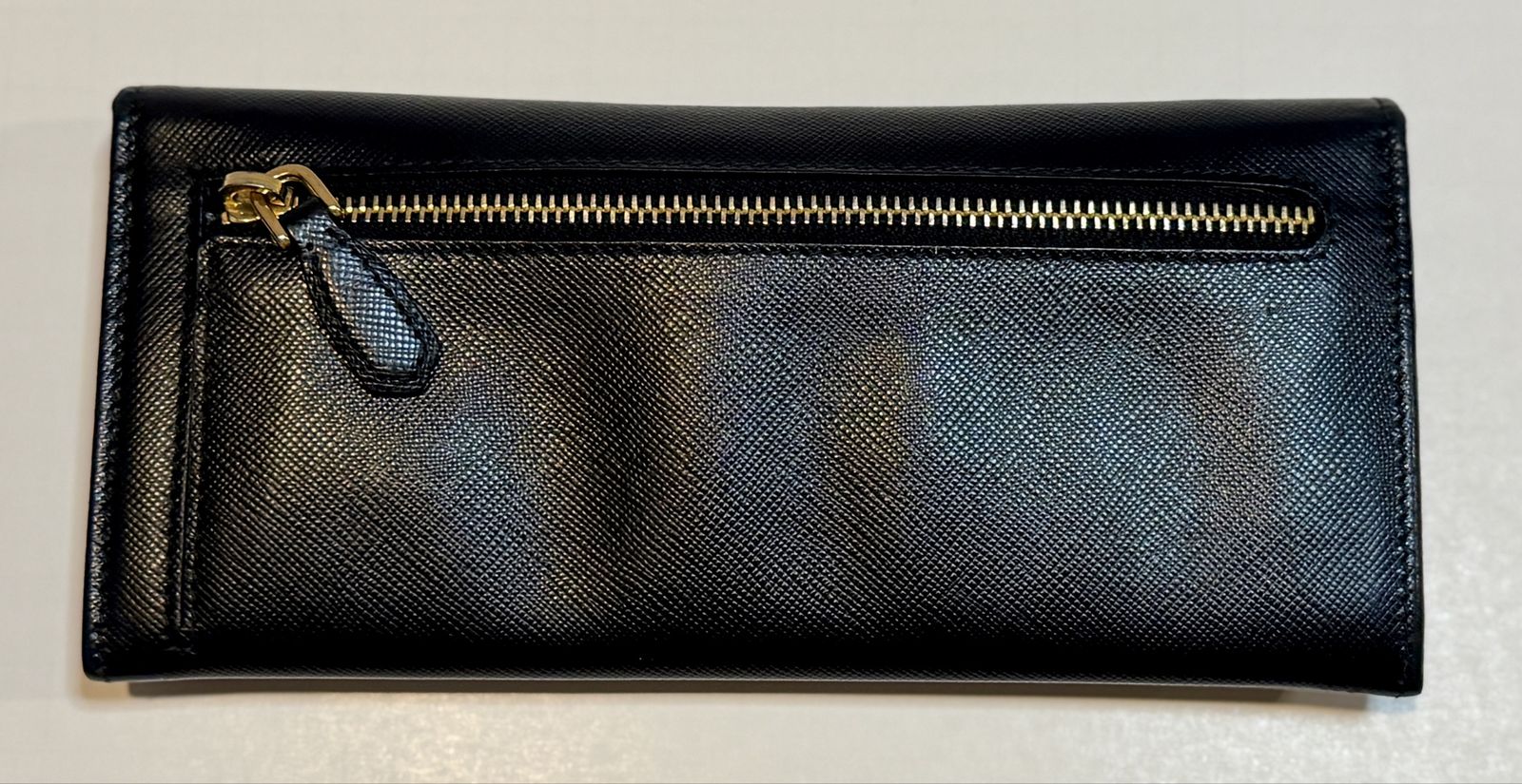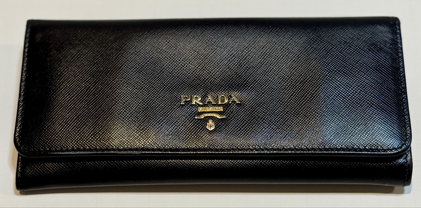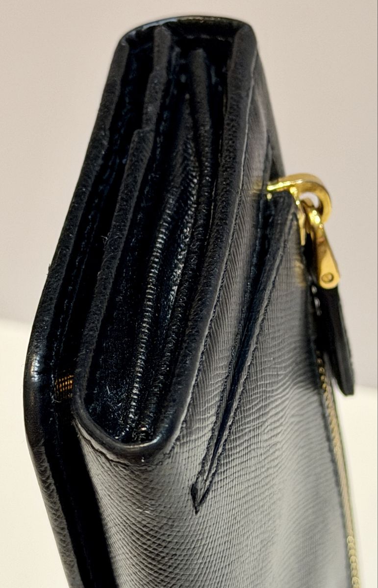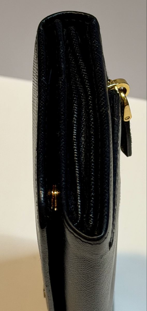 Authentic Prada black Saffiano leather wallet/clutch with gold Prada Milano logo and zip coin pocket.